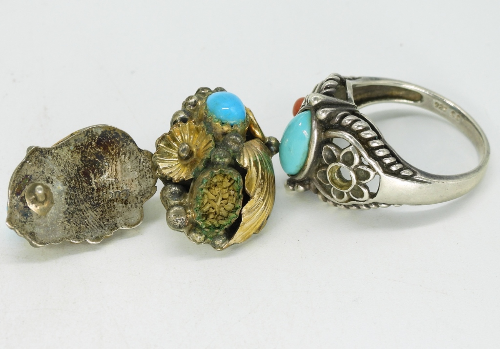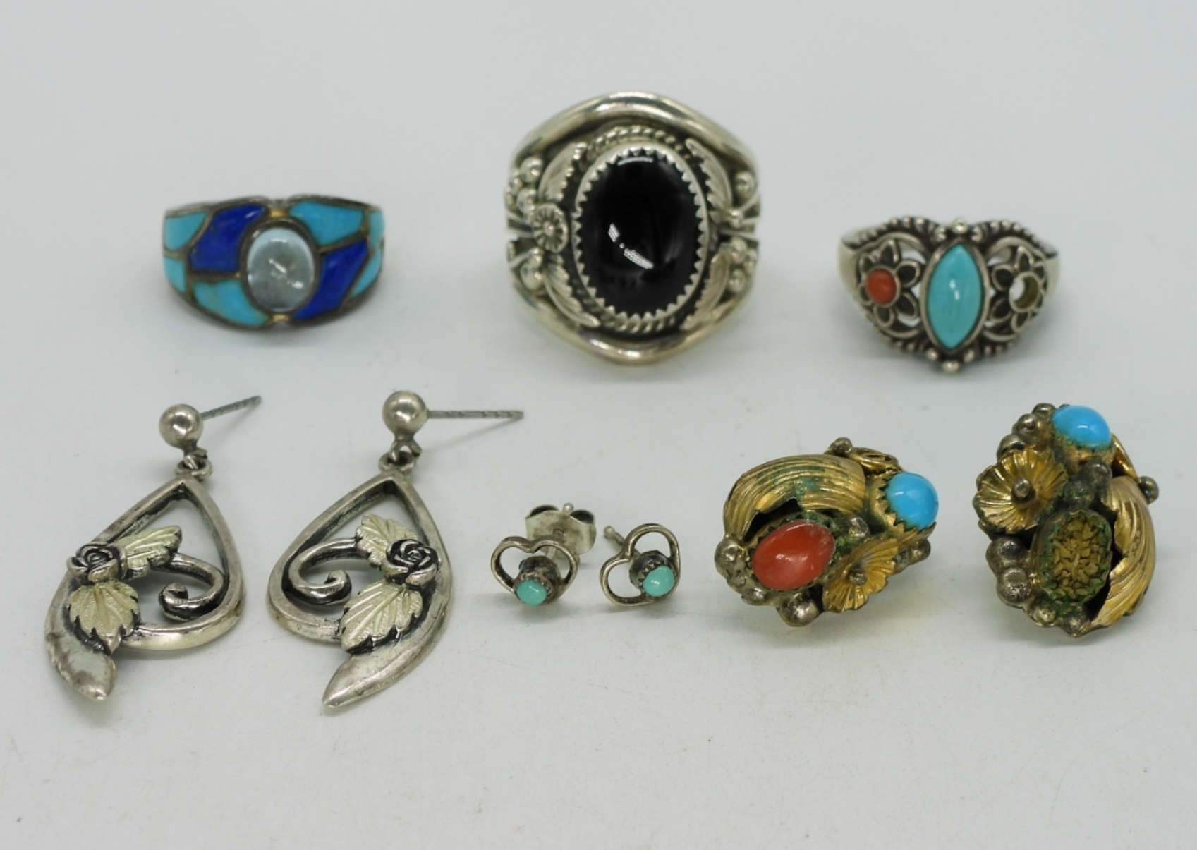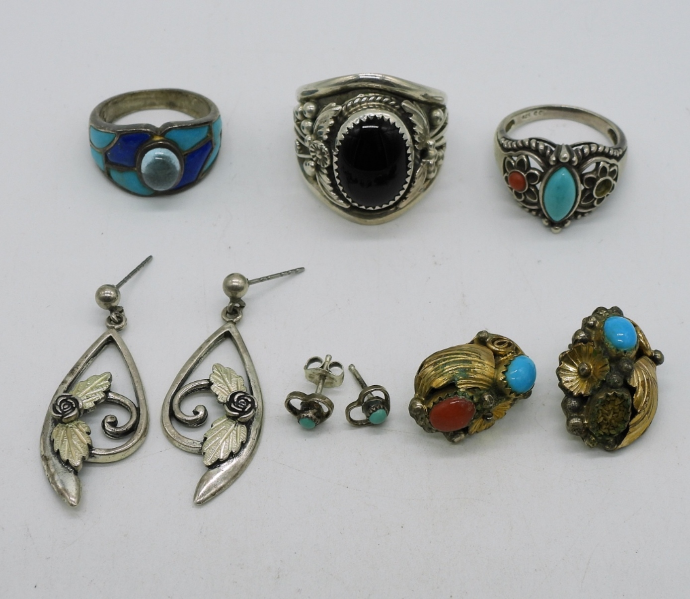 3 Sterling rings, black onyx and turquoise, one ring missing a stone. Sizes 6.5-11. Three pair of sterling pierced earrings. (23 dwt)