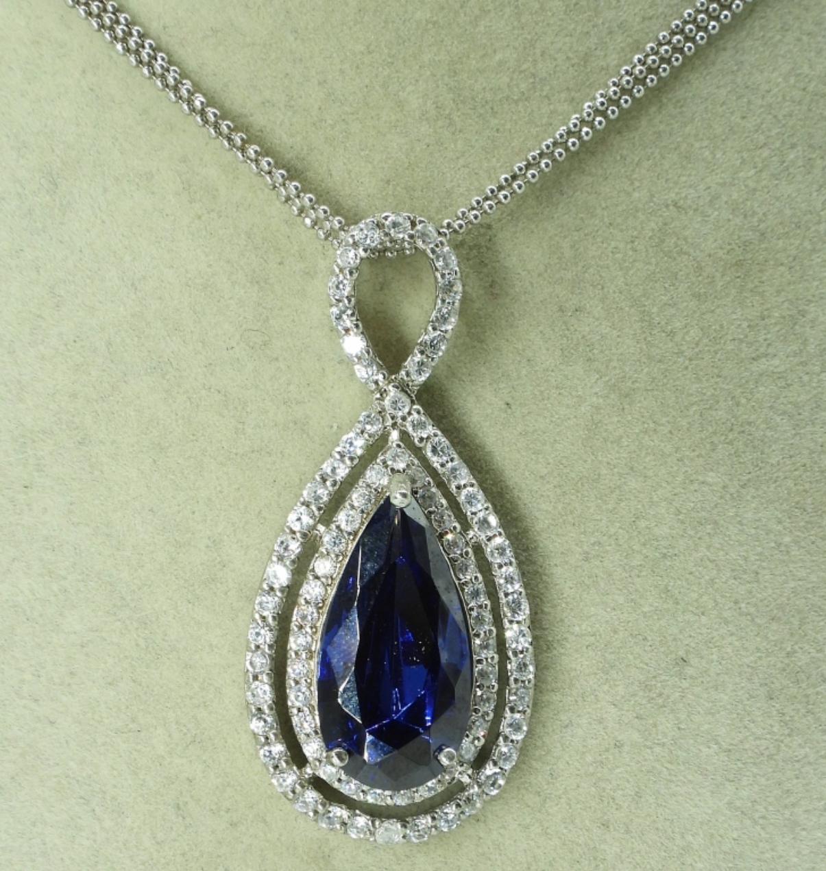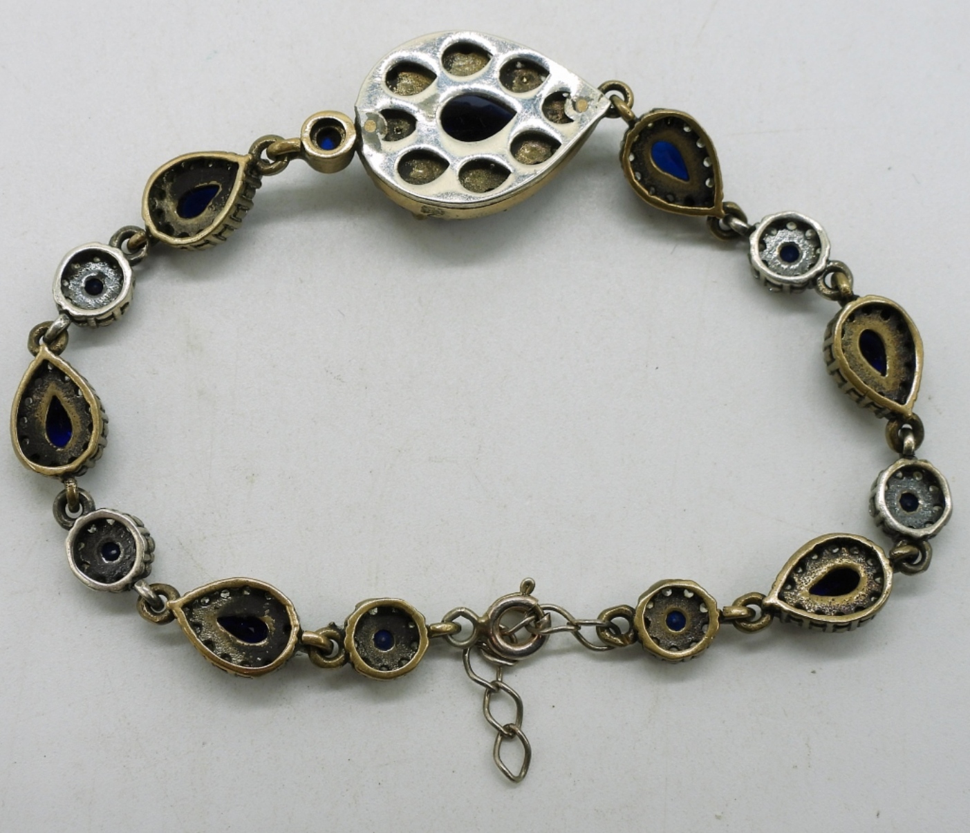 Simulated sapphire sterling necklace and bracelet. Necklace is 18″. Bracelet is 7-8″ adjustable. (15.8 dwt)