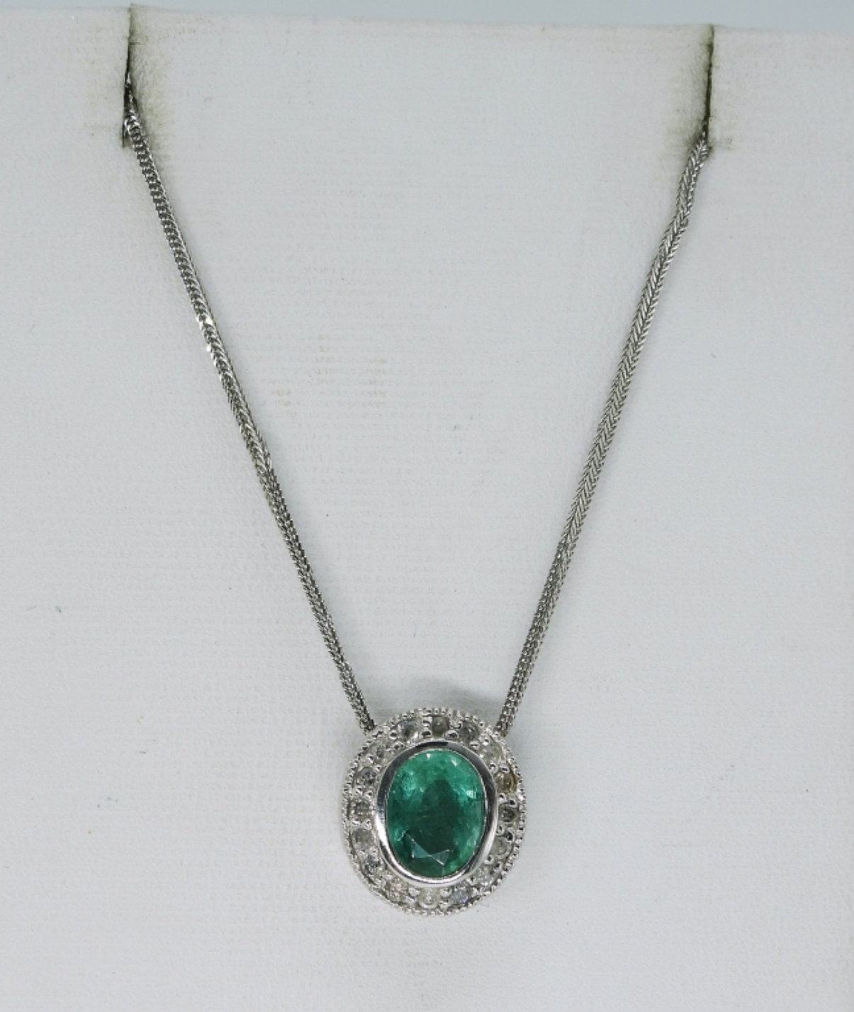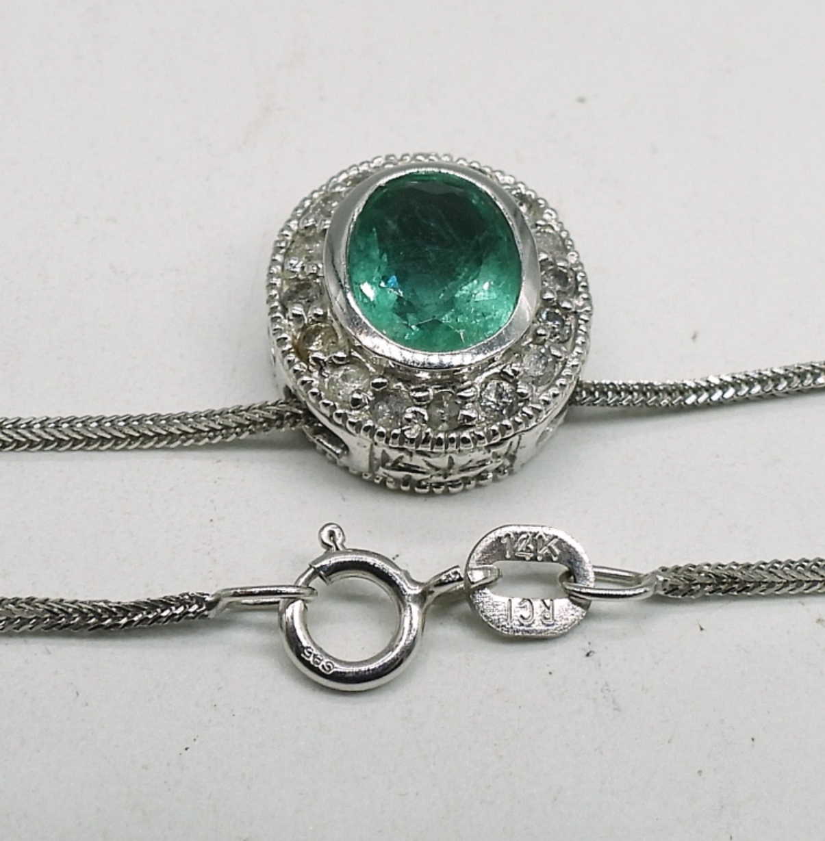 14k white gold chain and pendant with center emerald and side diamonds. Chain is 16″. (2.6 dwt)