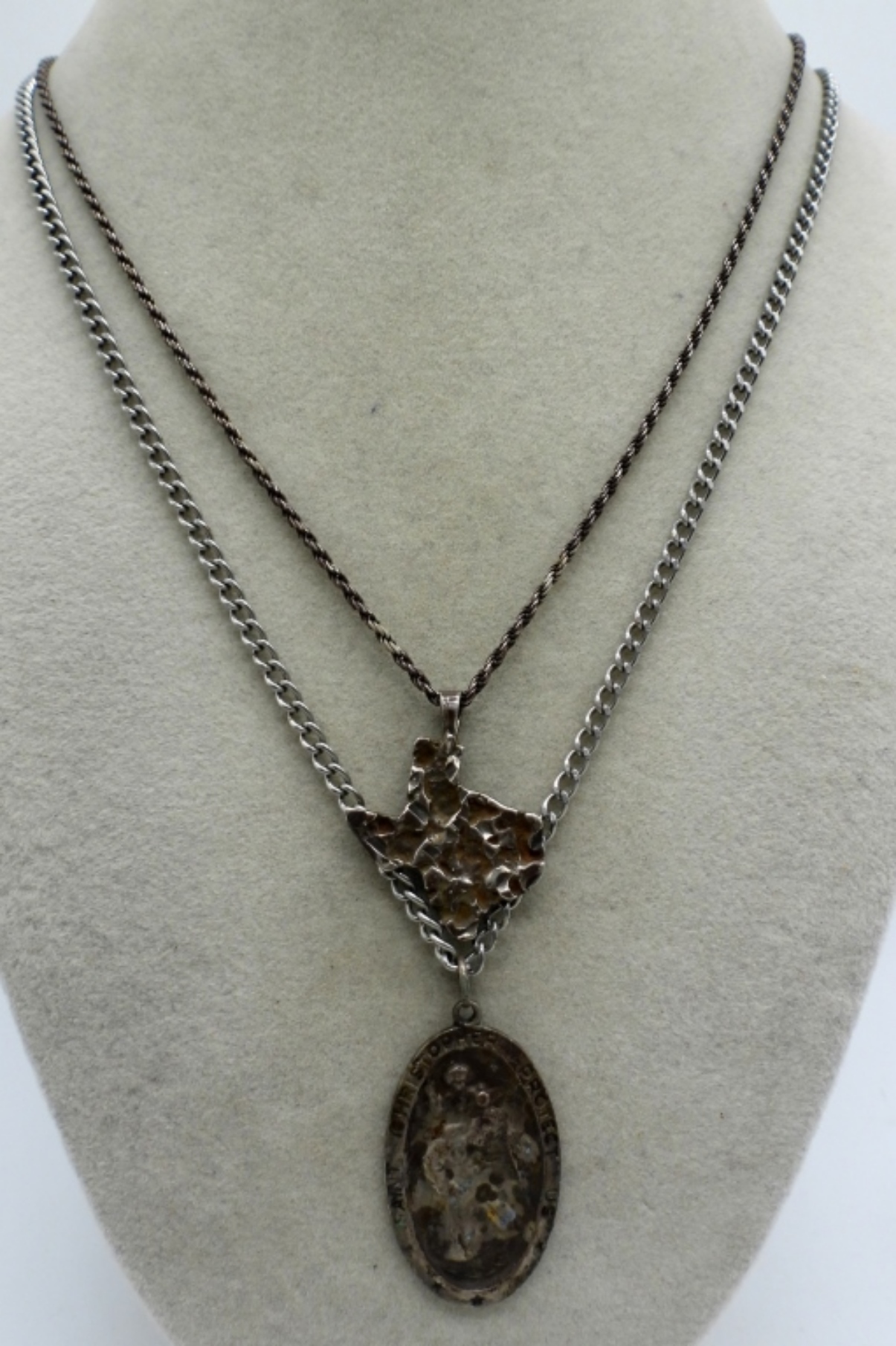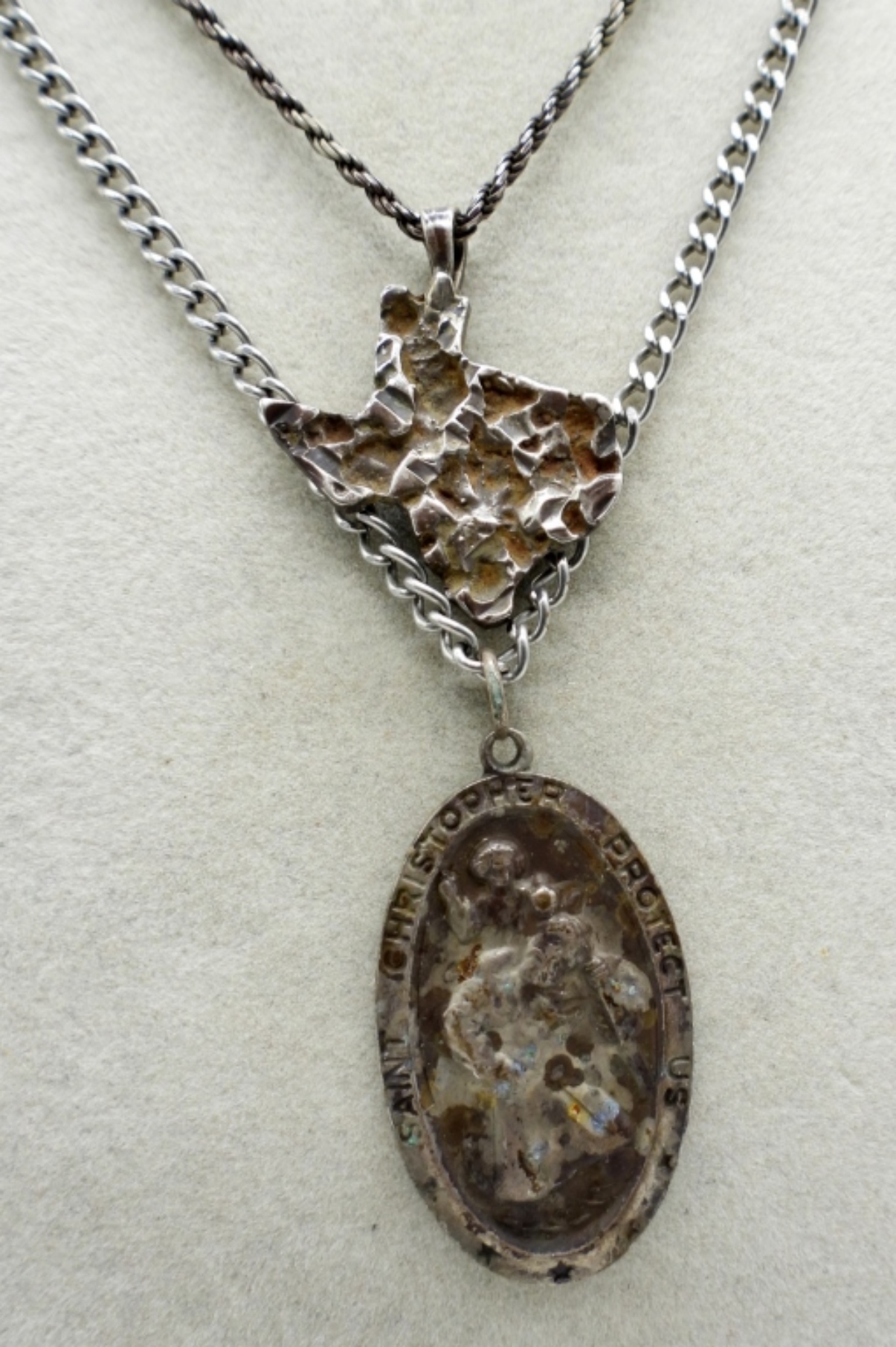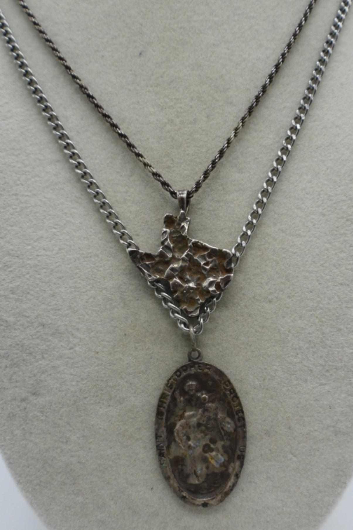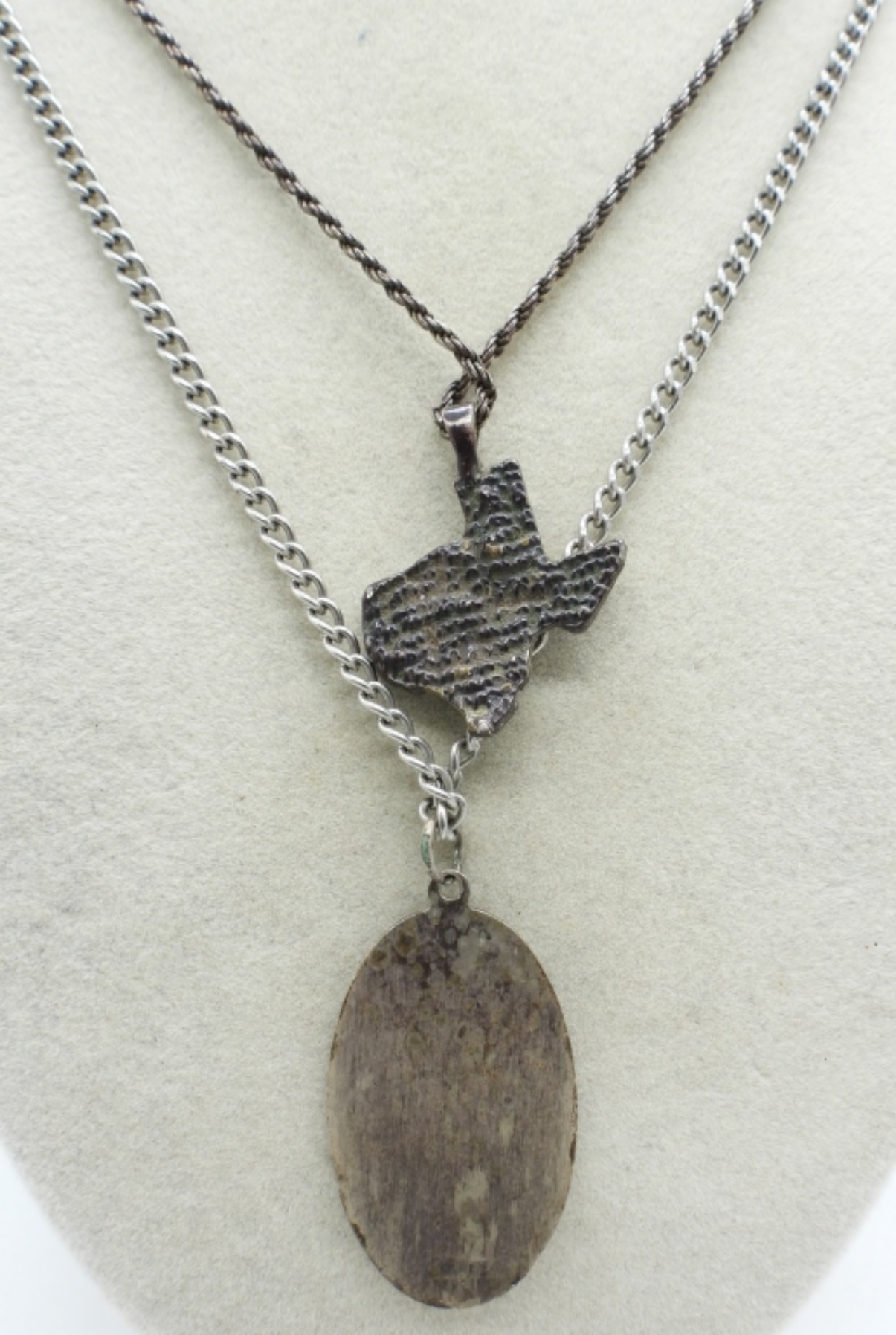Two sterling necklaces. Religious Pendant and a Texas pendant. Tarnished -Need a good cleaning. 20″ & 24″. (16.5 DWT)