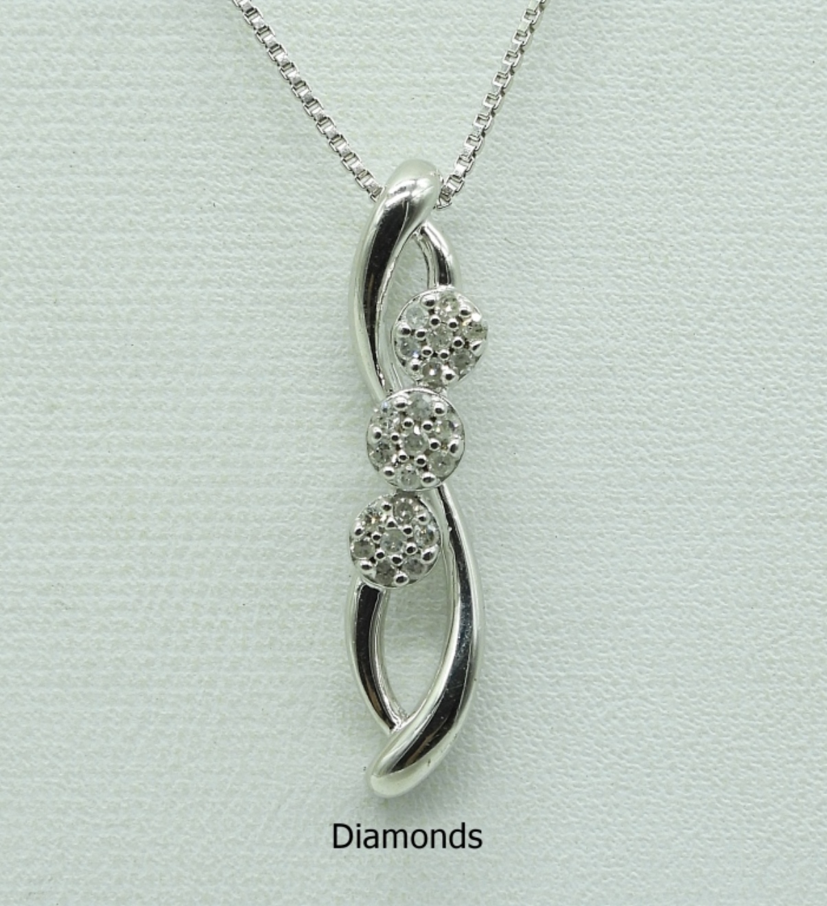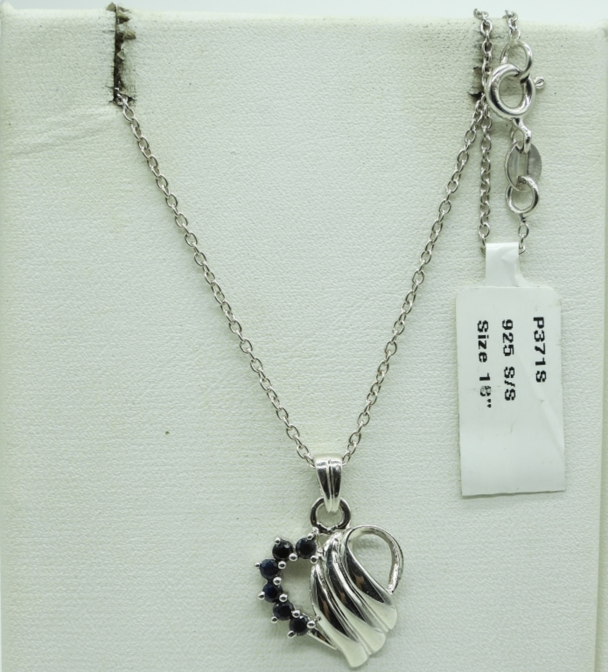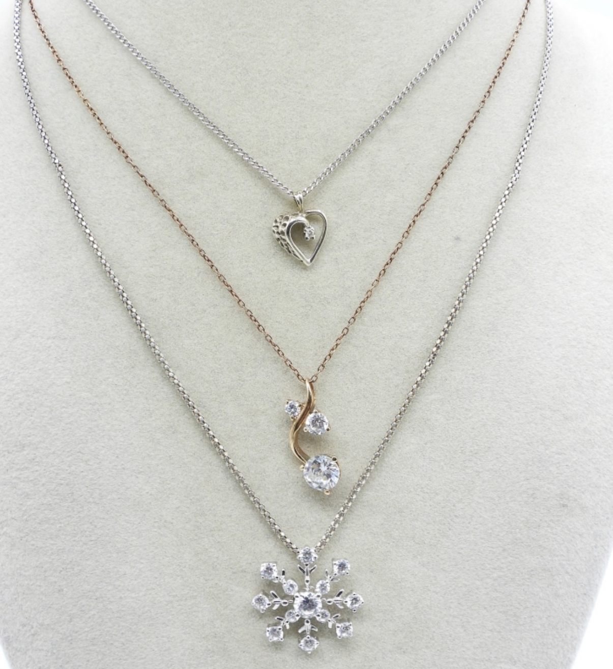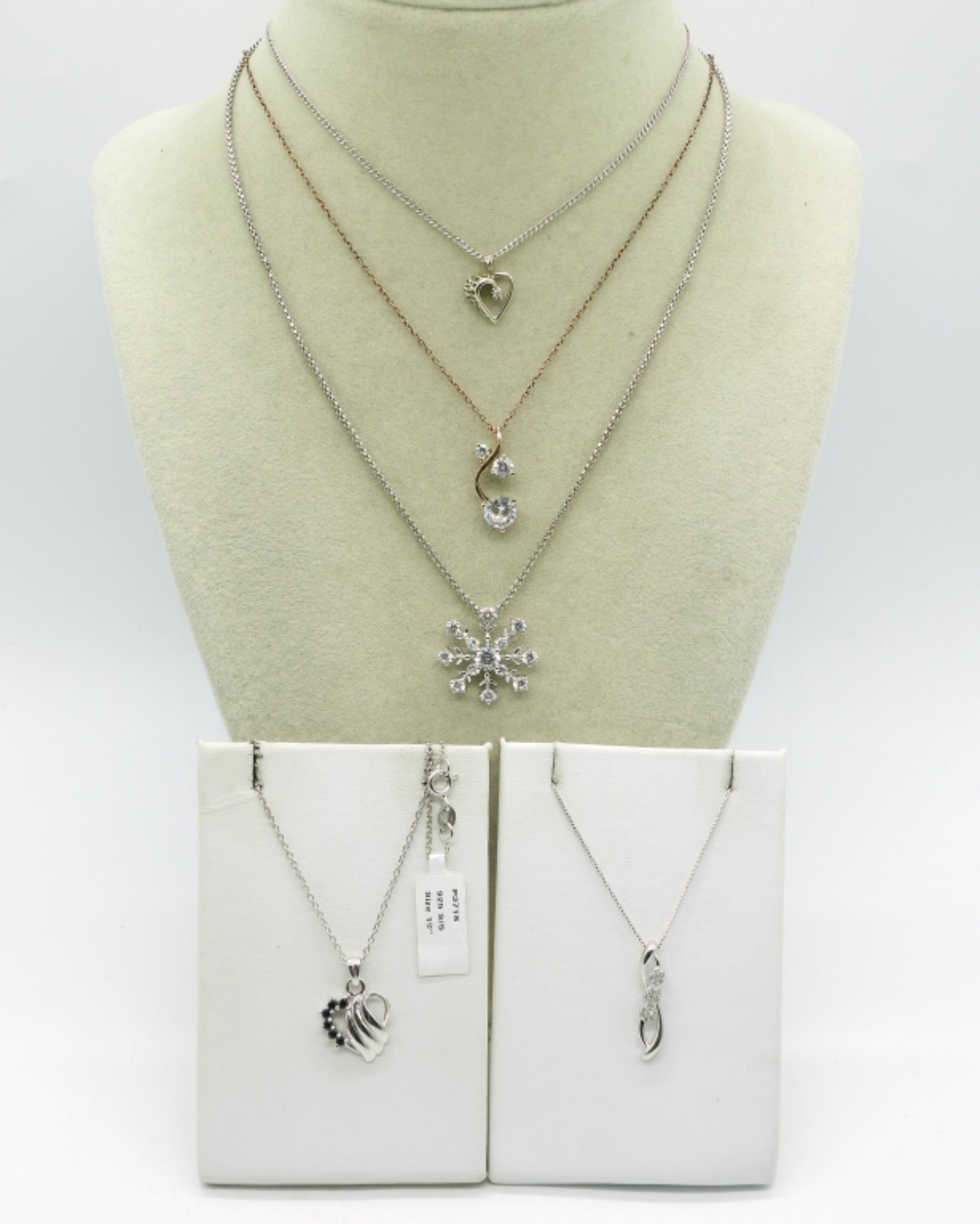 Five sterling necklaces. Four with simulated diamonds & dark sapphire gemstones. One with tiny genuine diamonds. Chain lengths are 16-18″. (10 dwt)