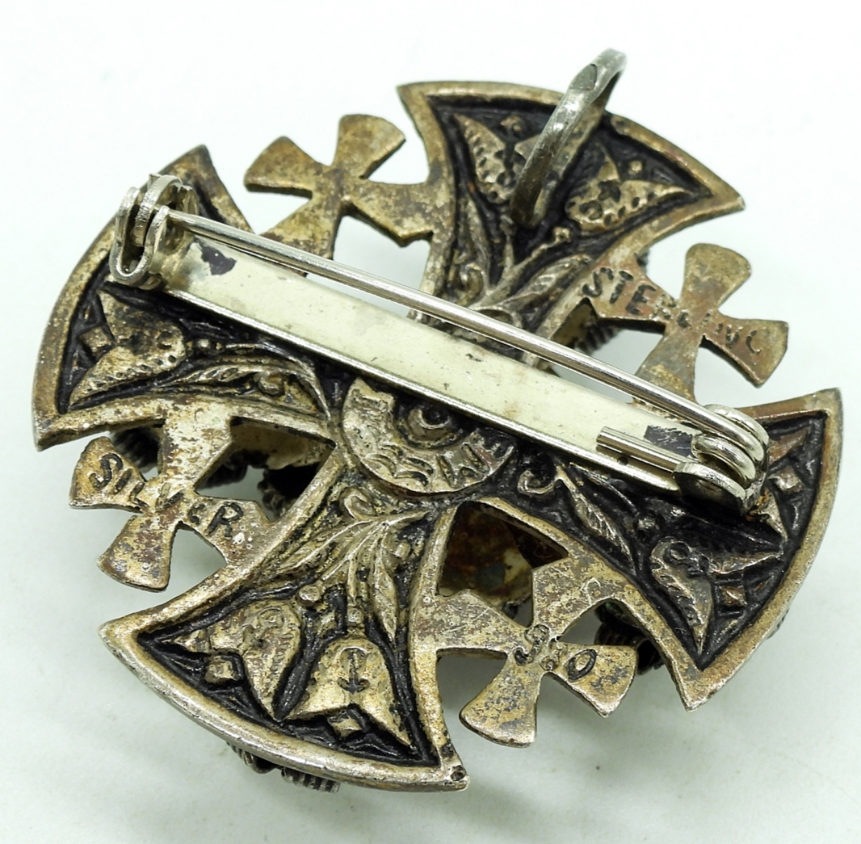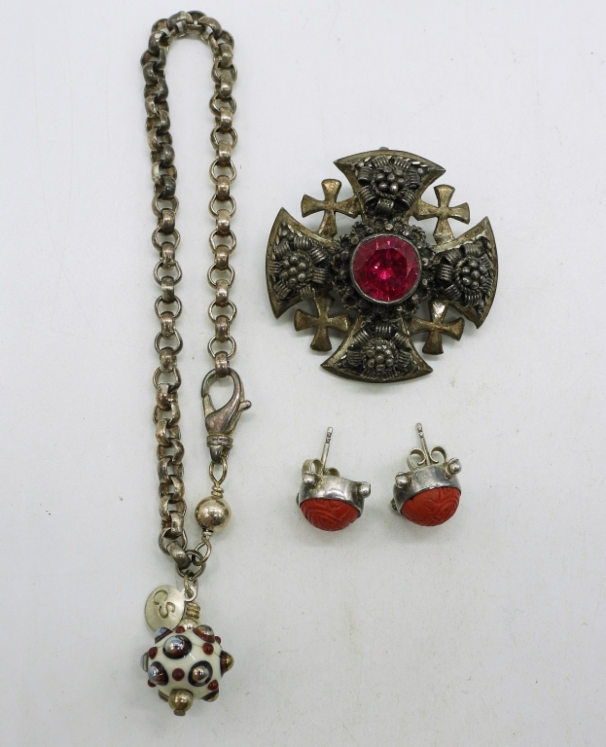 Jerusalem Cross, 980 silver, 1.5″. Cute sterling bracelet with glass bead, 8″. Sajen red carved earrings, pierced. (26 dwt)