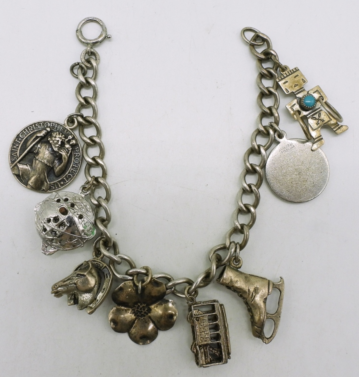 Vintage sterling charm bracelet with 8 charms. 7.5″. (27 dwt)