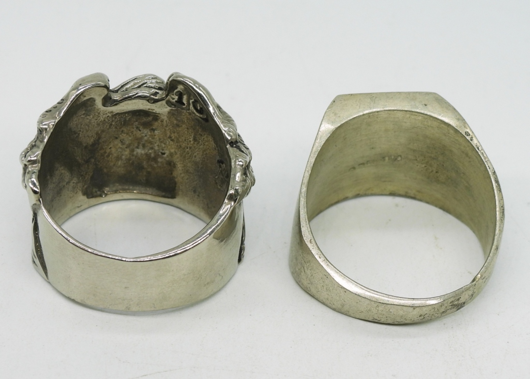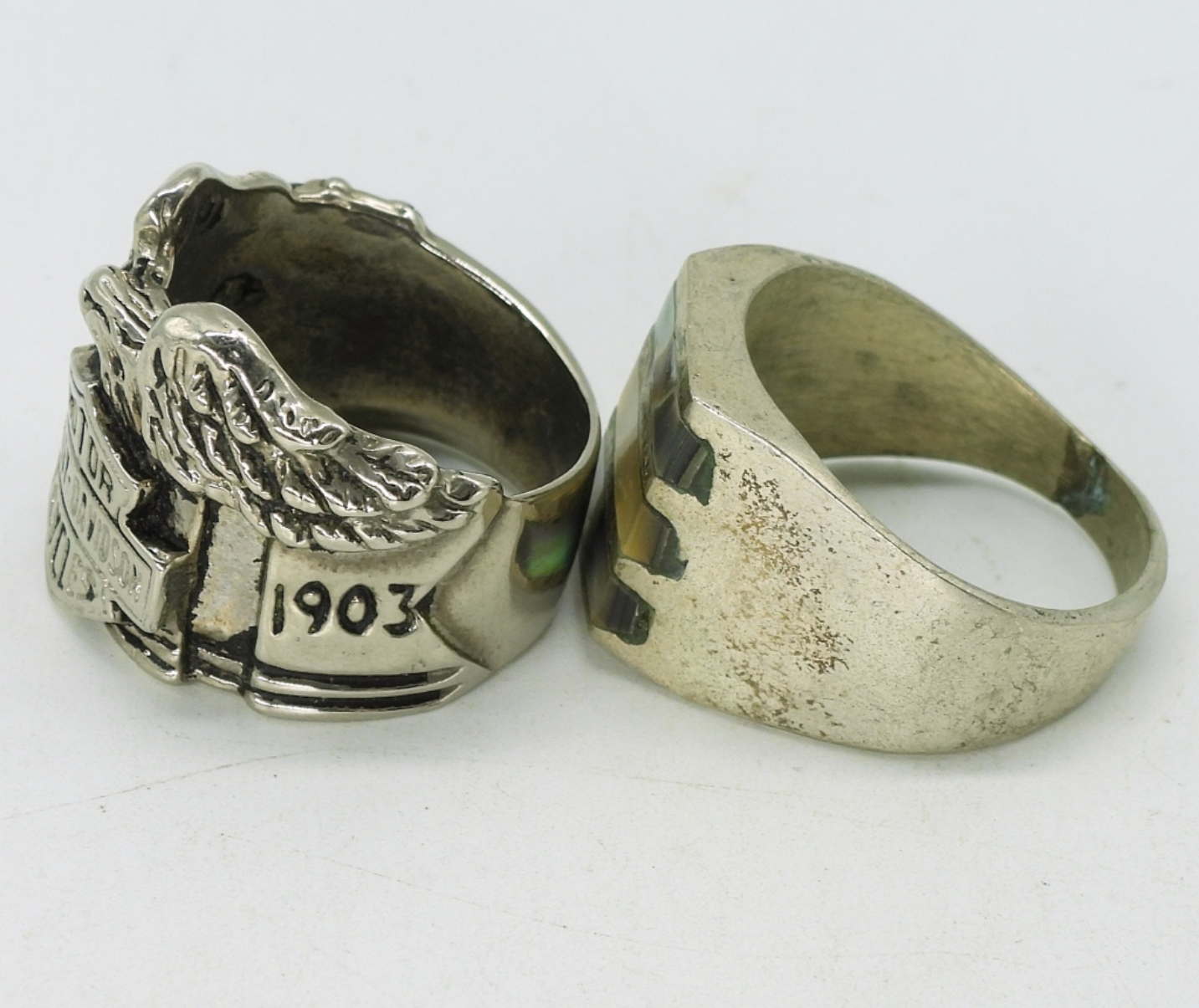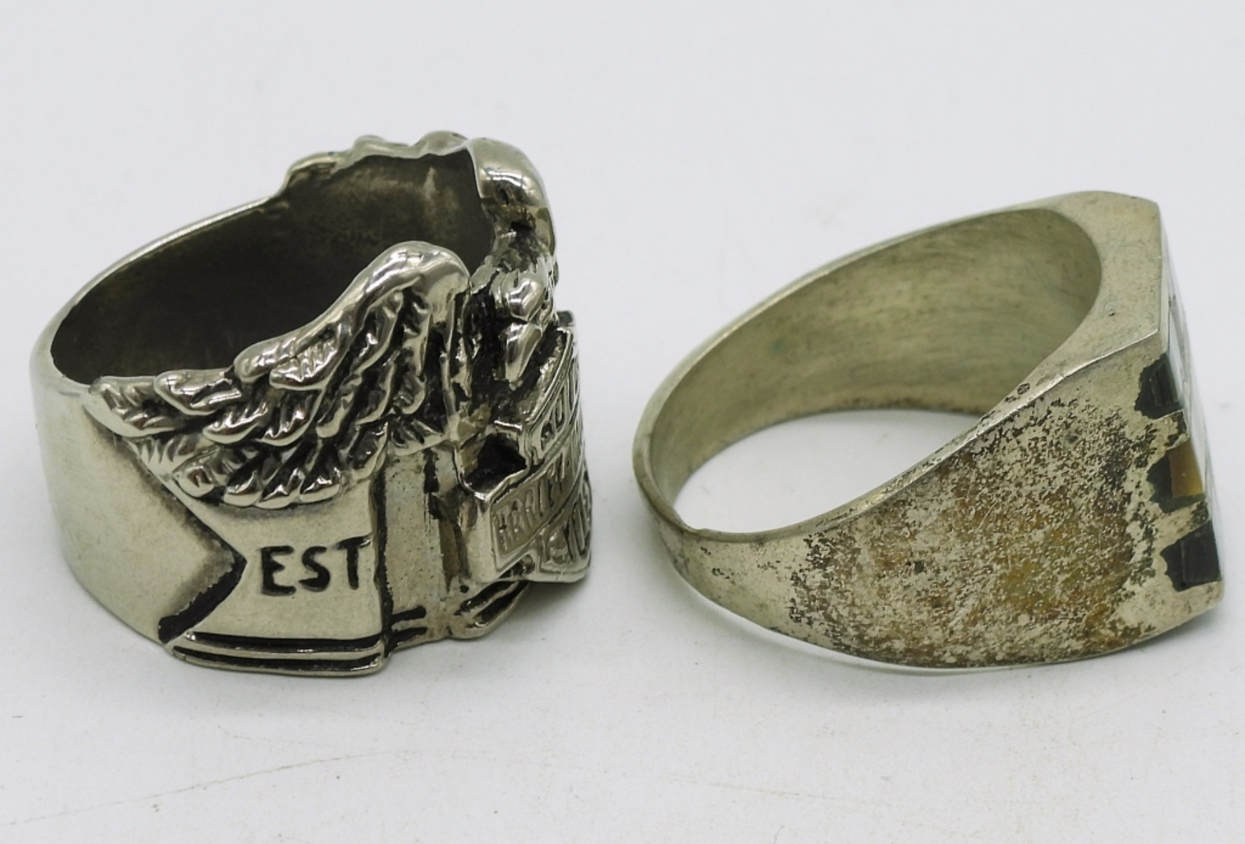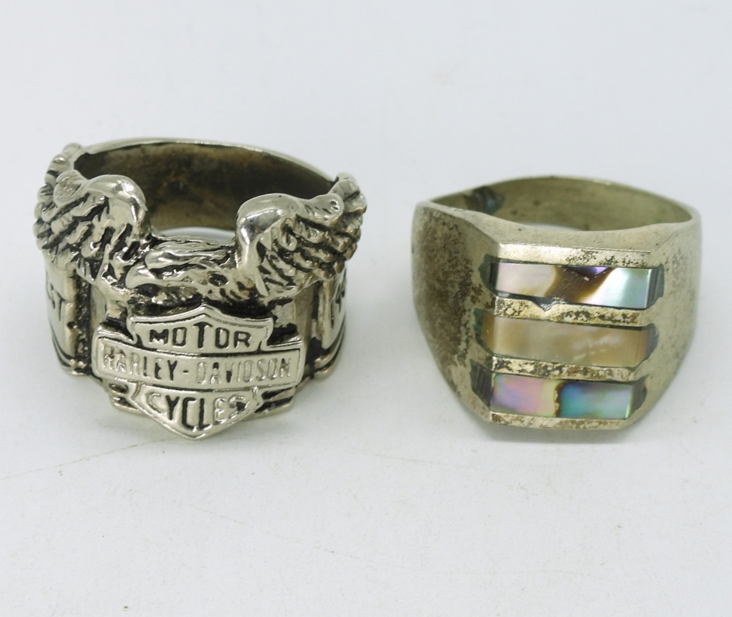 Sterling Harley Davidson ring, size 10. Mexico sterling abalone inlay ring, size 11. (15.6 dwt)