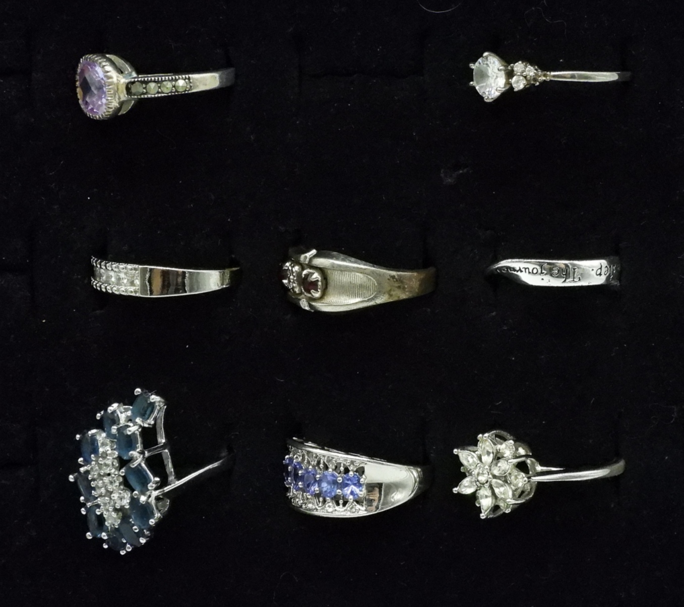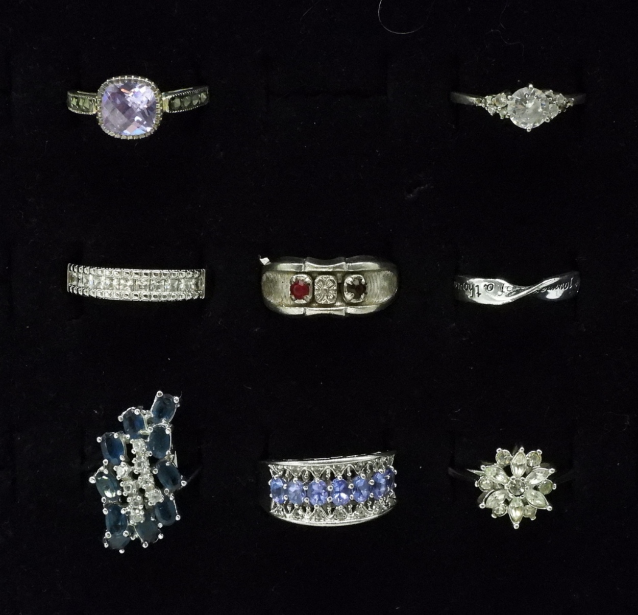 8 sterling fashion gemstone rings. Sizes 7 – 9.5. (19.8 dwt)