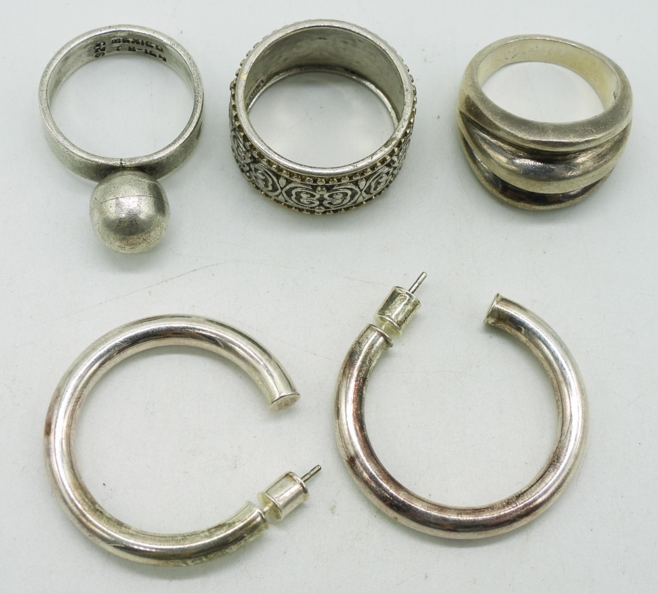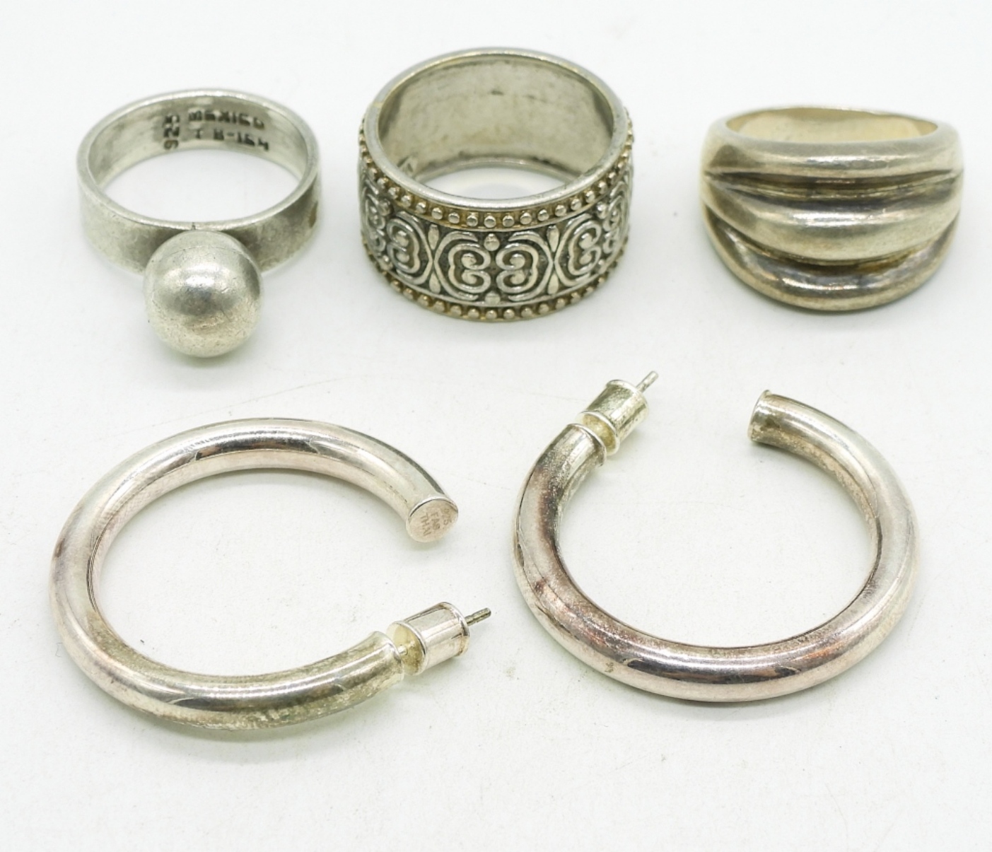 Taxco “TB-164” ring with ball topper, size 8. Two other sterling rings, sizes 7 & 9. Pierced sterling hoop earrings. (20.3 dwt)