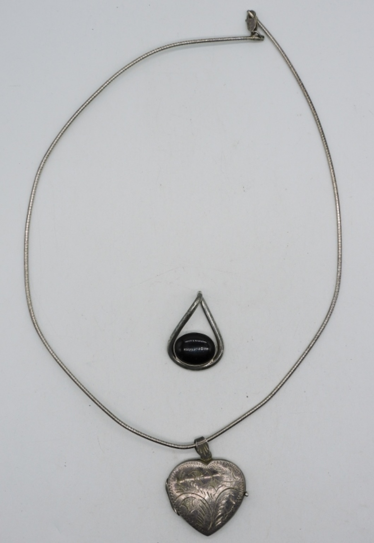 One sterling heart locket necklace, 18″ and black onyx pendant. (17 dwt)