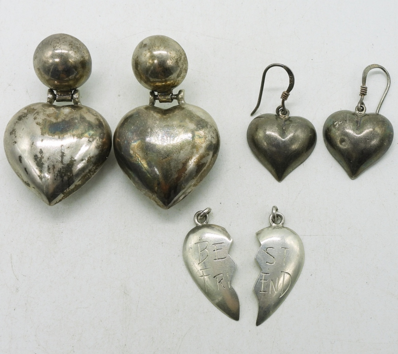 Two pair of sterling heart shaped pierced earrings. Two sterling pendants “Best Friends”. (16.9 dwt)