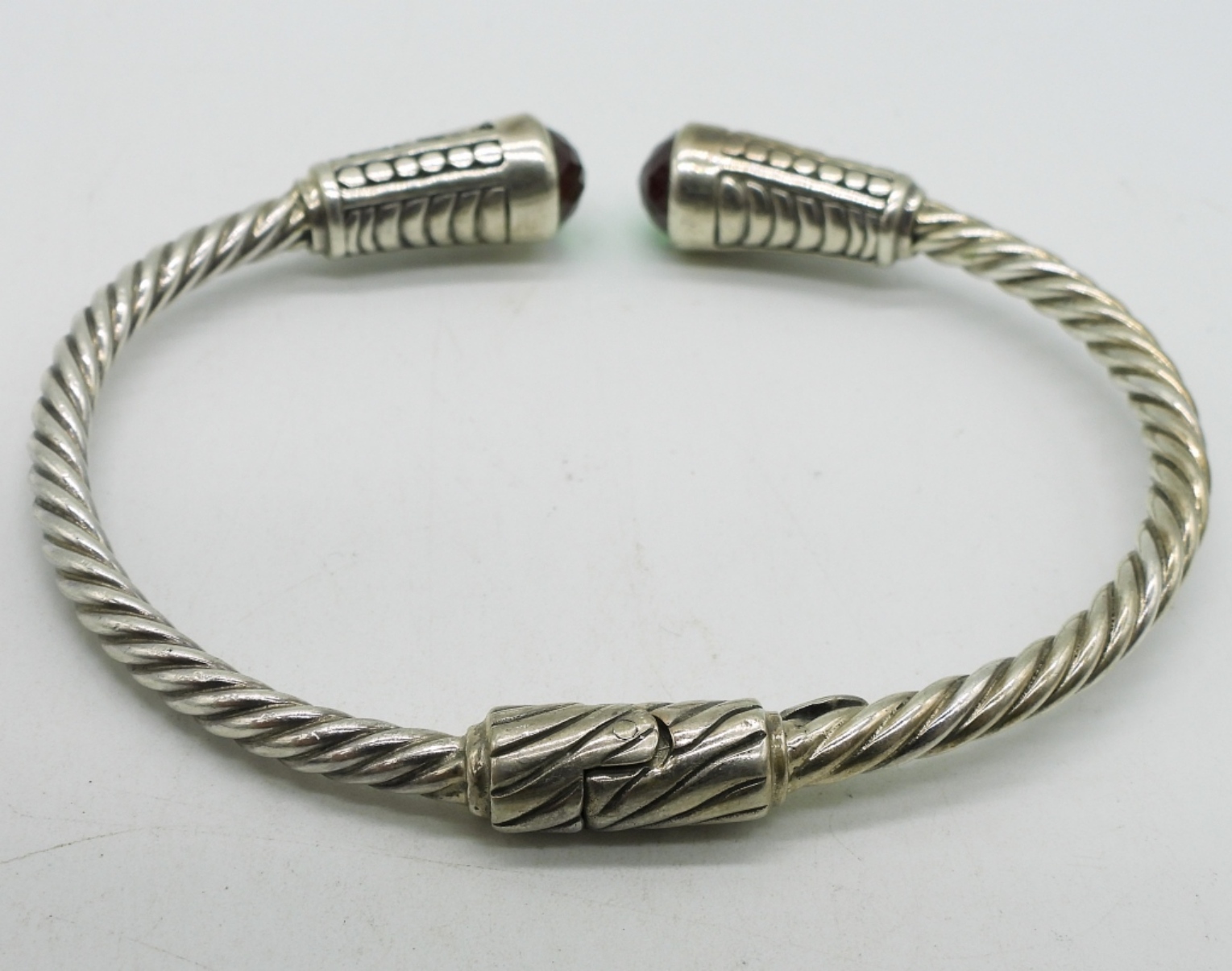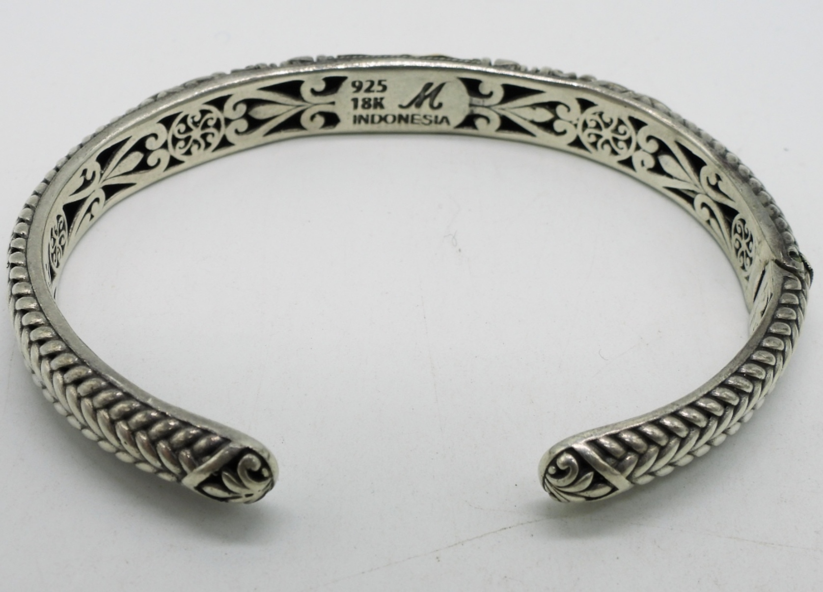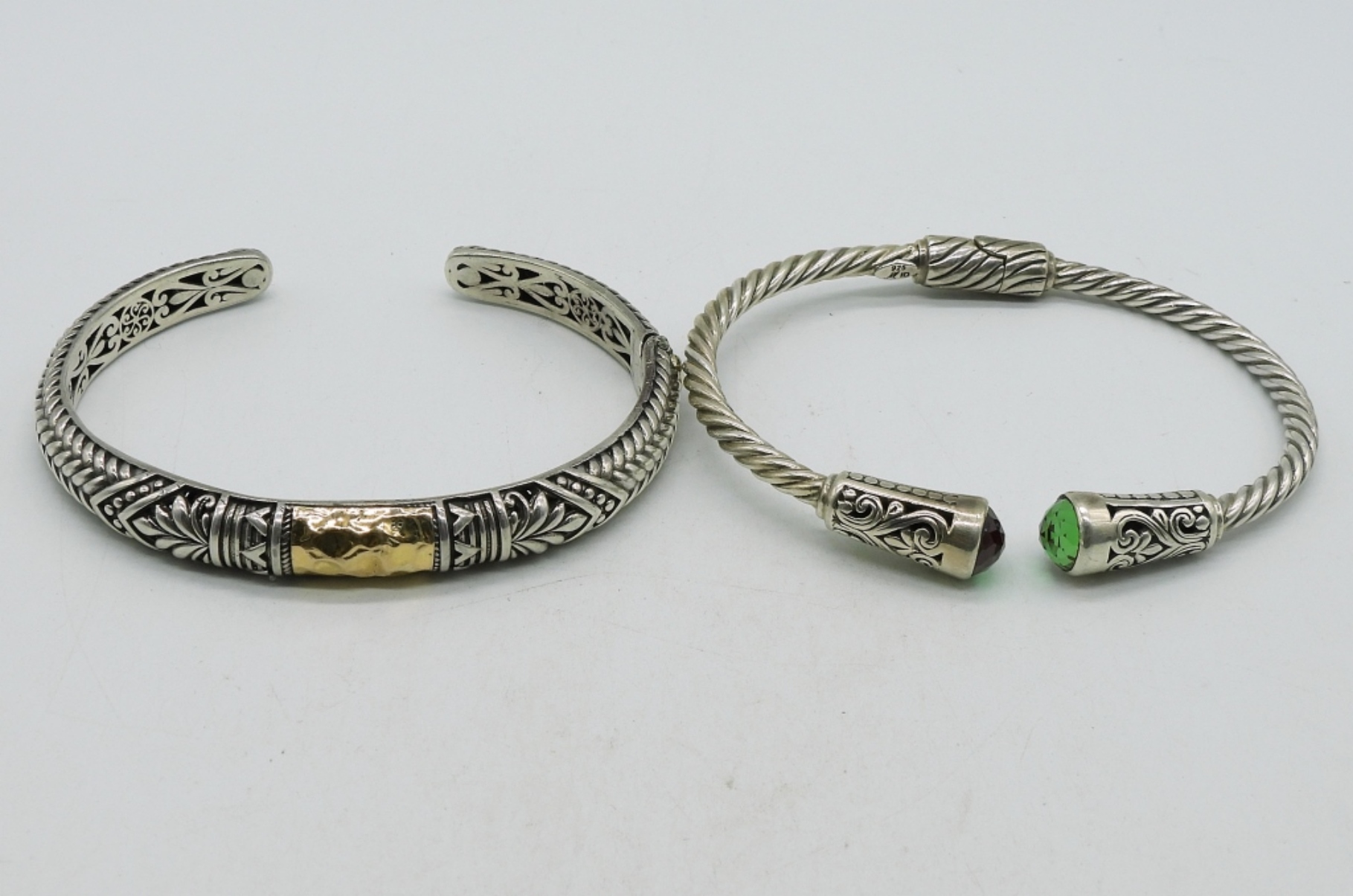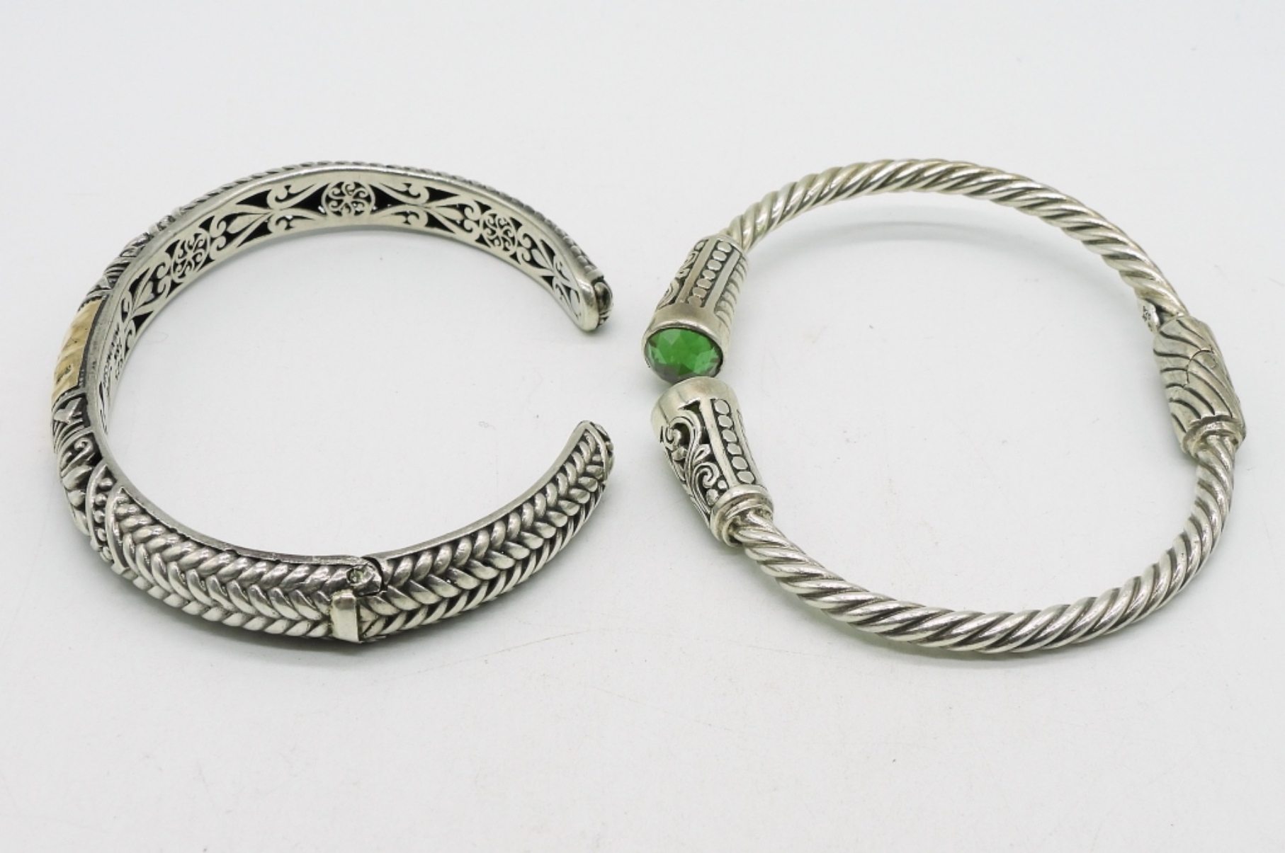 Sterling / 18k yellow gold accent hinged cuff bracelet. Sterling hinged bracelet with simulated emerald gemstones ends. (25.9 dwt)