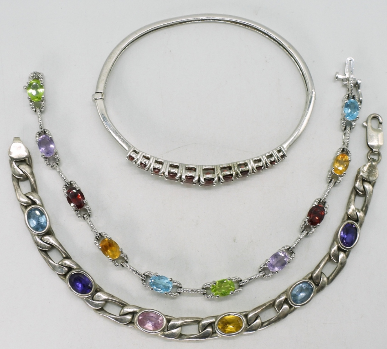Garnet sterling hinged bangle bracelet, two sterling multi gemstone bracelets 7.5″. (27.7 dwt)