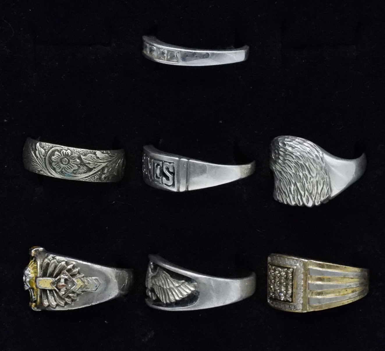 Seven sterling men’s fashion rings, sizes 11-15 (34 dwt)