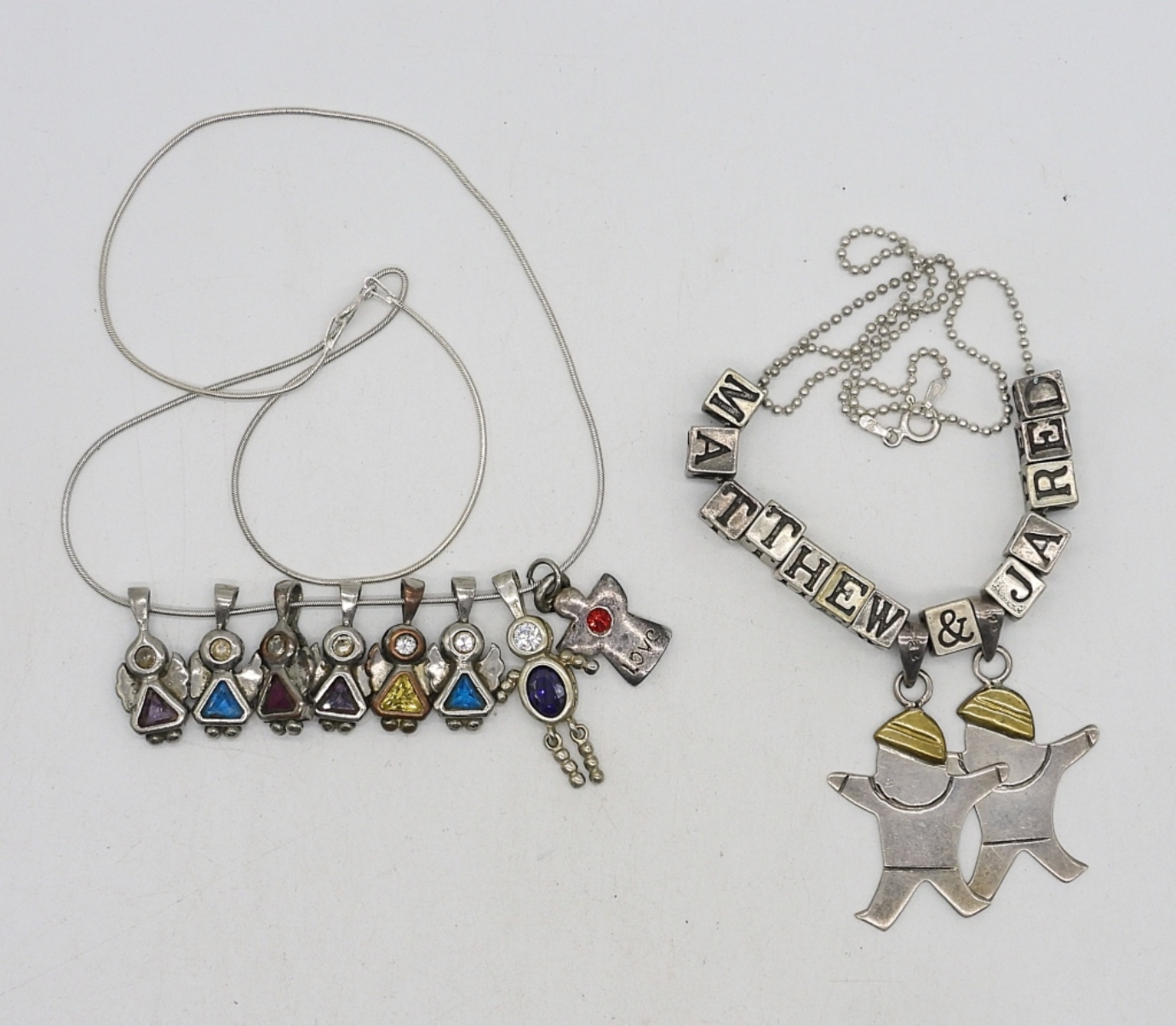 10 sterling children birthstone pendants. sterling beads spelling out “Matthew & Jared”. 2 sterling chains, 18-20″ 18-20″. (31 DWT)