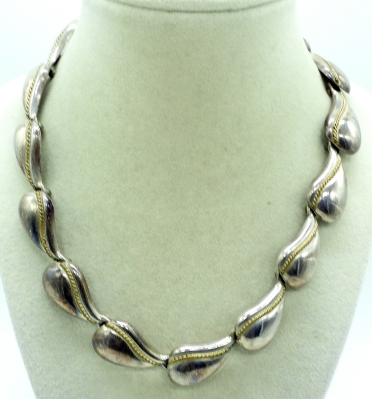 Taxco teardrop sterling with gold tone accents necklace, 17″. (47.9 dwt)