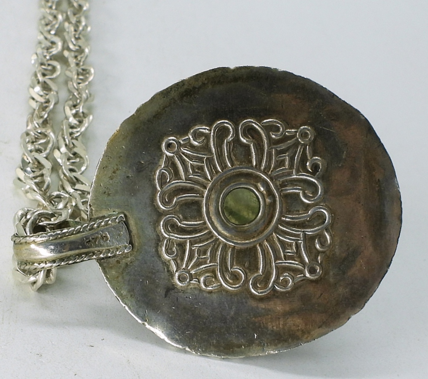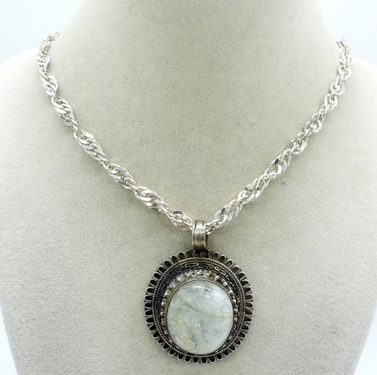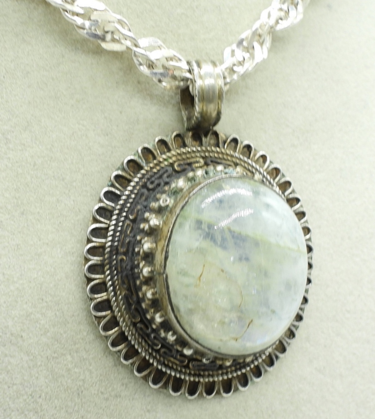 Gorgeous moonstone set in a silver pendant, 2″ long. On a sterling 24″ chain. (27 dwt)