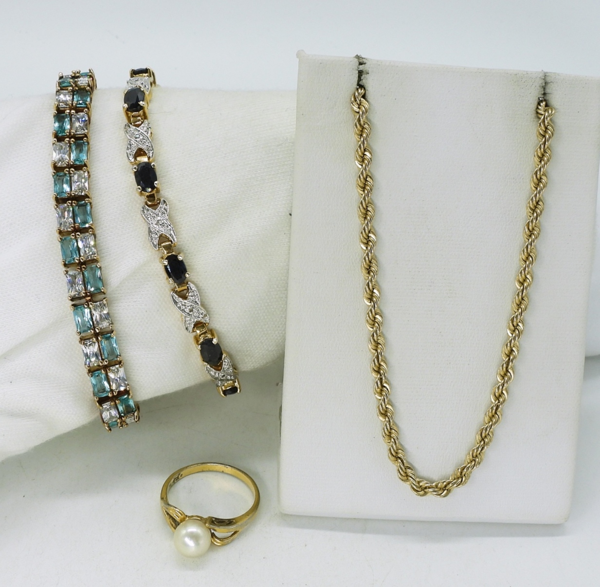 Two sterling gold tone bracelets with pretty blue gemstones, 7.5 – 8″ long. Gold tone sterling chain, 24″. Pearl gold tone 925 ring, size 7. (37.2 dwt)