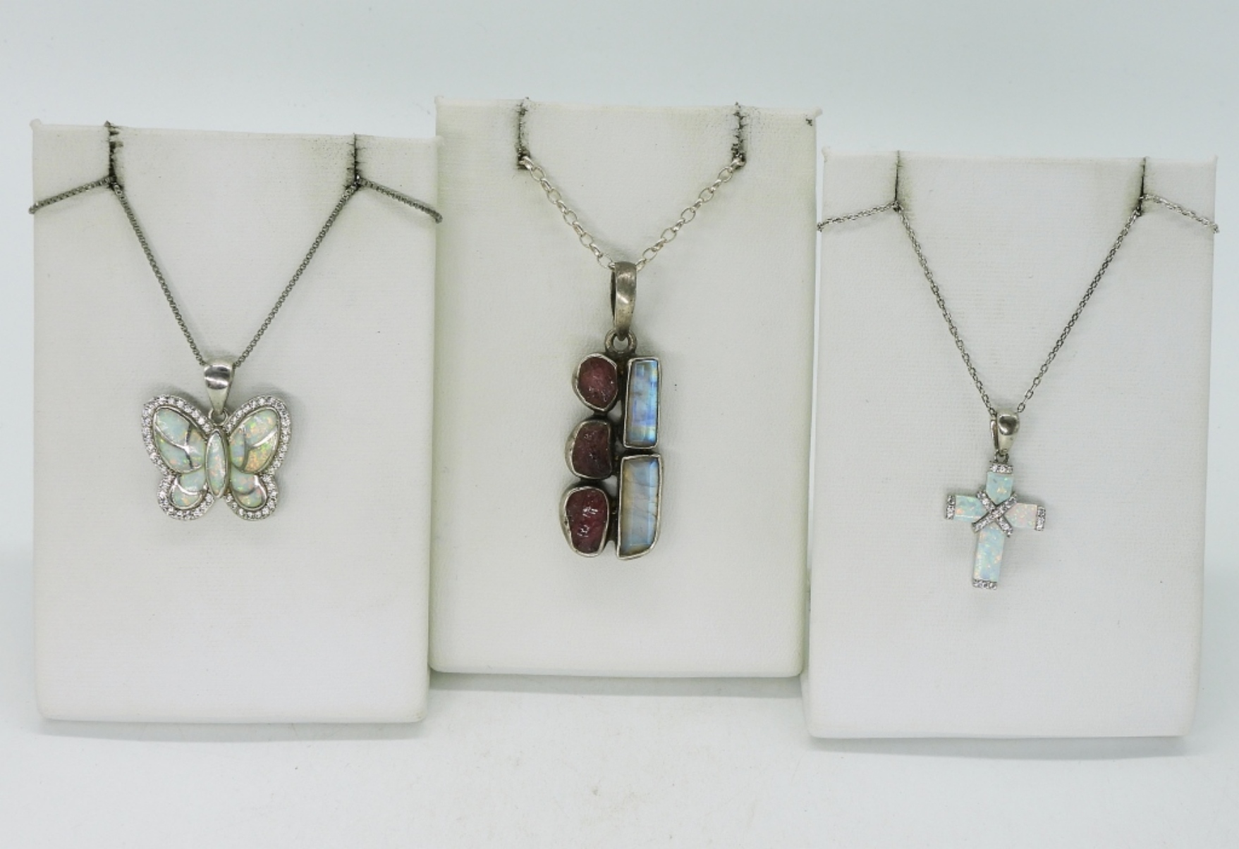 Two opal necklaces, butterfly and cross, 18″ & 19″. Moonstone & Garnet 925 pendant on a 18″ chain. (12 dwt)