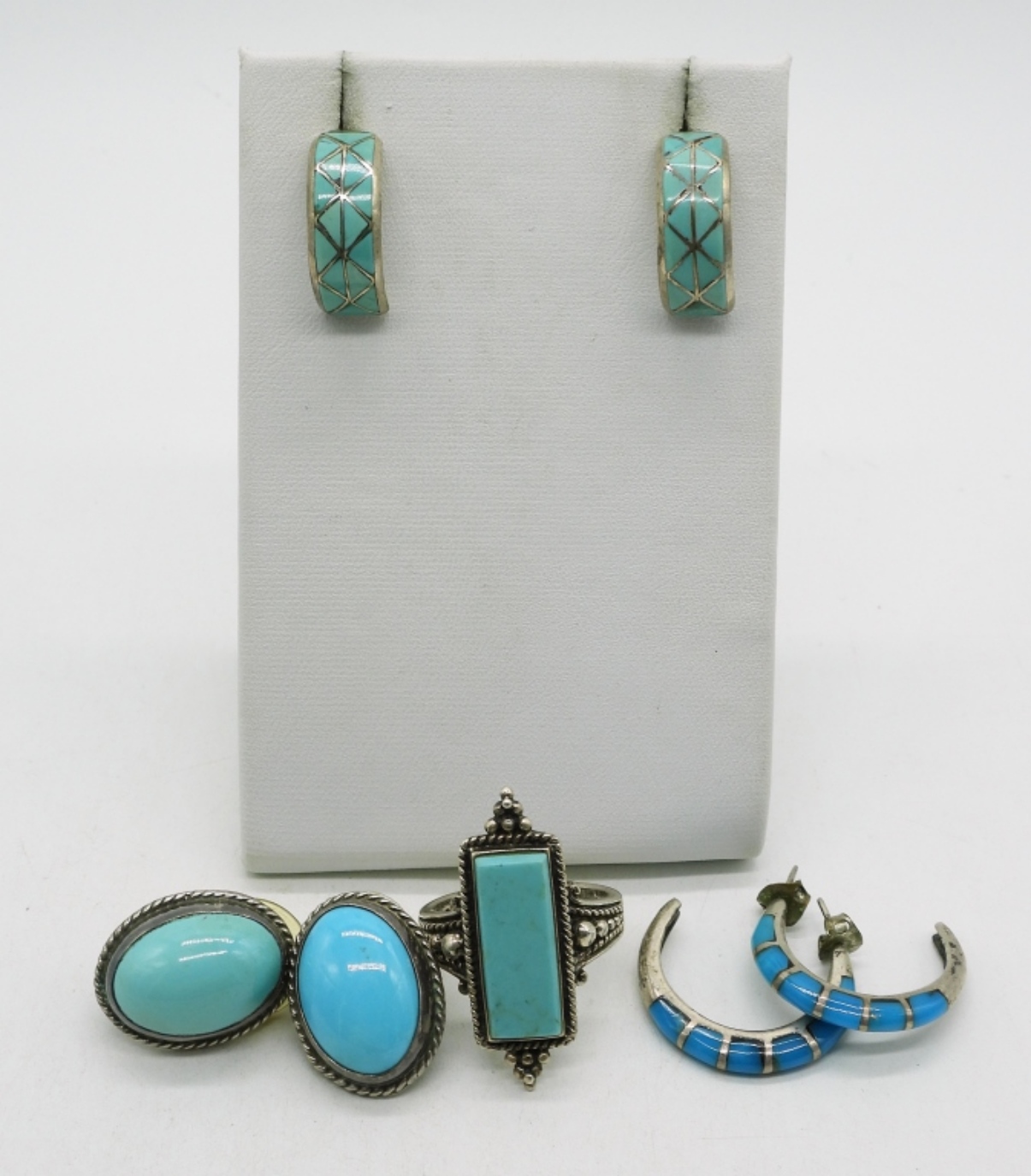 Three pair of sterling turquoise earrings, all pierced. One sterling turquoise ring size 8. (15 dwt)
