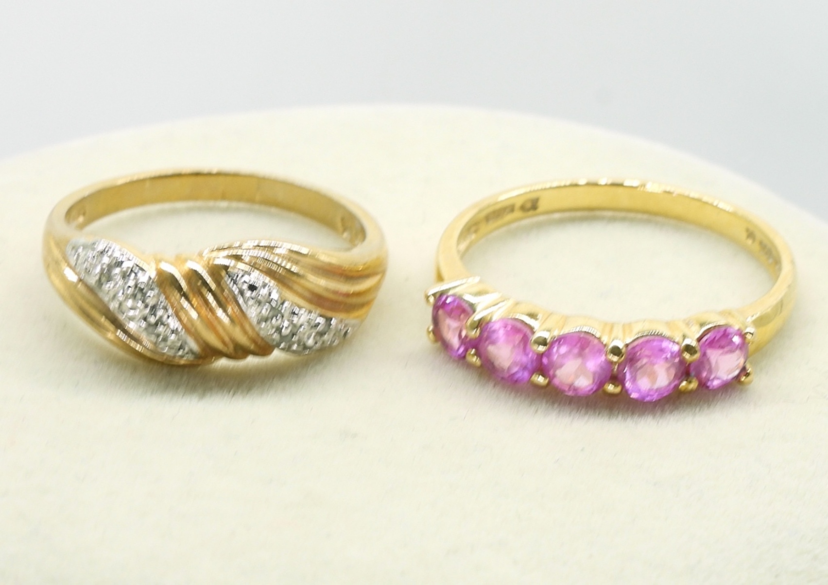 Sterling with gold tone. Two rings, size 8.5 & 10. Sterling gold tone pink gemstone necklace, 17″. (36.9 dwt)
