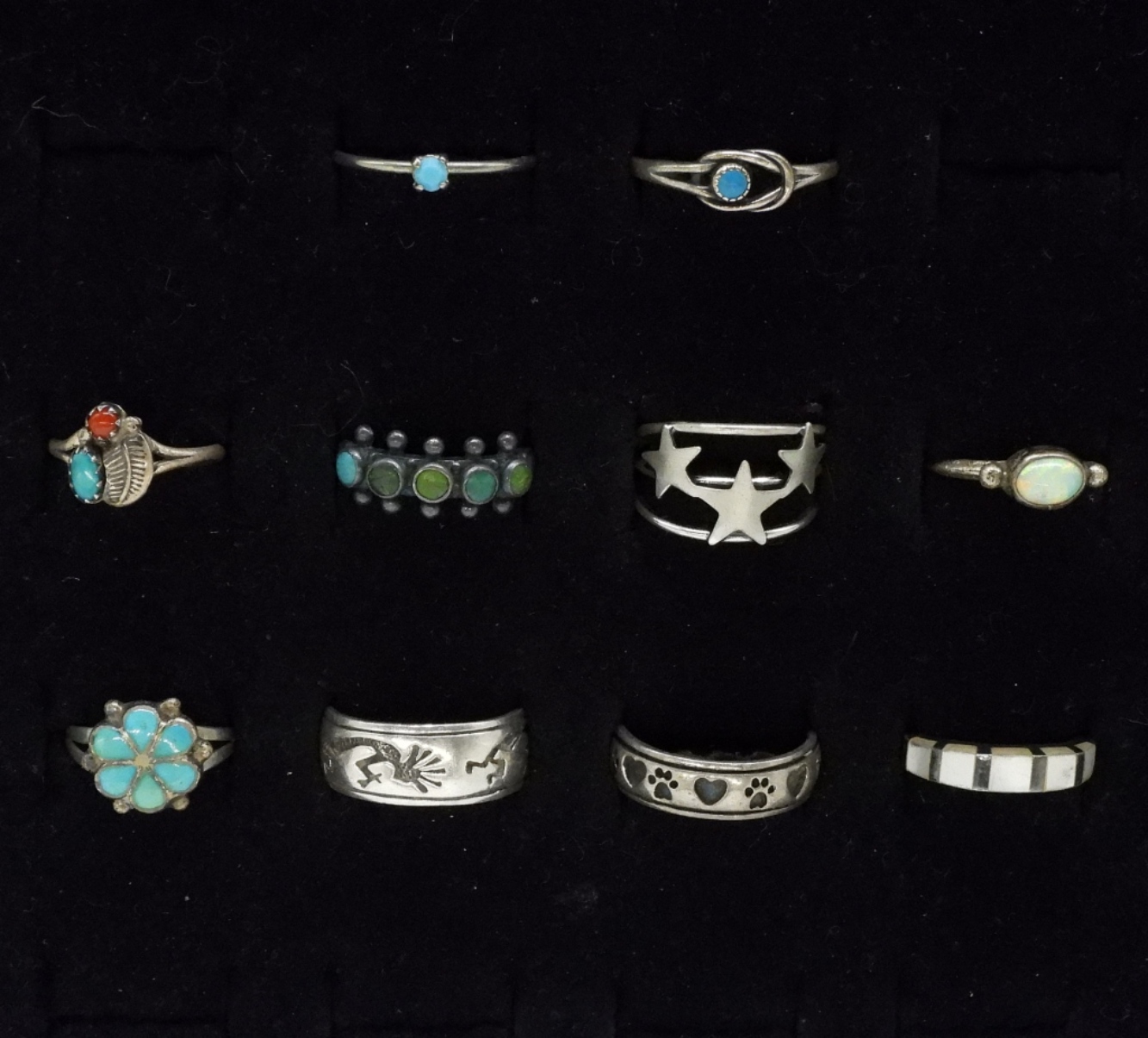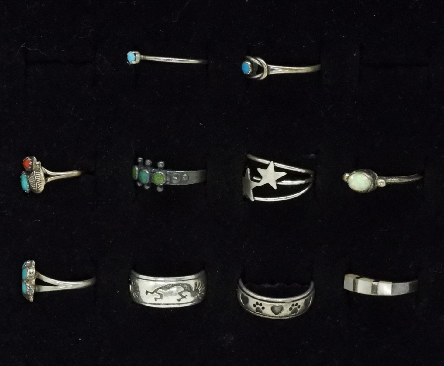 Ten petite sterling rings with turquoise, mother of pearl gemstones. Kokopelli and pawprints. Sizes 5-9 (16 dwt)