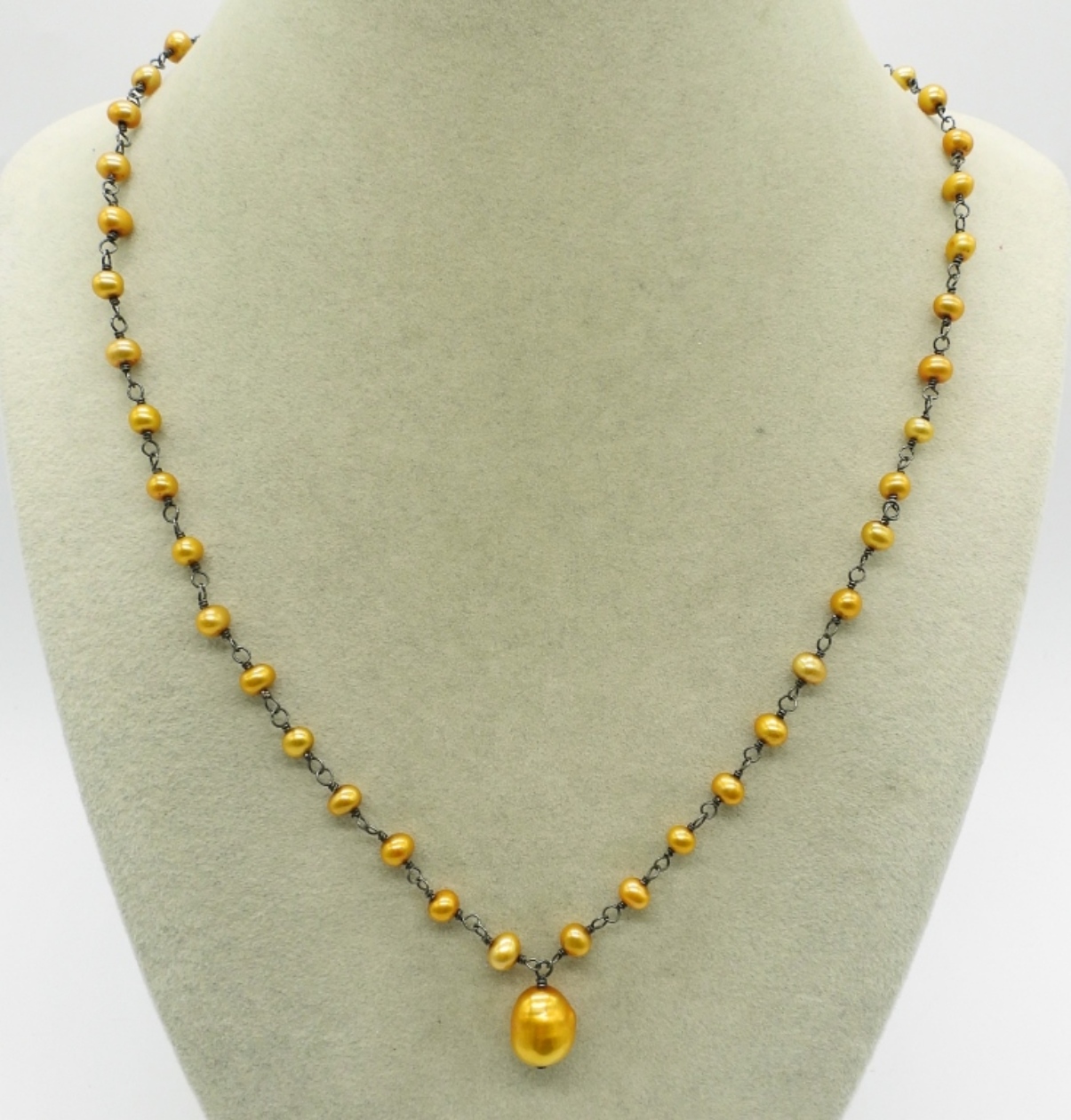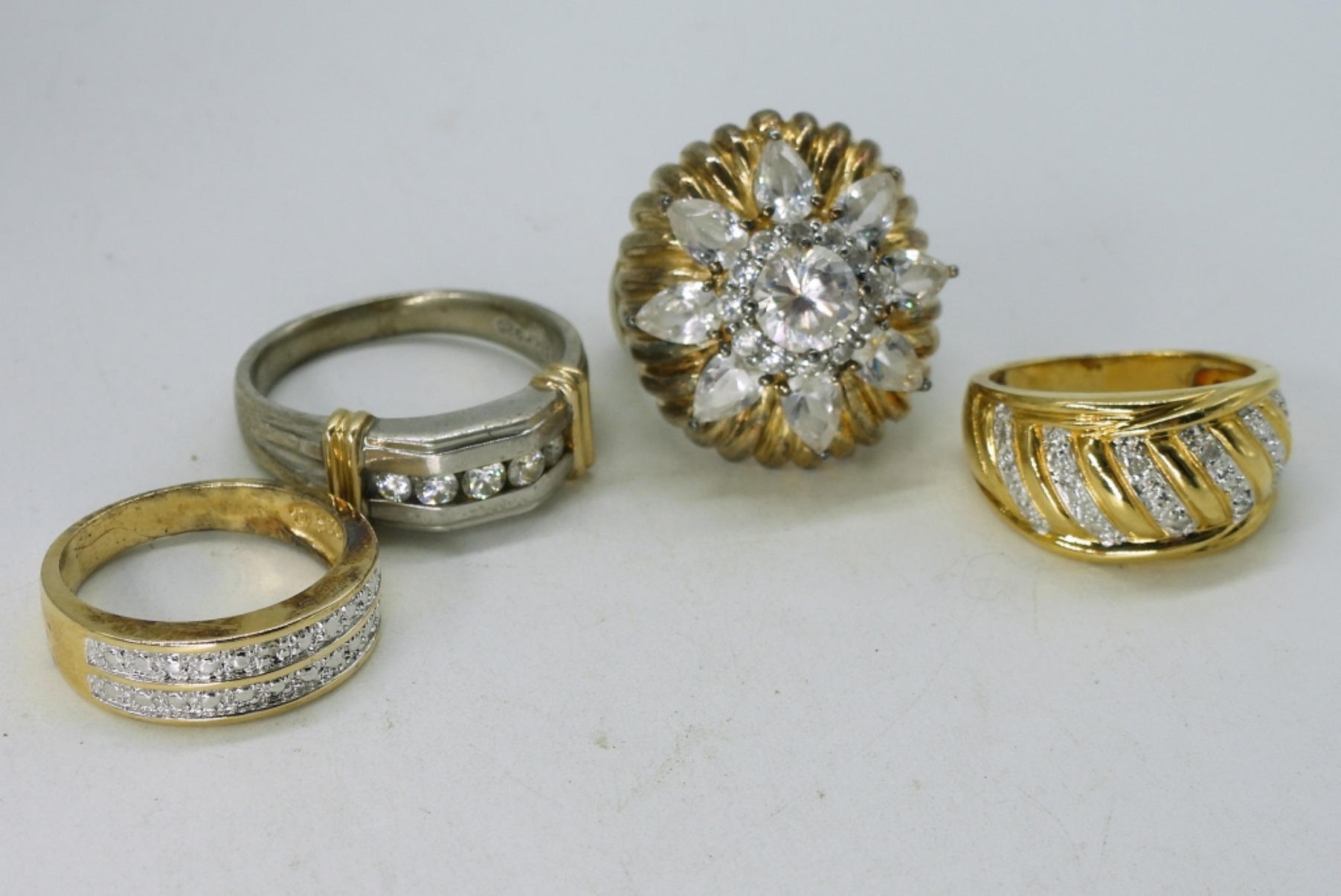 Three sterling necklaces, two gold tone, one gold pearl. 18″. Four sterling rings, gold tone with simulated diamonds. 6 – 11 (28.9 dwt)
