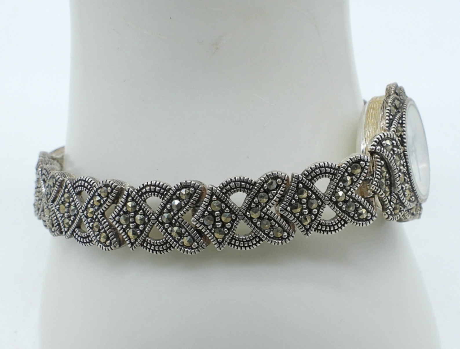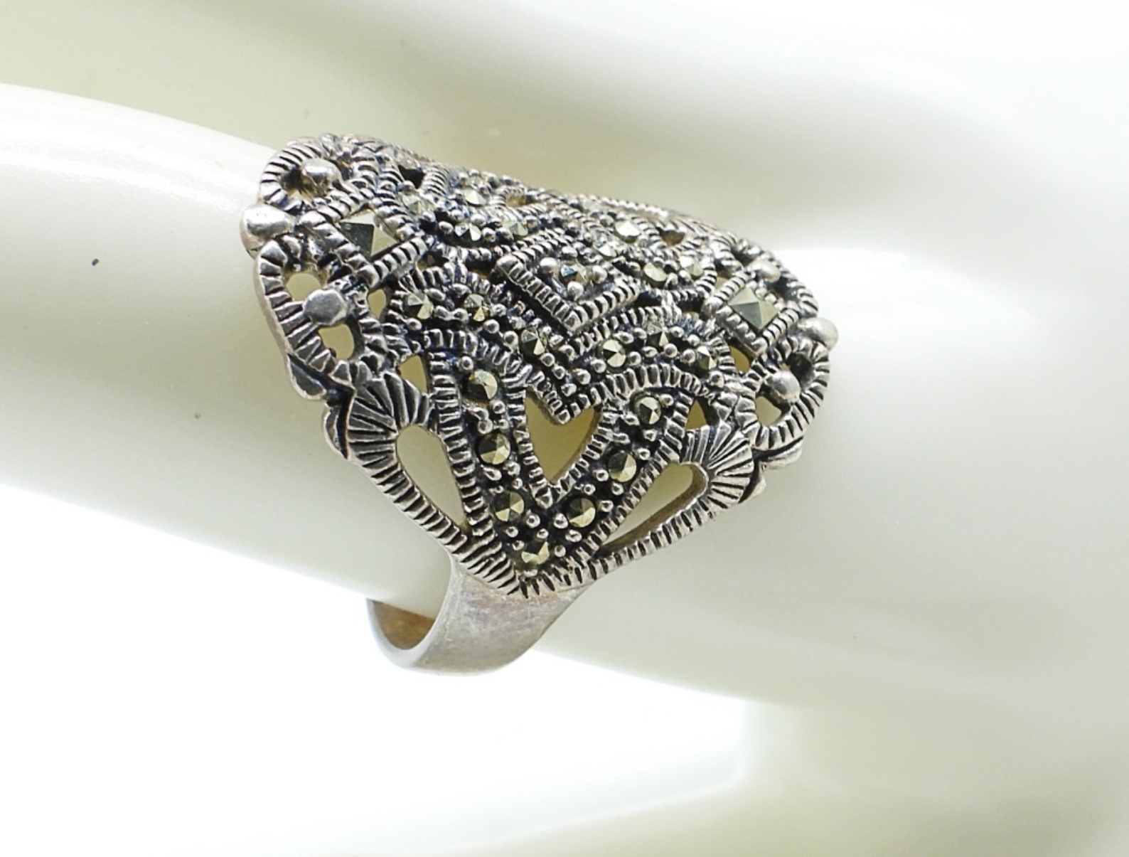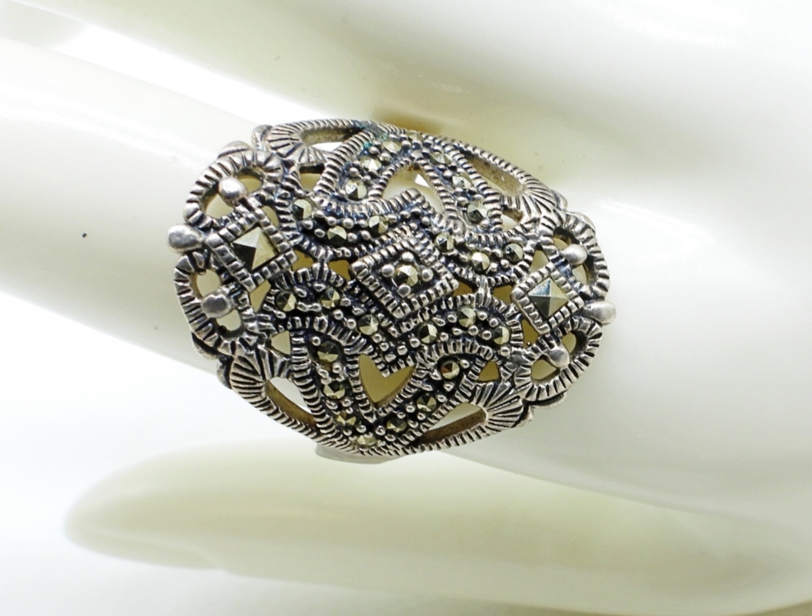 Vintage Sterling with Marcasite Jewelry. Watch is unbranded, 7″ (not working, probably needs a battery). Brooch 1 3/4″. Ring size 11. (30 DWT)