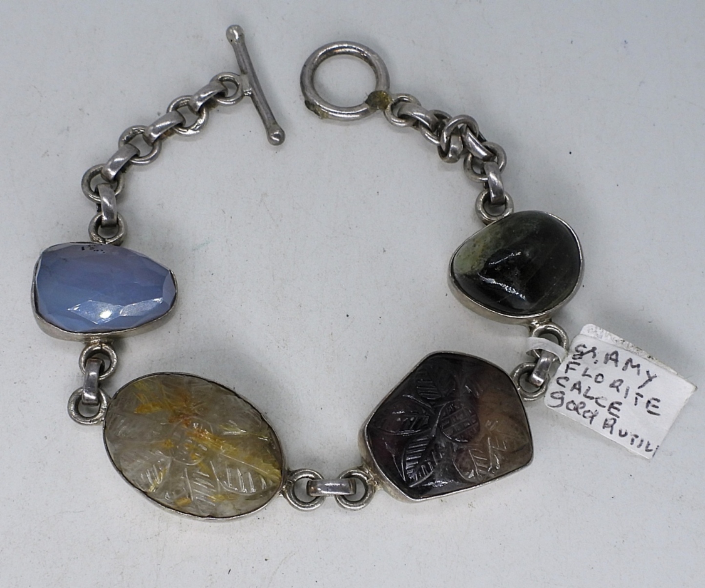 Sterling bracelet with green amethyst, fluorite & more carved gemstones, 7.5″. Labradorite beaded necklace with sterling beads. 21″. (28 DWT)
