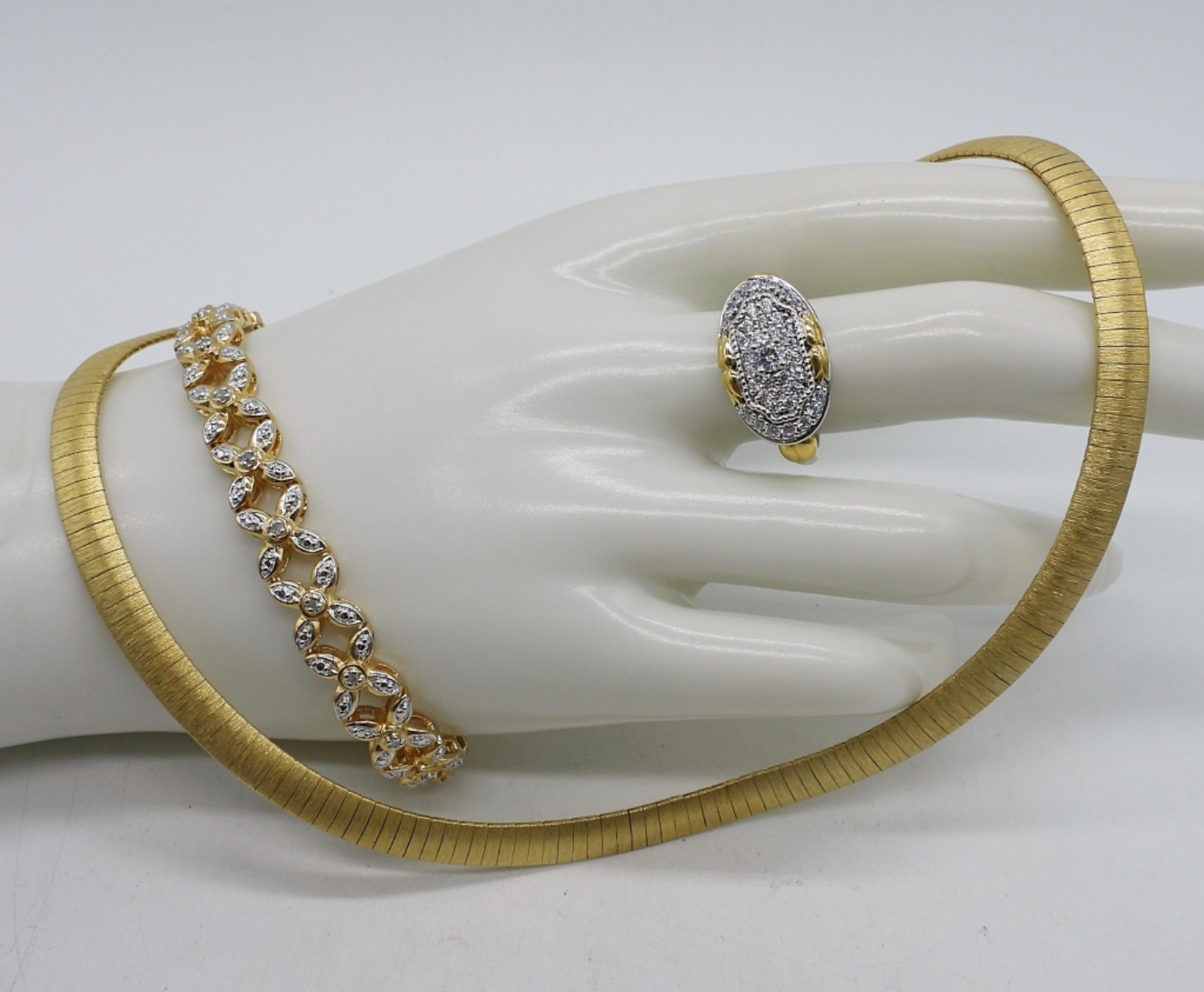 Sterling silver, gold tone chain 16″, Bracelet 7″ & Ring size 9. (35 DWT)