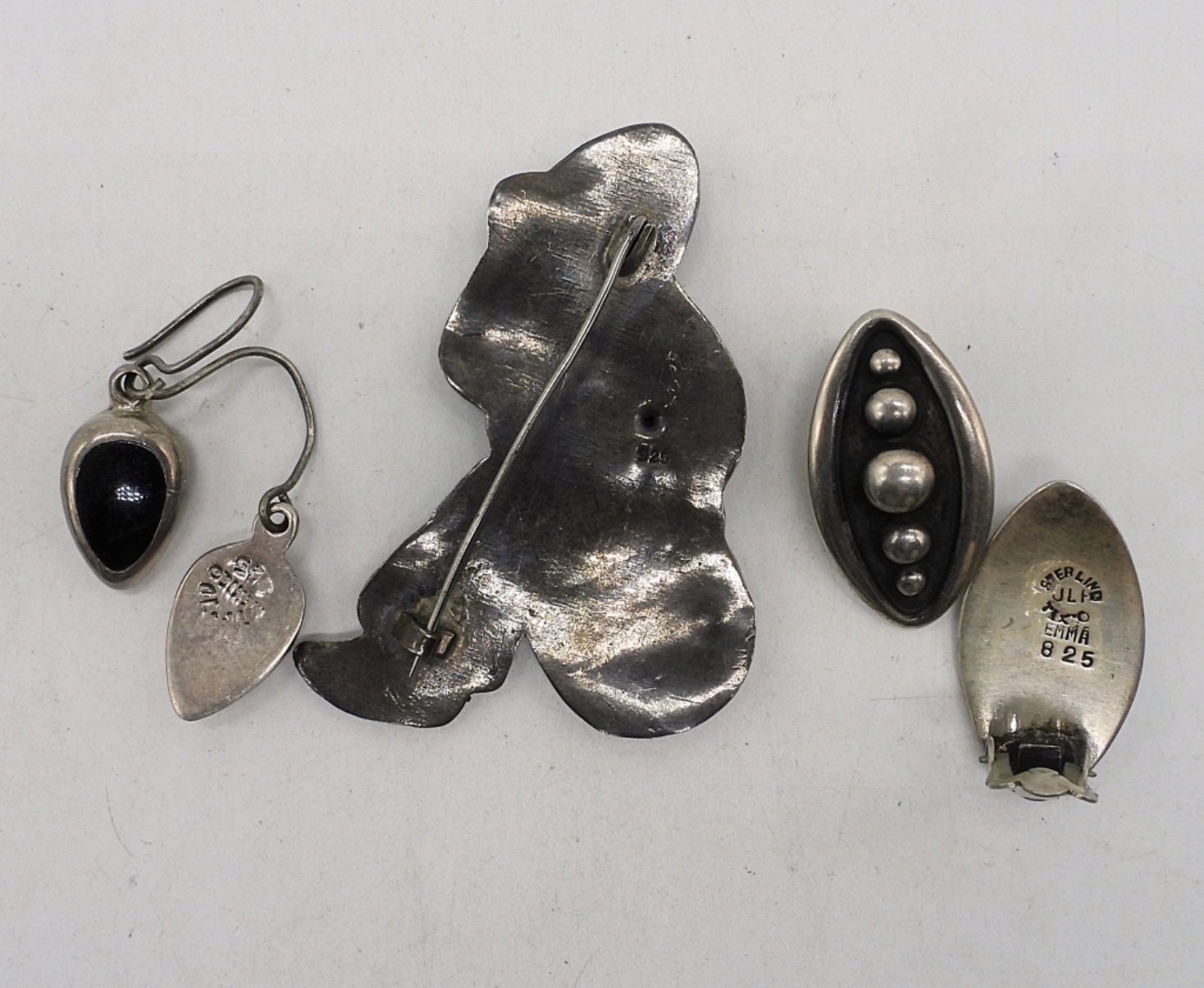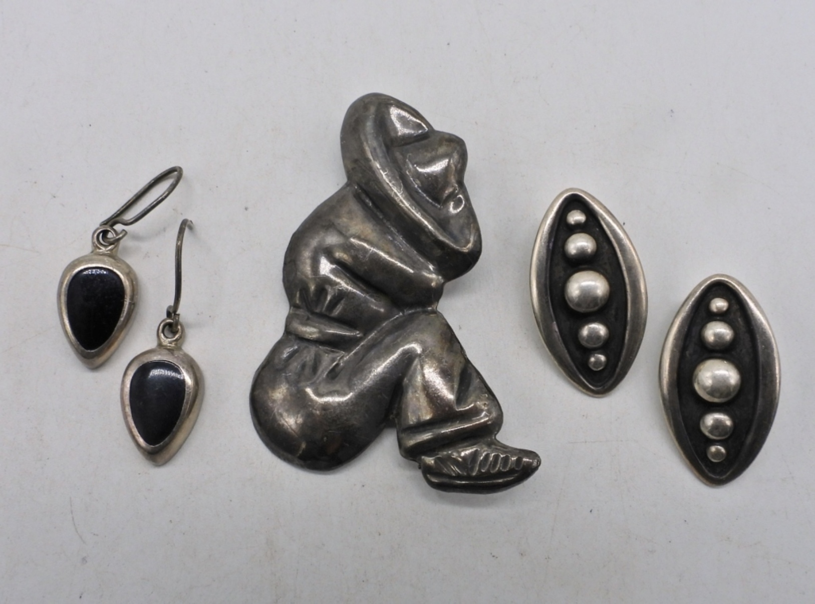 Two pair of Taxco earrings. One pierced, one clip on. Mexico 925 sleeping man brooch, 2.5″. Clip on earrings are marked “Sterling Taxco Emma 825”. (17.6 DWT)