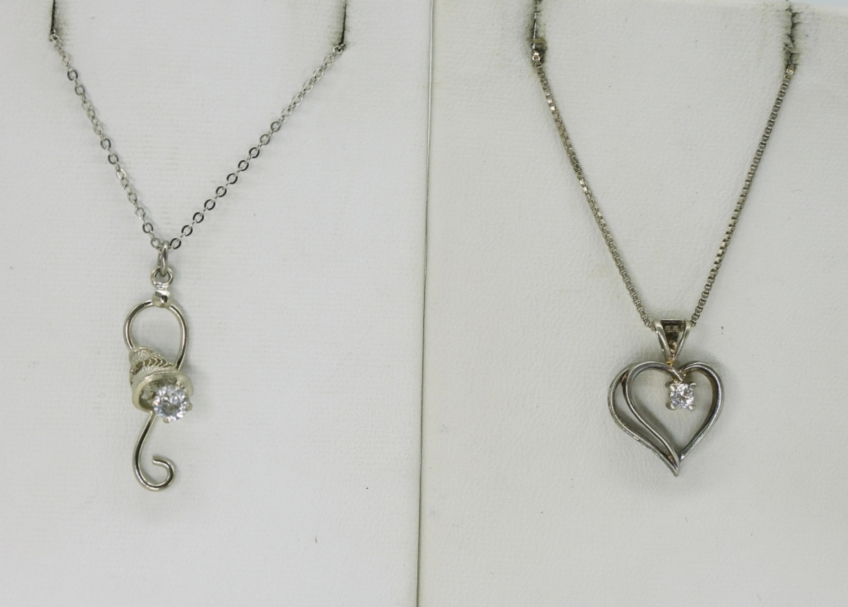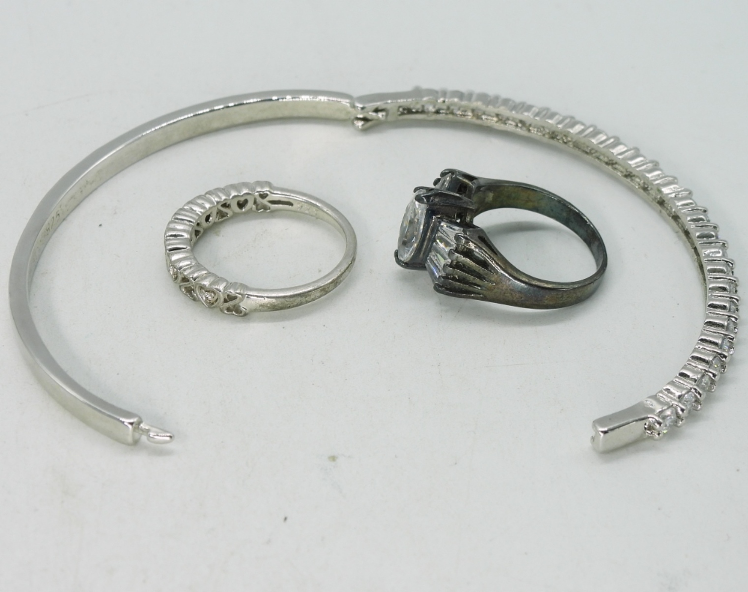 Simulated diamond sterling jewelry. Two rings, sizes 5 & 6.5. Two necklaces, 15″ & 18″. Hinged bangle bracelet. (14.9 dwt)