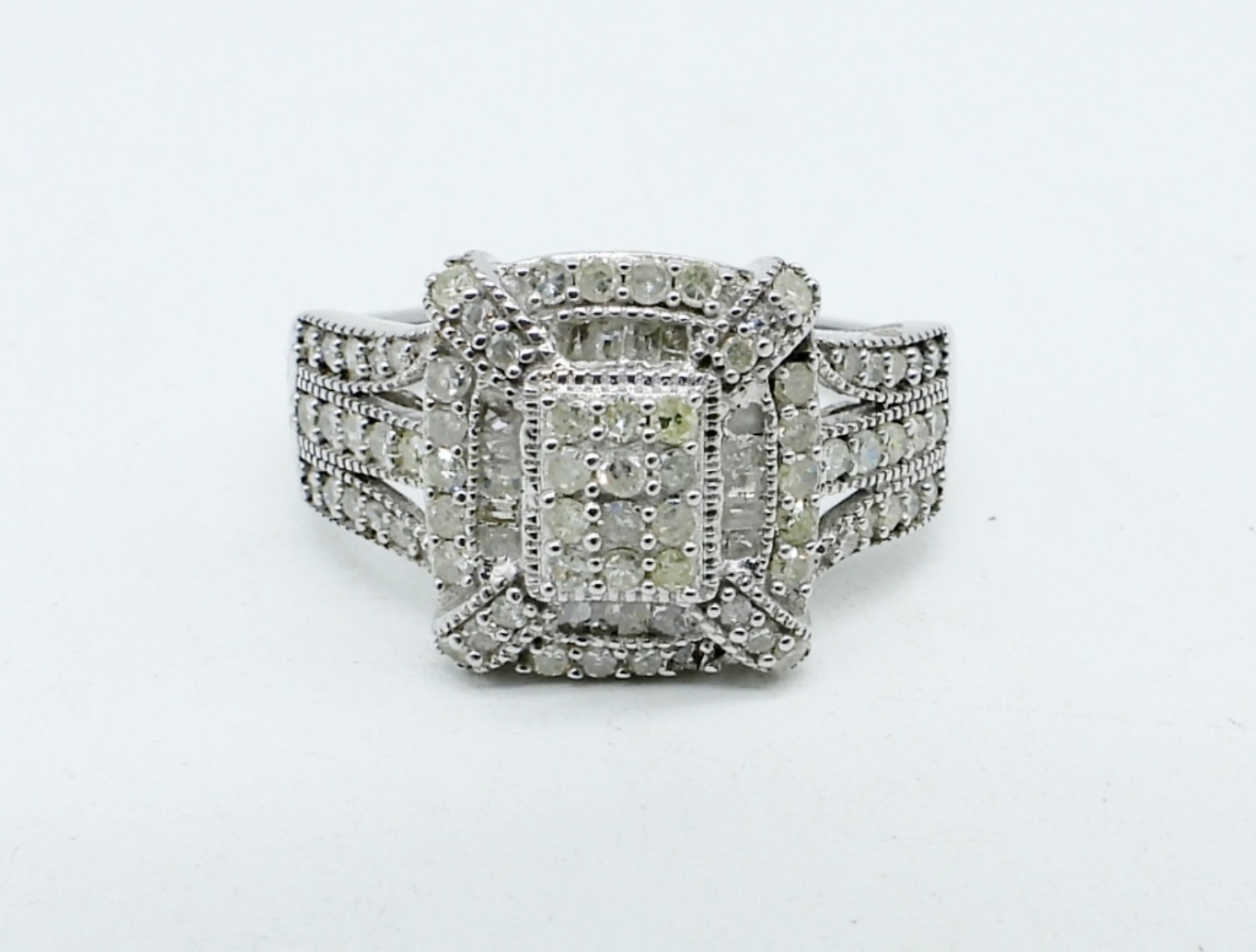 D’Joy Sterling Silver, Diamond Engagement Ring, size 10. MISSING TWO DIAMONDS. (3.5 DWT)