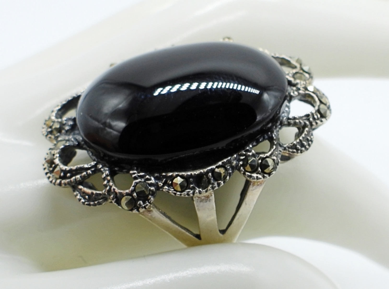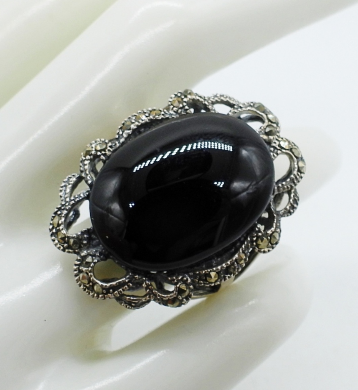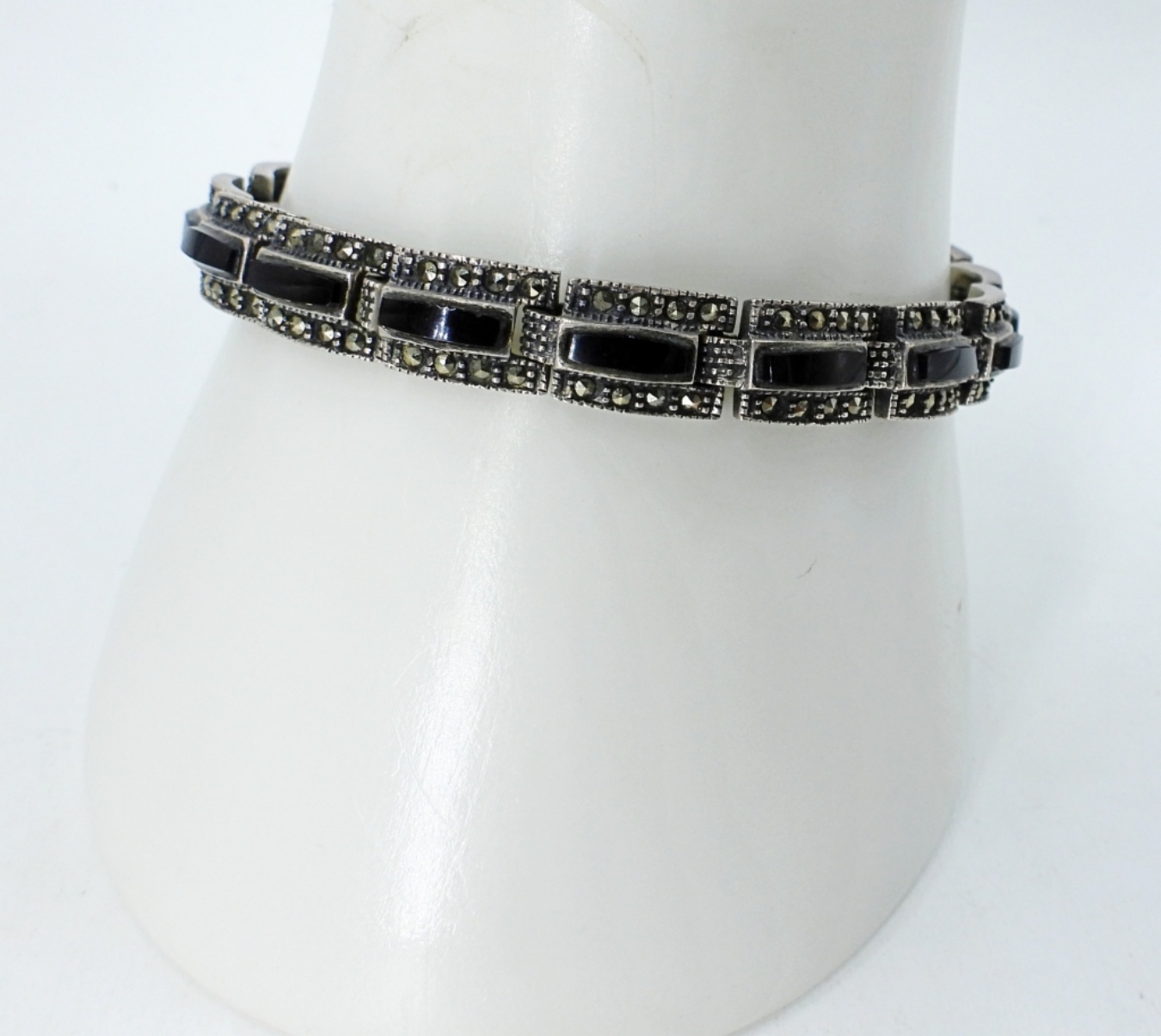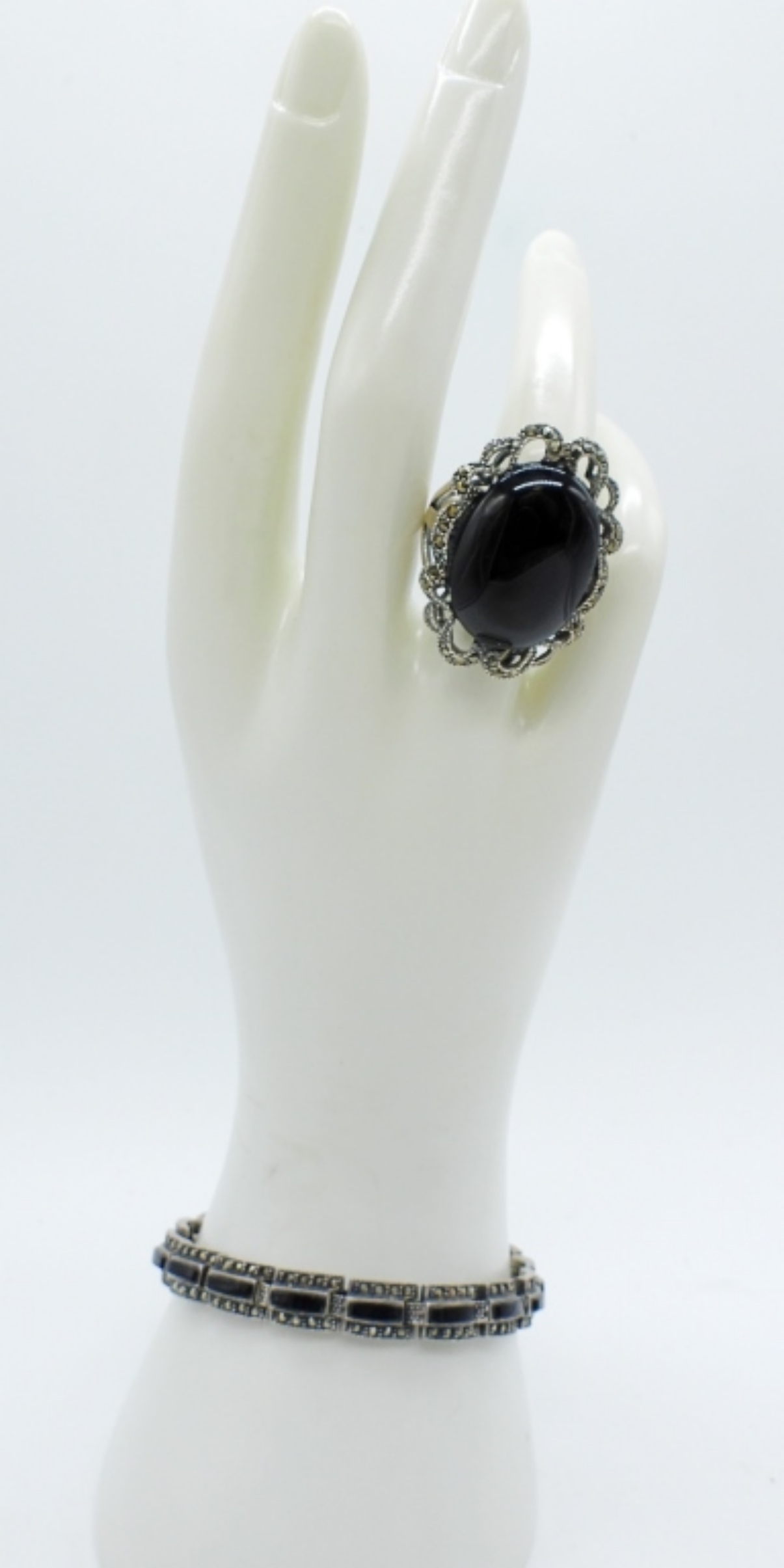 Vintage sterling black onyx, marcasite ring and bracelet. Ring is size 9. Bracelet is 7″. (18 dwt)