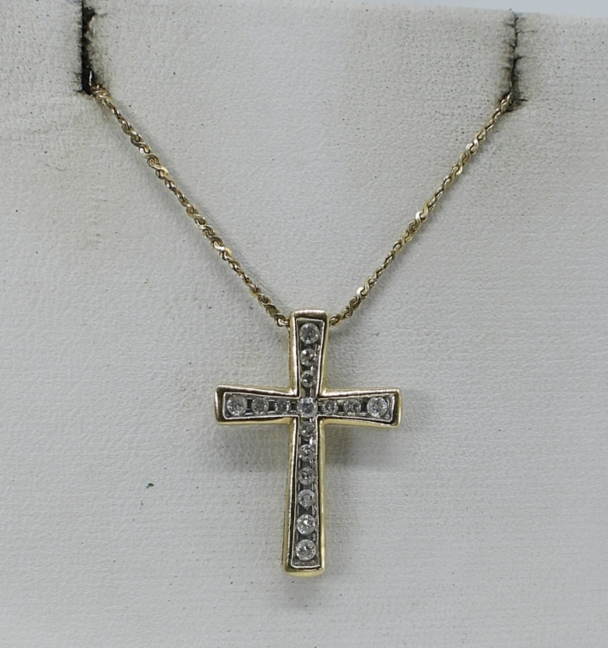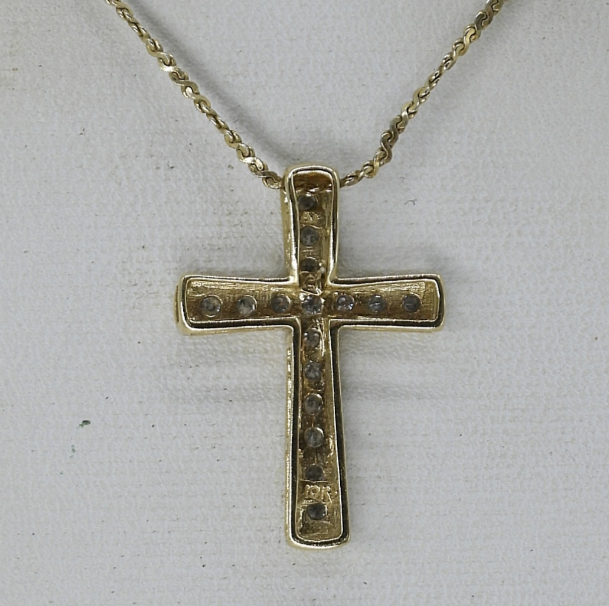 10K Yellow Gold, Cross pendant with diamonds. Sterling silver gold tone chain. 18″. (.8 DWT/10KG & .8 DWT/925)