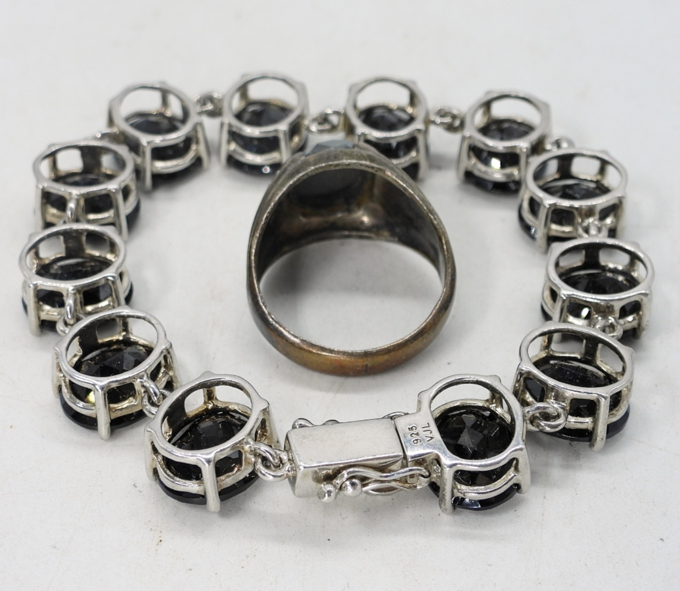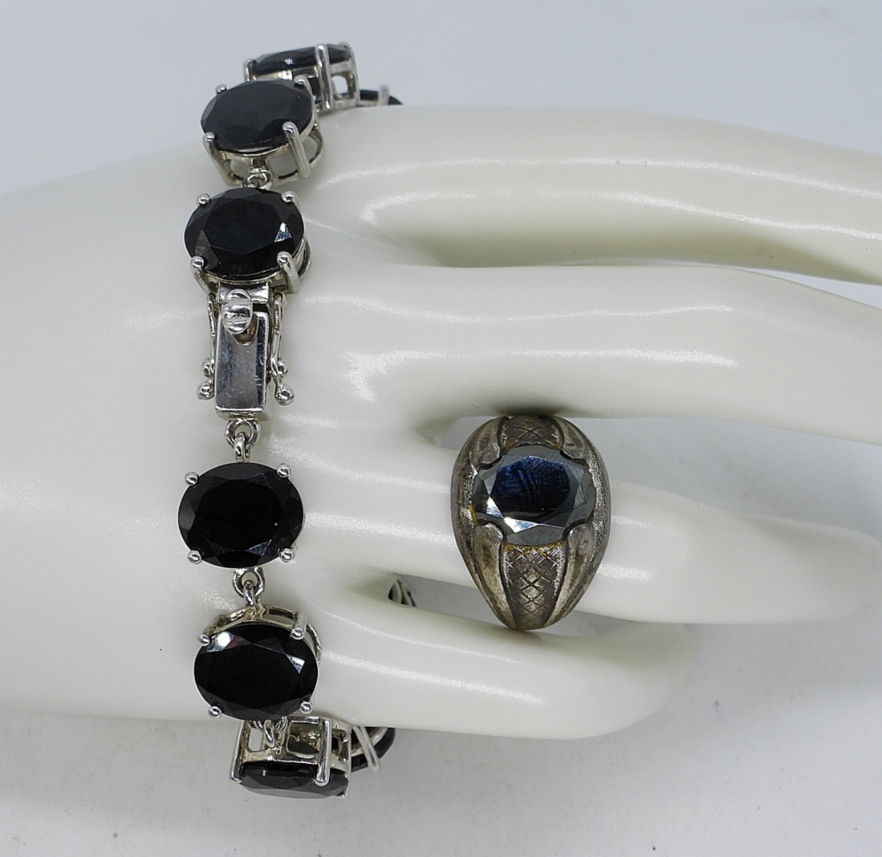 Sterling Vintage Jewelry with Black Onyx & Hematite Bracelet & Ring. 7″ & Ring Size 9. (23 DWT)