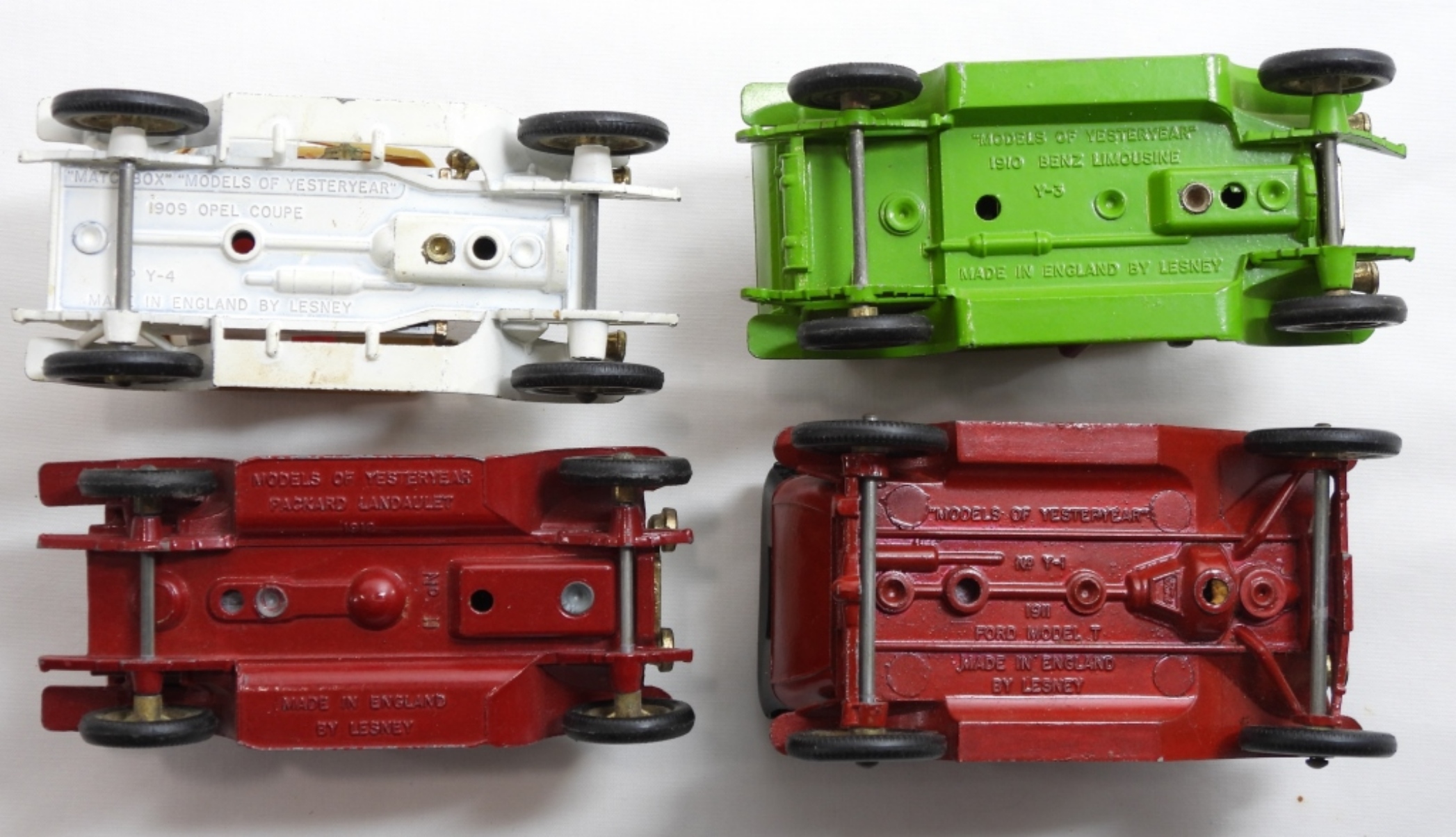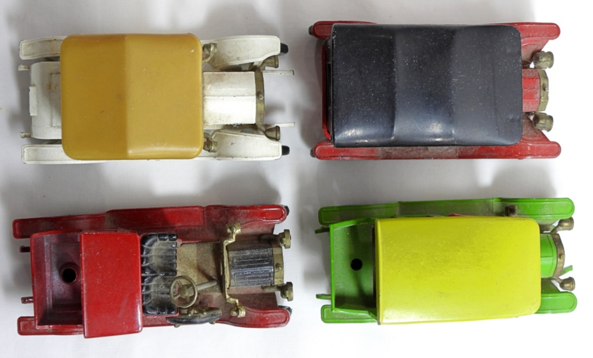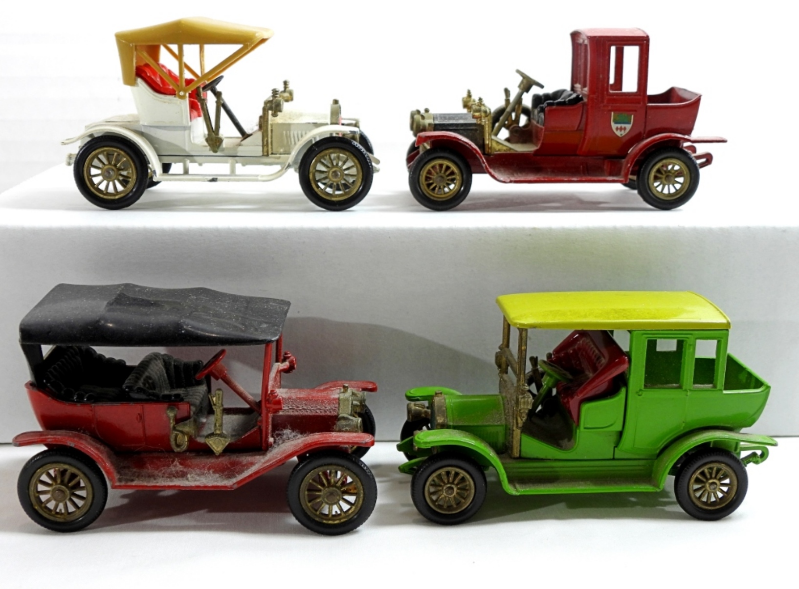 (4) Matchbox model toy cars. 1910 Benz Limousine, 1909 Opel Coupe, 1912 Packard Landaulet, 1911 Ford Model T. All in fair to good condition, pre owned.