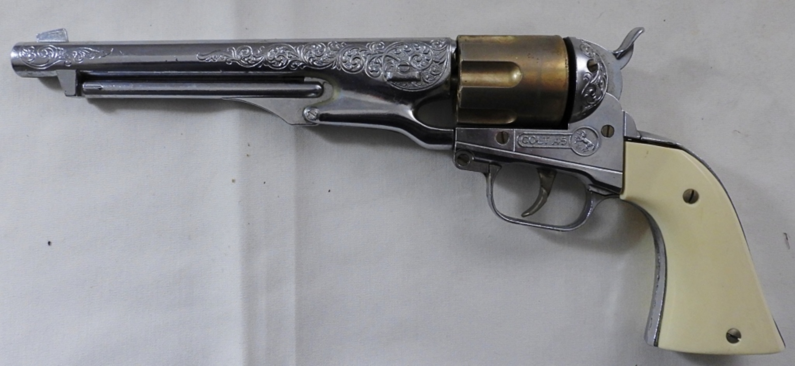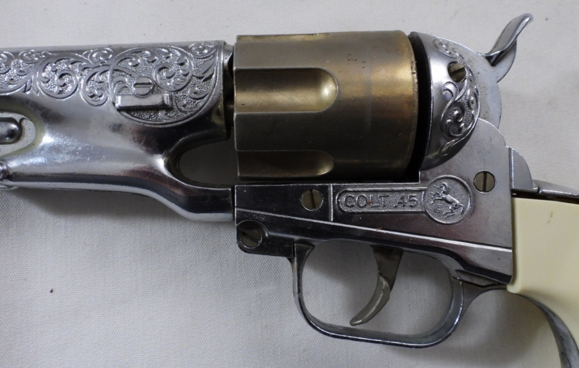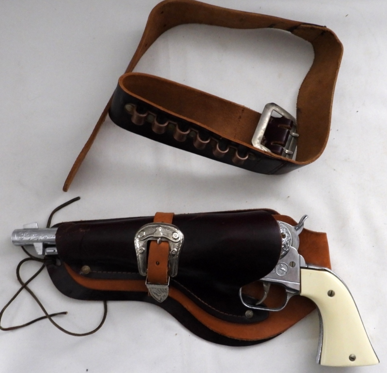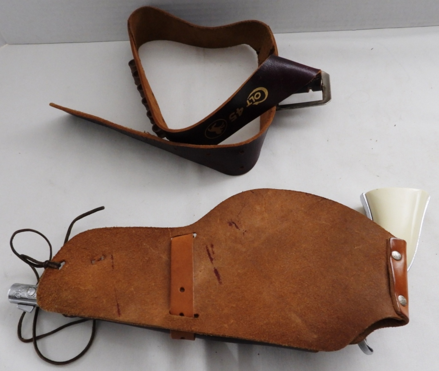 Hubley, Made in America, cap gun, missing orange cap, has bullets in chamber, untested, leather holster and leather belt, in good condition, belt measures about 35″