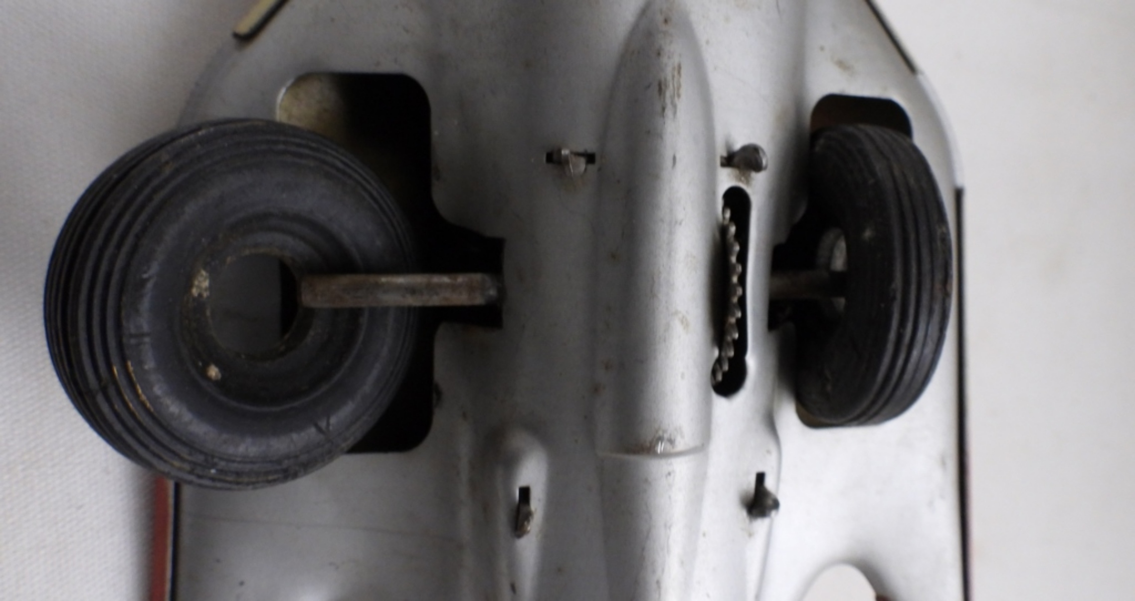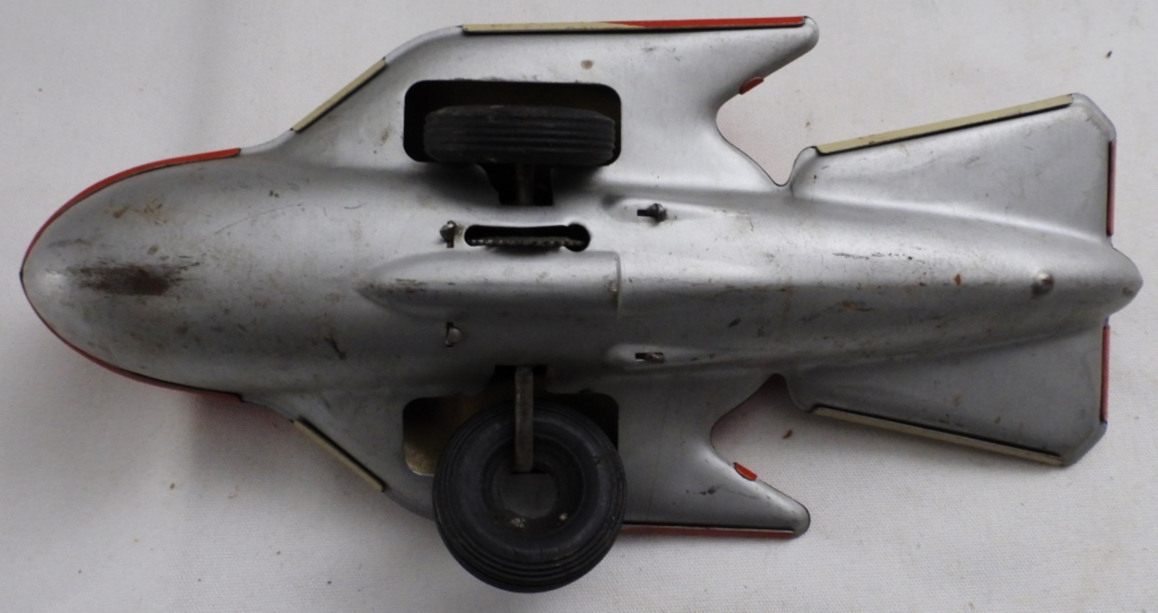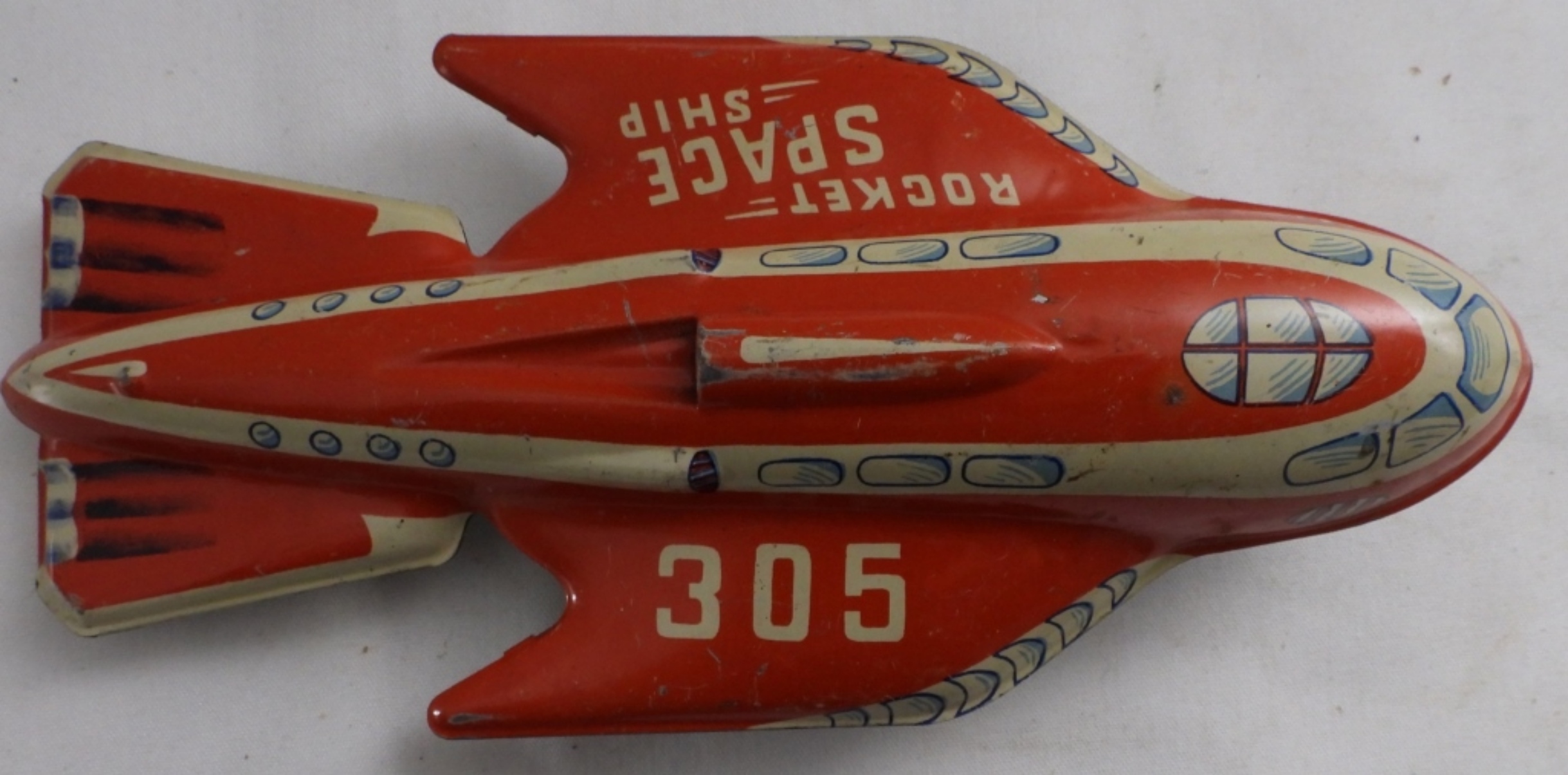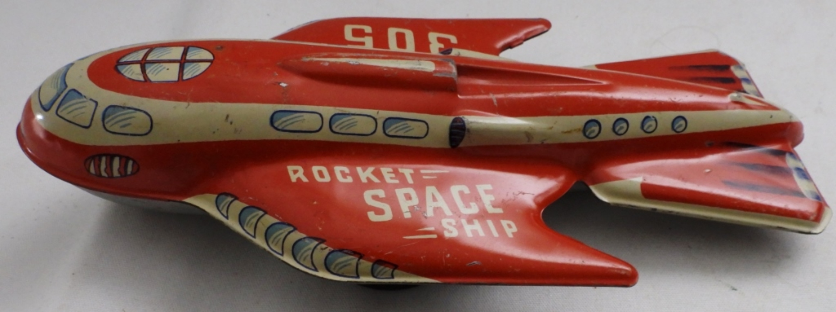 Rocket space ship 305, Automatic Toy Co. tin, good condition, wheels are loose, 9″ long, 4″ wide