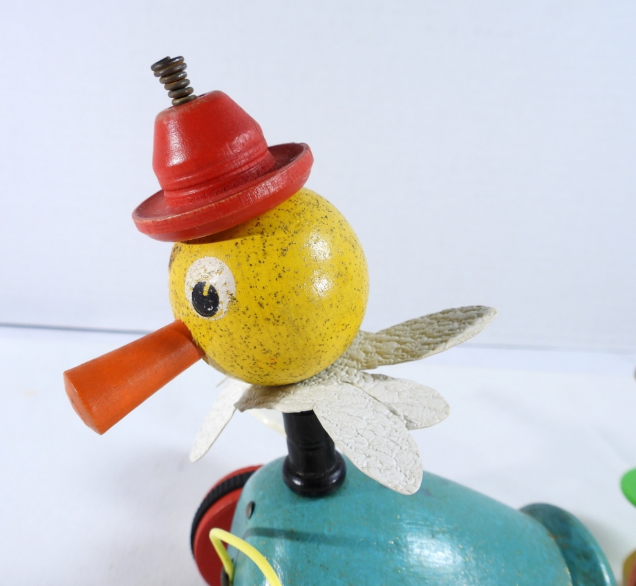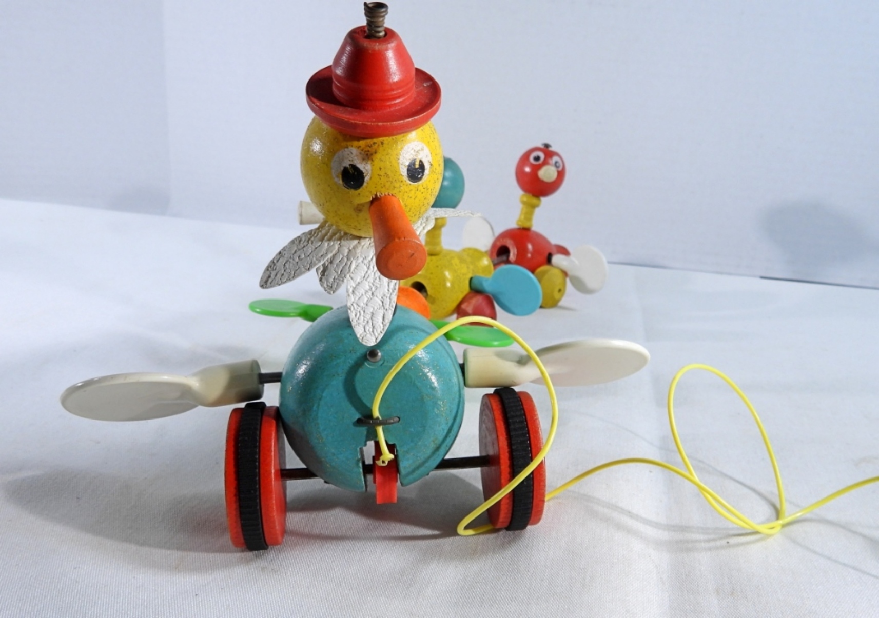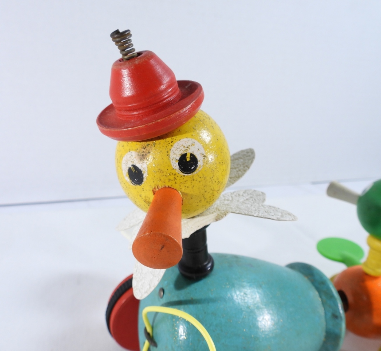 Pull toy still works and makes sounds. It does have a clear coat of gold glitter over each of the ducks. As well, the spring is popping out of its hat.