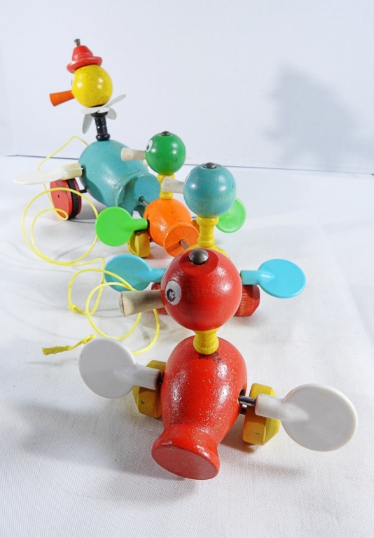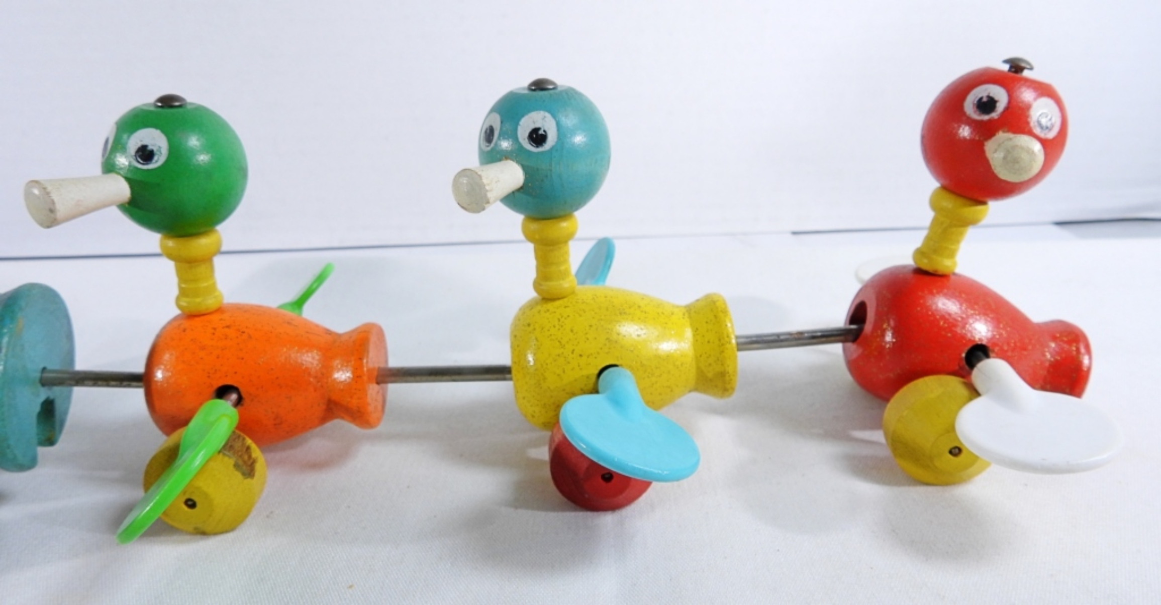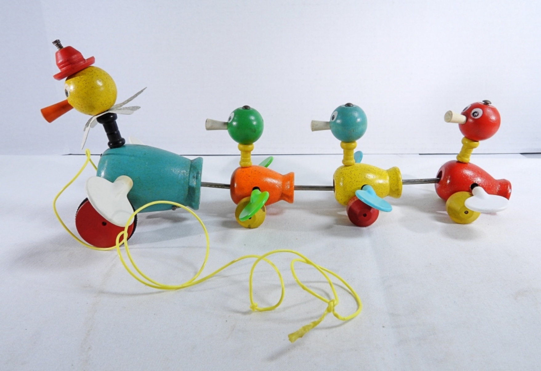 Pull toy still works and makes sounds. It does have a clear coat of gold glitter over each of the ducks. As well, the spring is popping out of its hat.