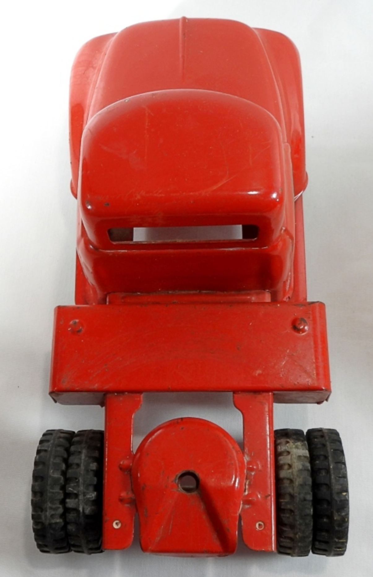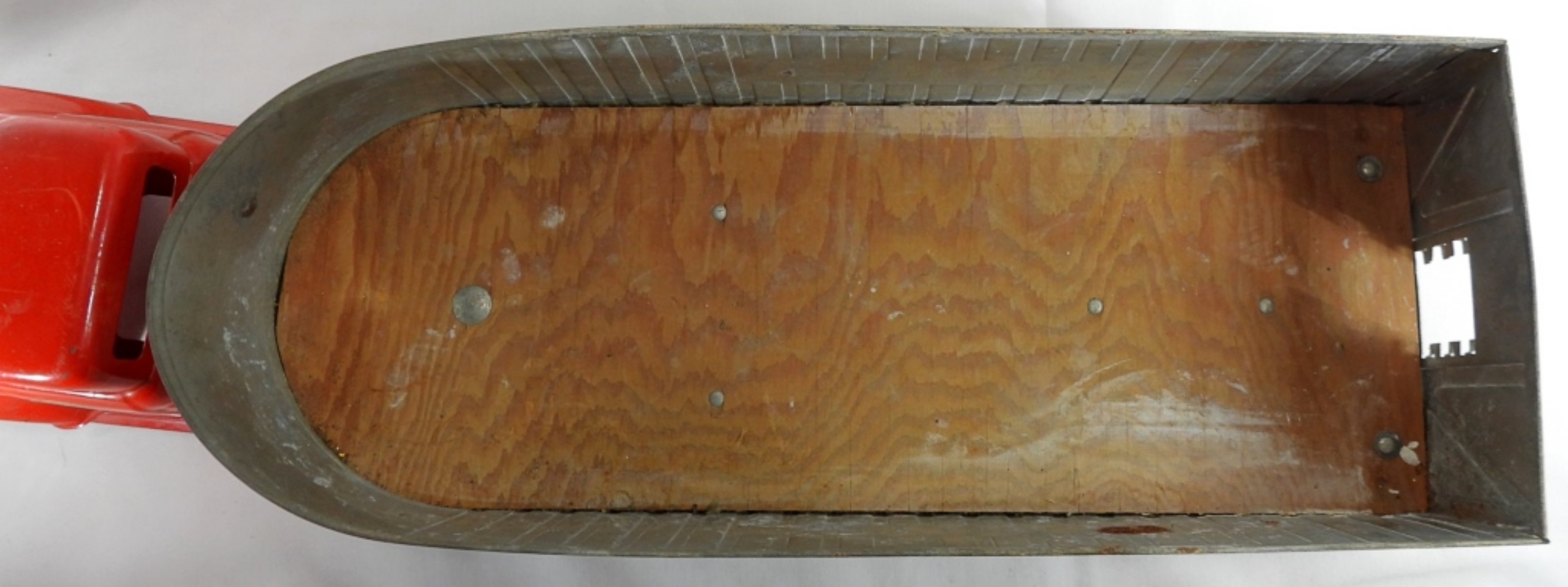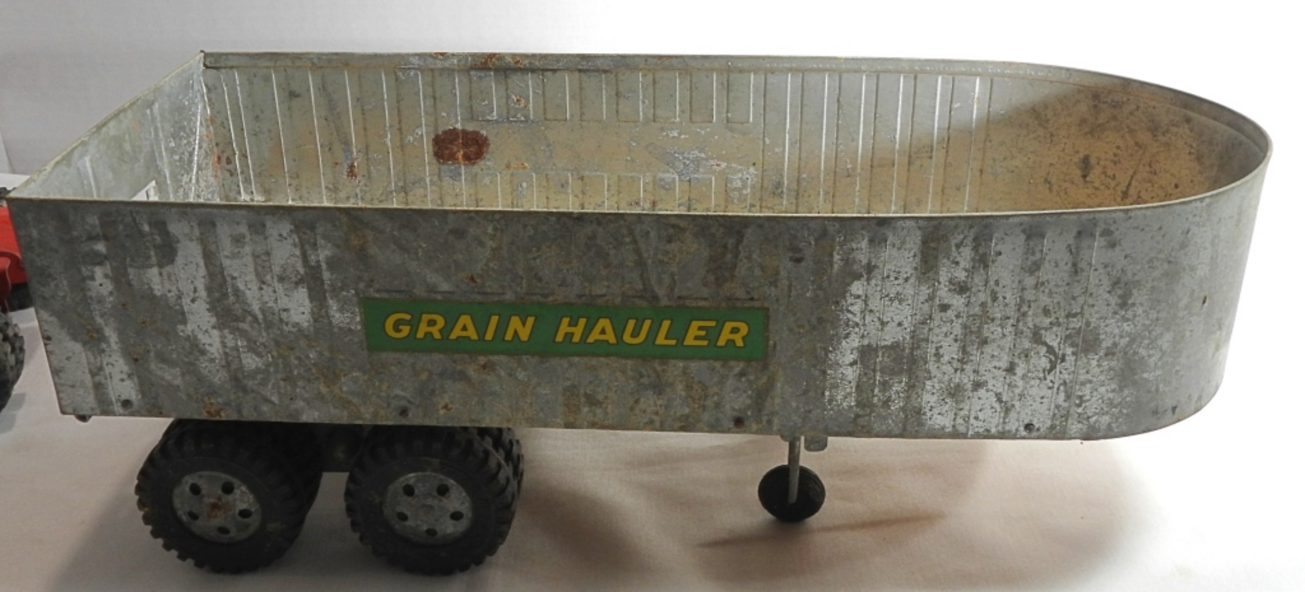 1950s-1960s, pressed steel, grain hauler, dump door is missing, wheels all present and working well, trailer has some rust, cab is in nice shape with minimal paint loss, trailer length measures 16″