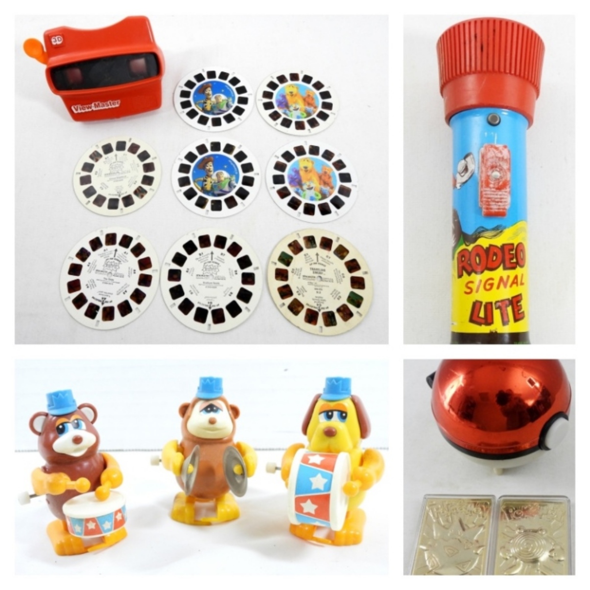 Hipco Rodeo Signal Lite, 3- Tomy wind-up plastic toys (working condition), Pokemon Poliwhirl & Togepi 23k Gold Plated Trading card. Viewfinder with Reels from Rugrats, Toy Story 2, and Bear In The Big Blue House