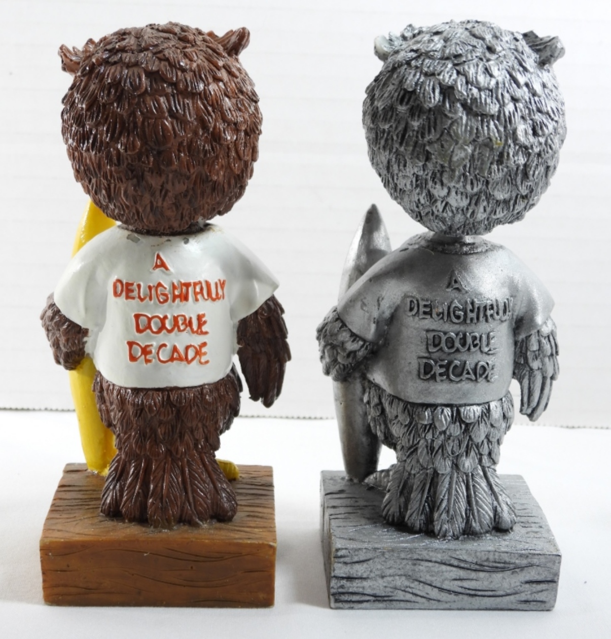 One silver and one regular( left eye is chipped and a little around the neck) 20TH Anniversary 1983-2003. In fair to good condition, preowned.