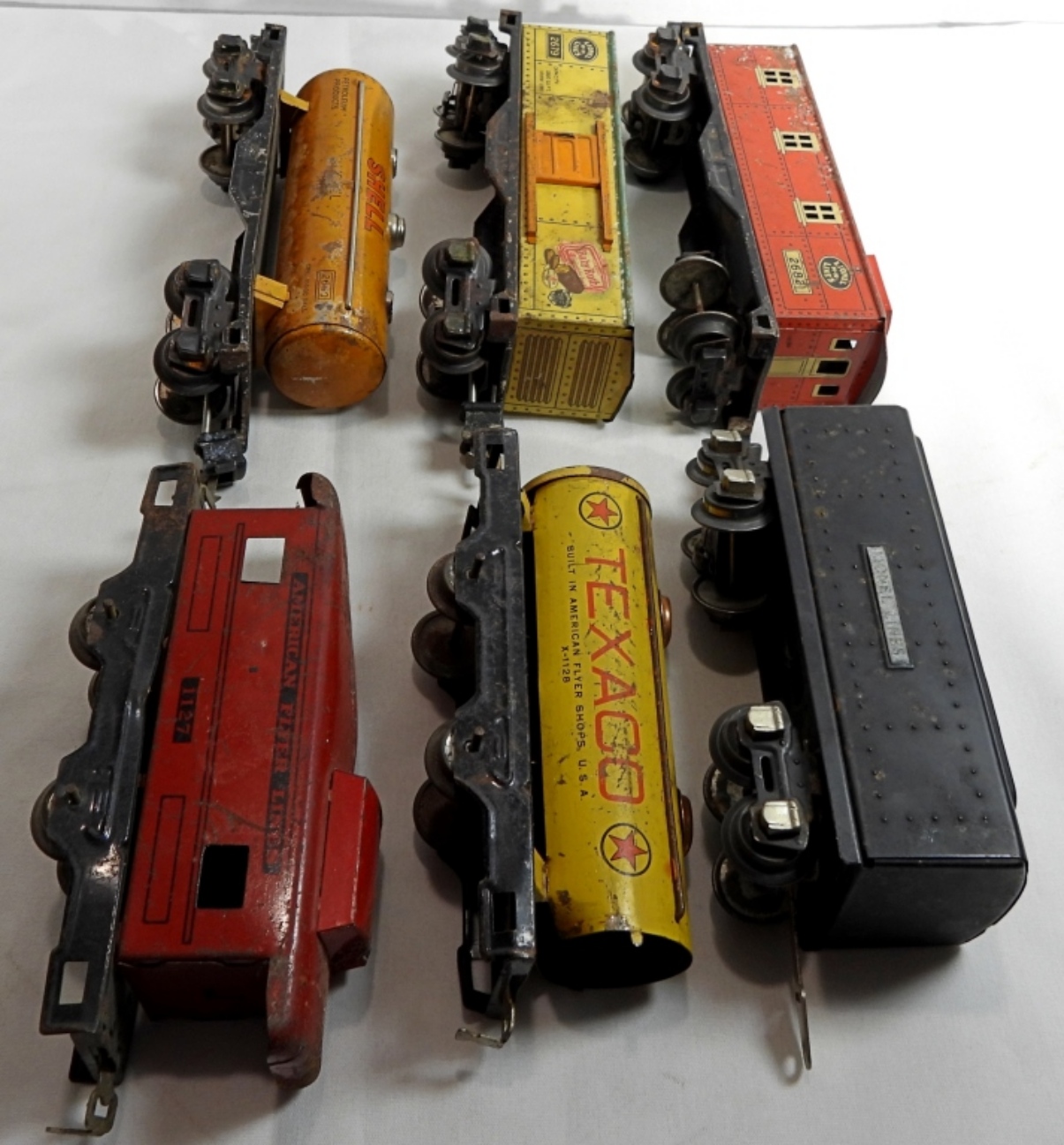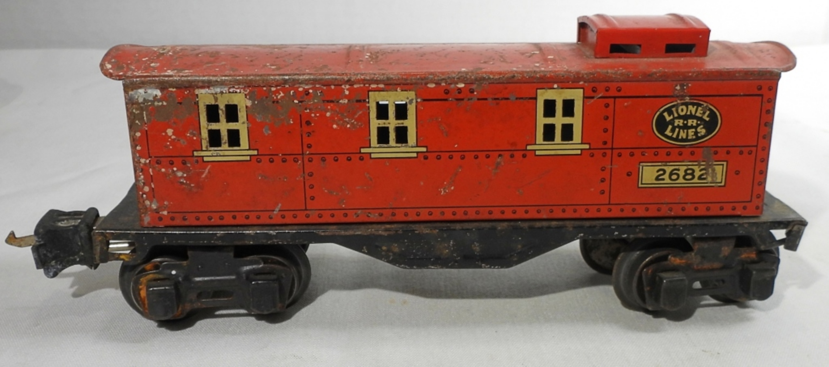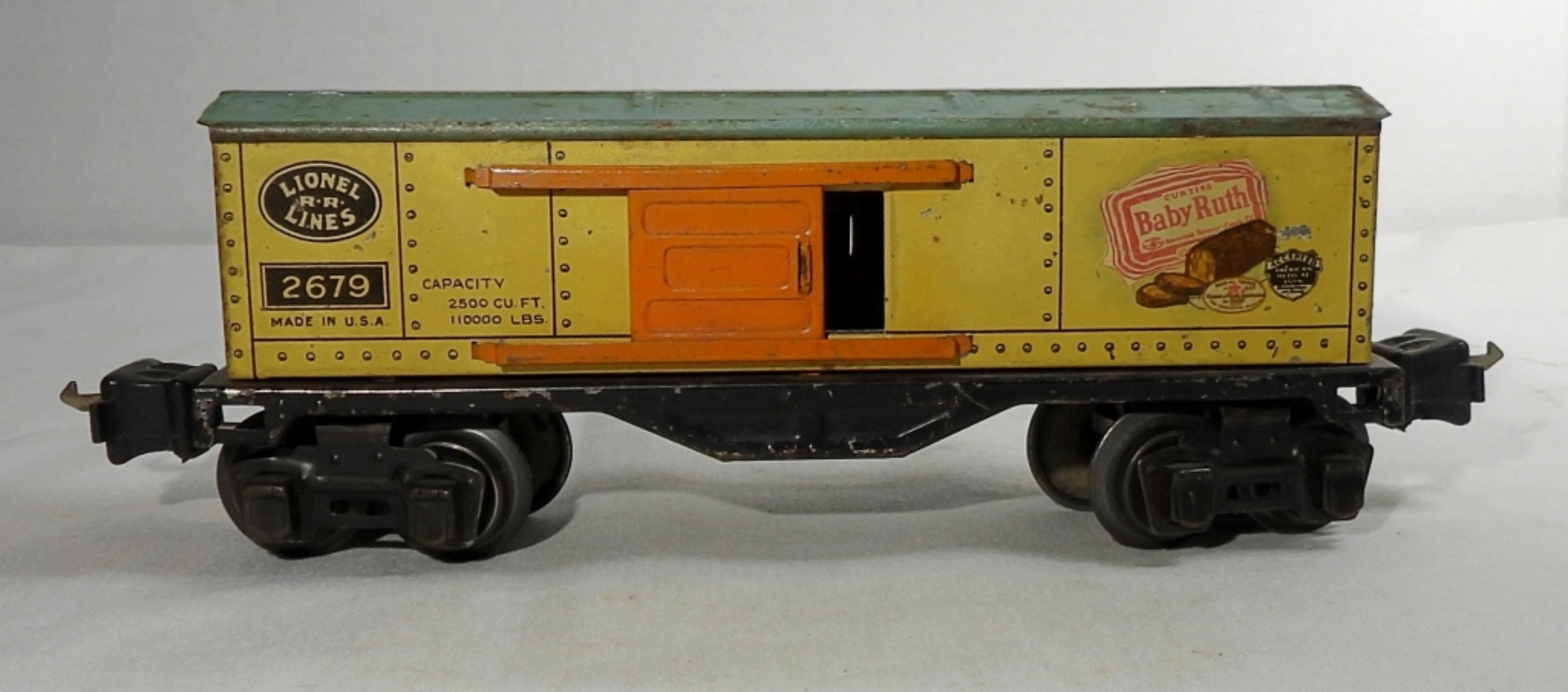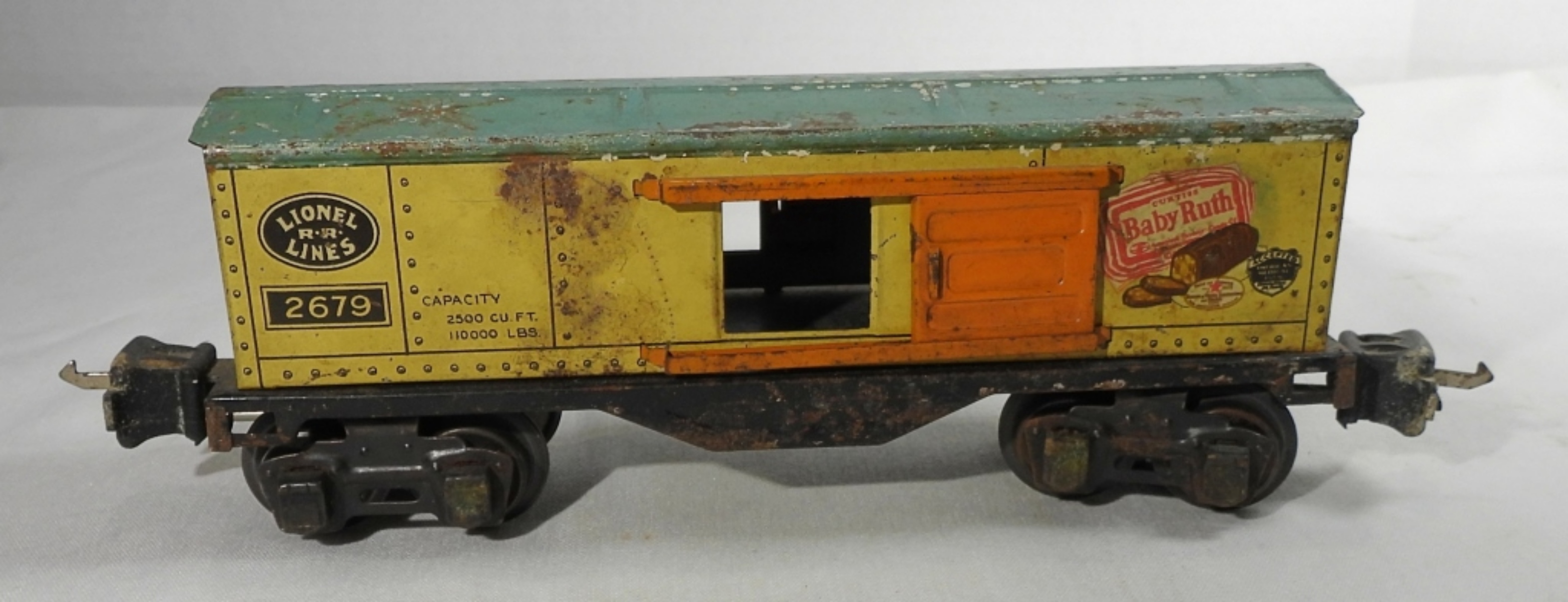 tin pre & post war train cars, Lionel Lines 2679, Baby Ruth cargo car, 10″, all wheels present and working well, some chipped paint and rust, Lionel Lines 2682 caboose, 9″, missing one of the attaching links, rust and
