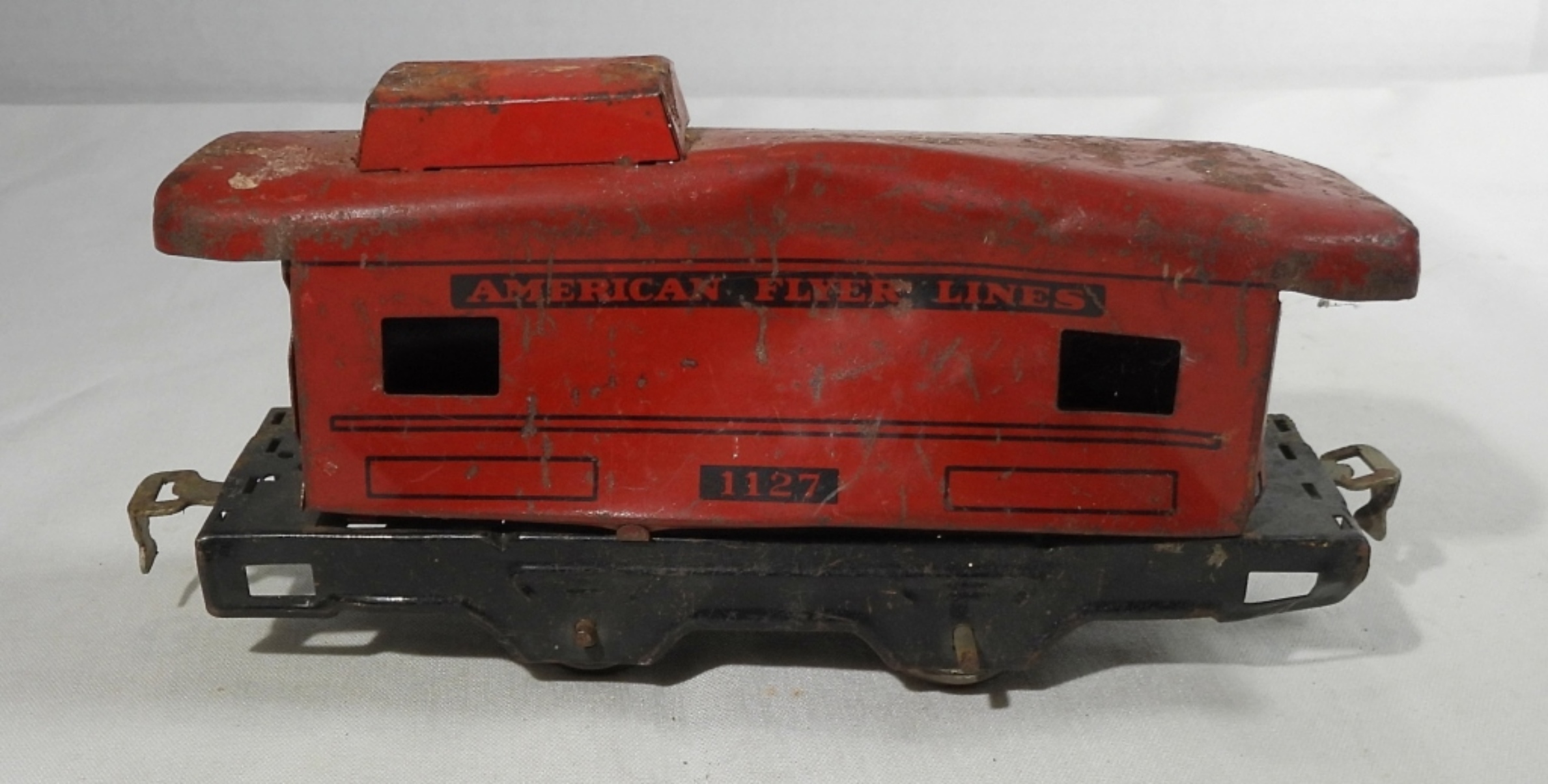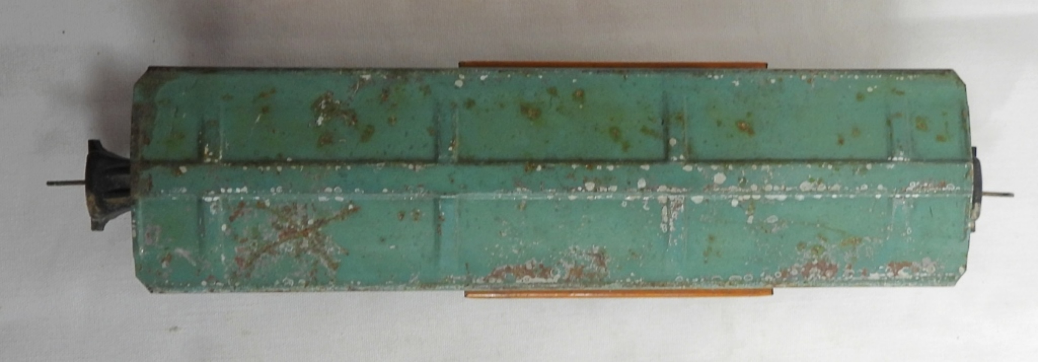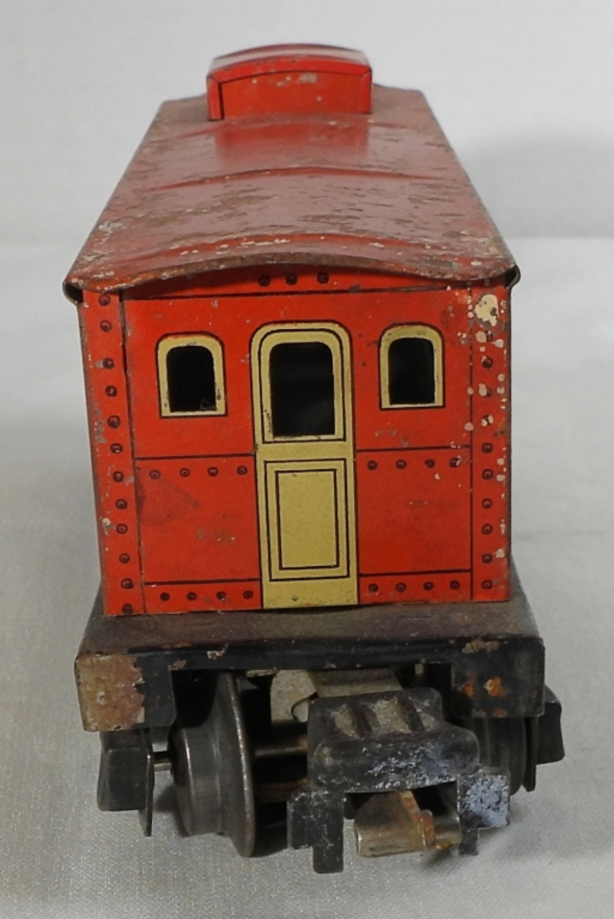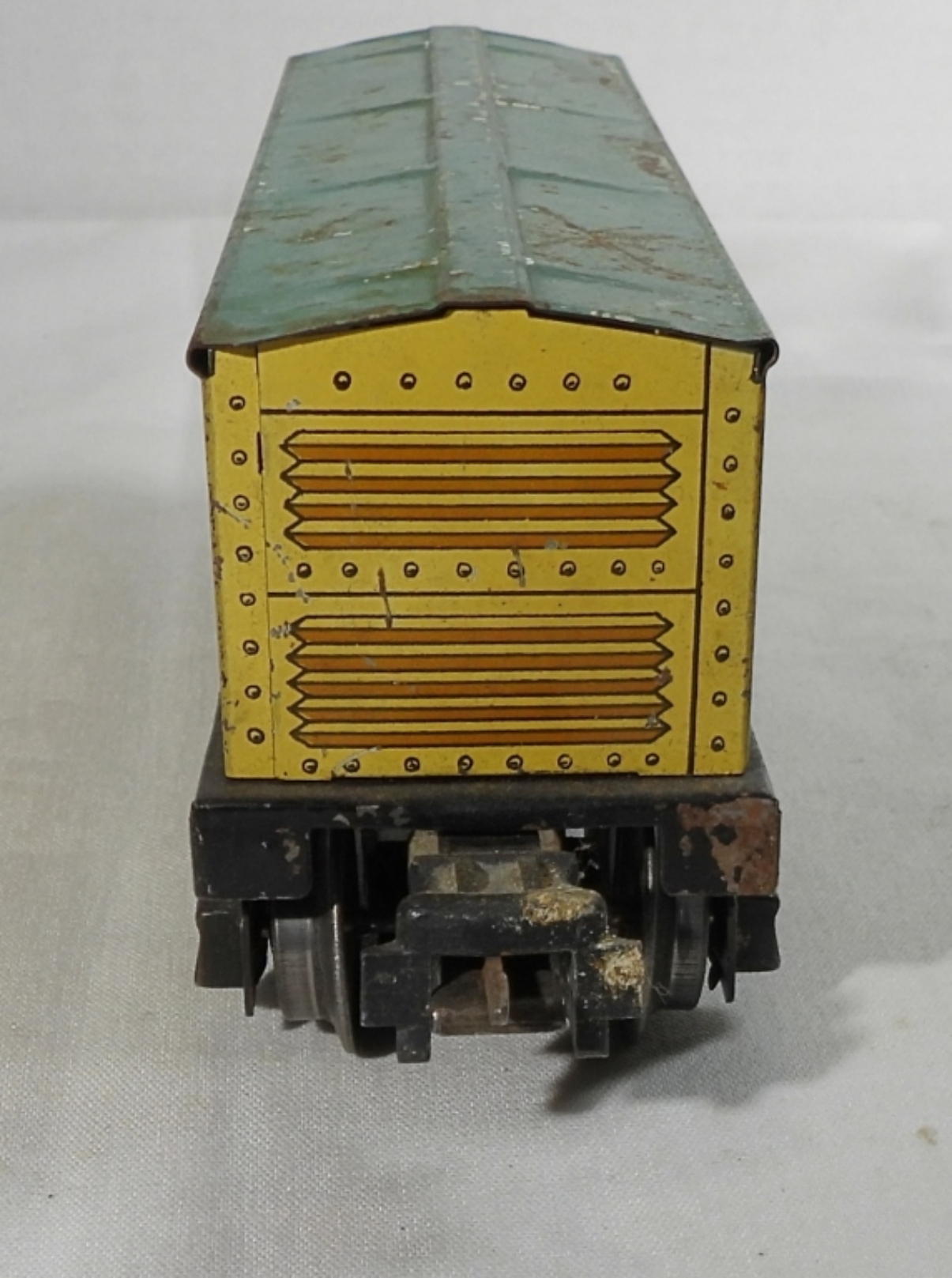 tin pre & post war train cars, Lionel Lines 2679, Baby Ruth cargo car, 10″, all wheels present and working well, some chipped paint and rust, Lionel Lines 2682 caboose, 9″, missing one of the attaching links, rust and