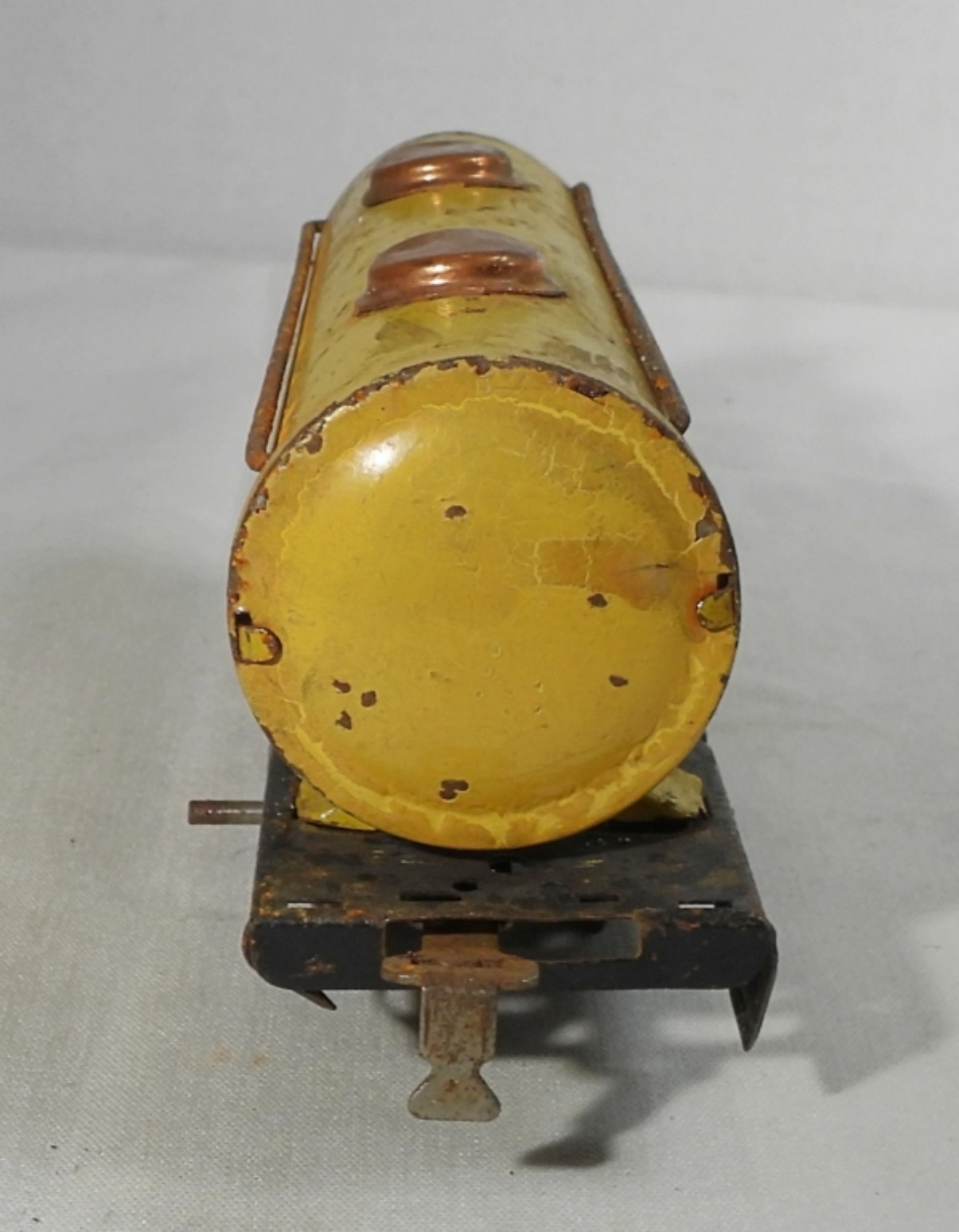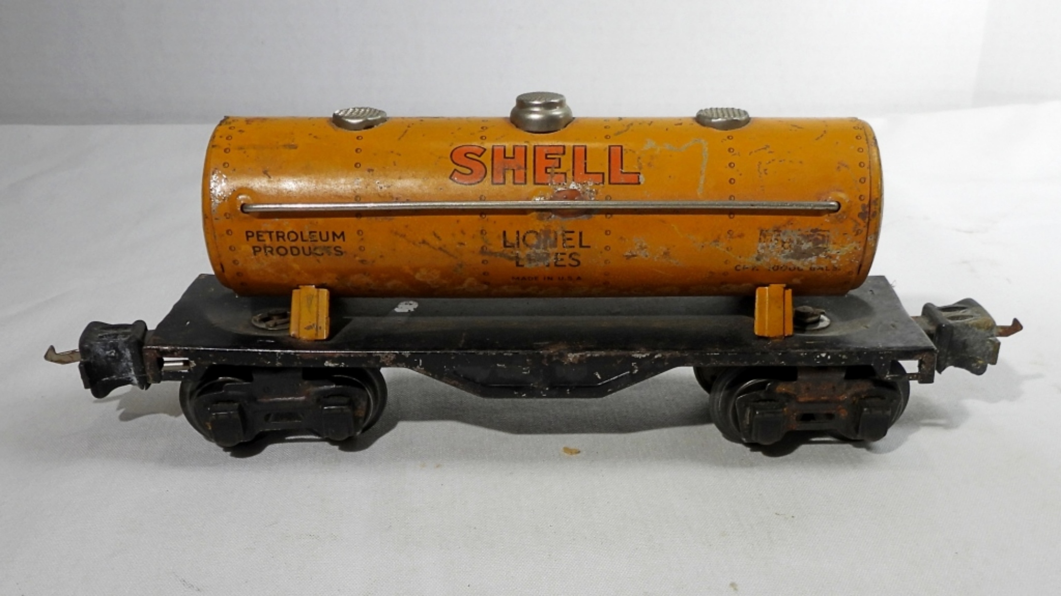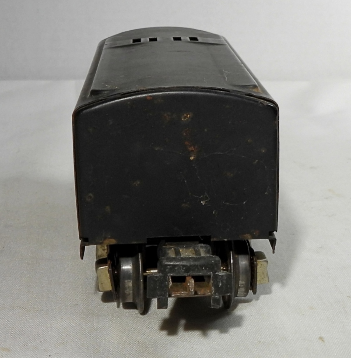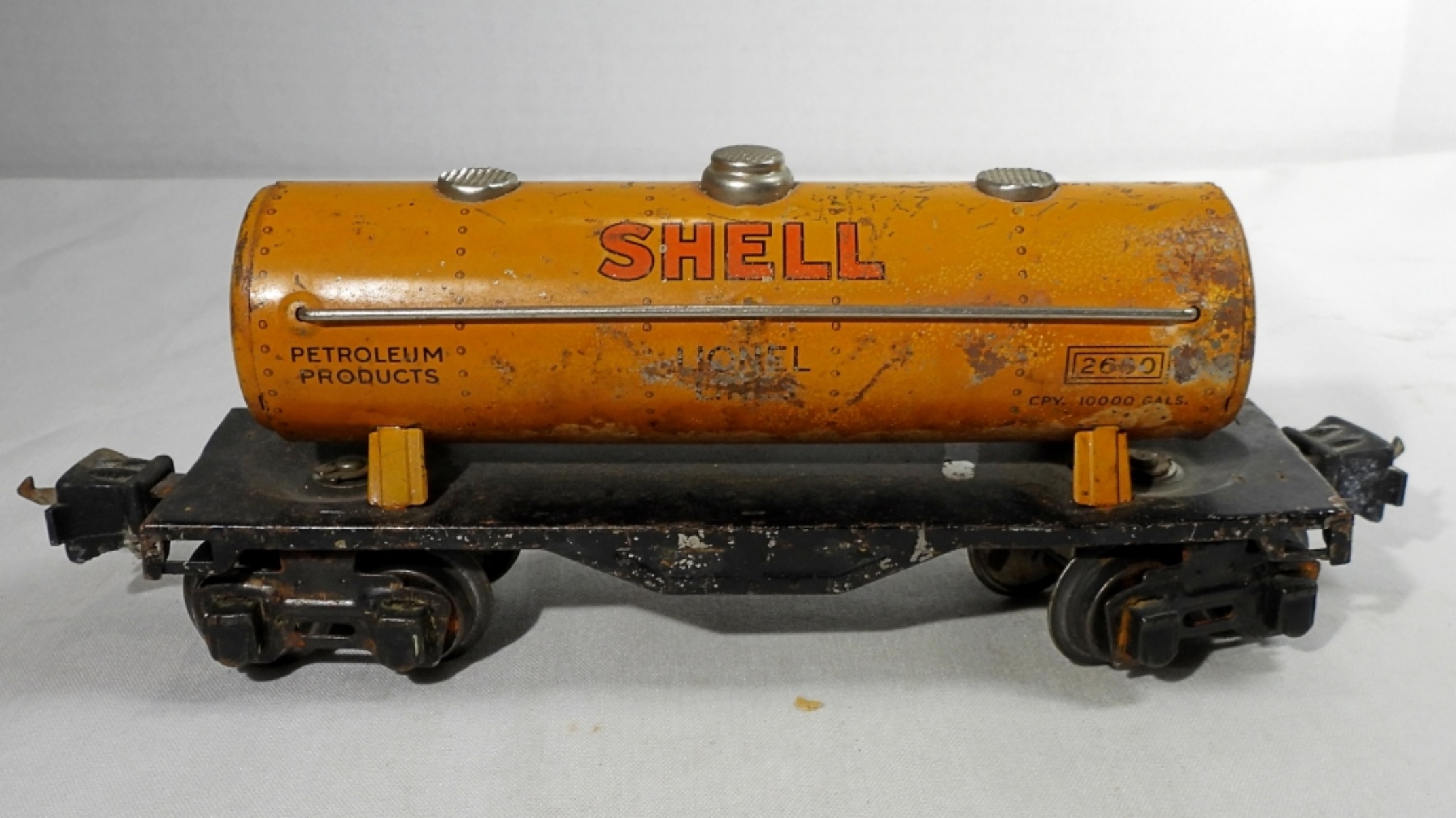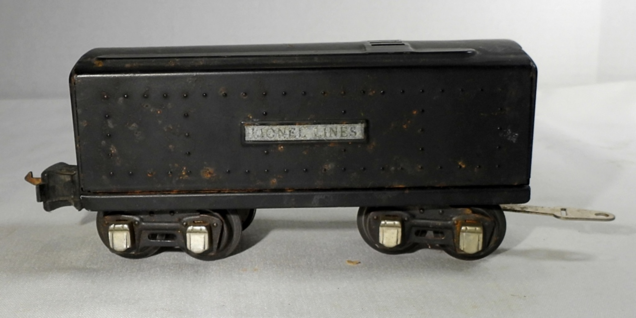 tin pre & post war train cars, Lionel Lines 2679, Baby Ruth cargo car, 10″, all wheels present and working well, some chipped paint and rust, Lionel Lines 2682 caboose, 9″, missing one of the attaching links, rust and