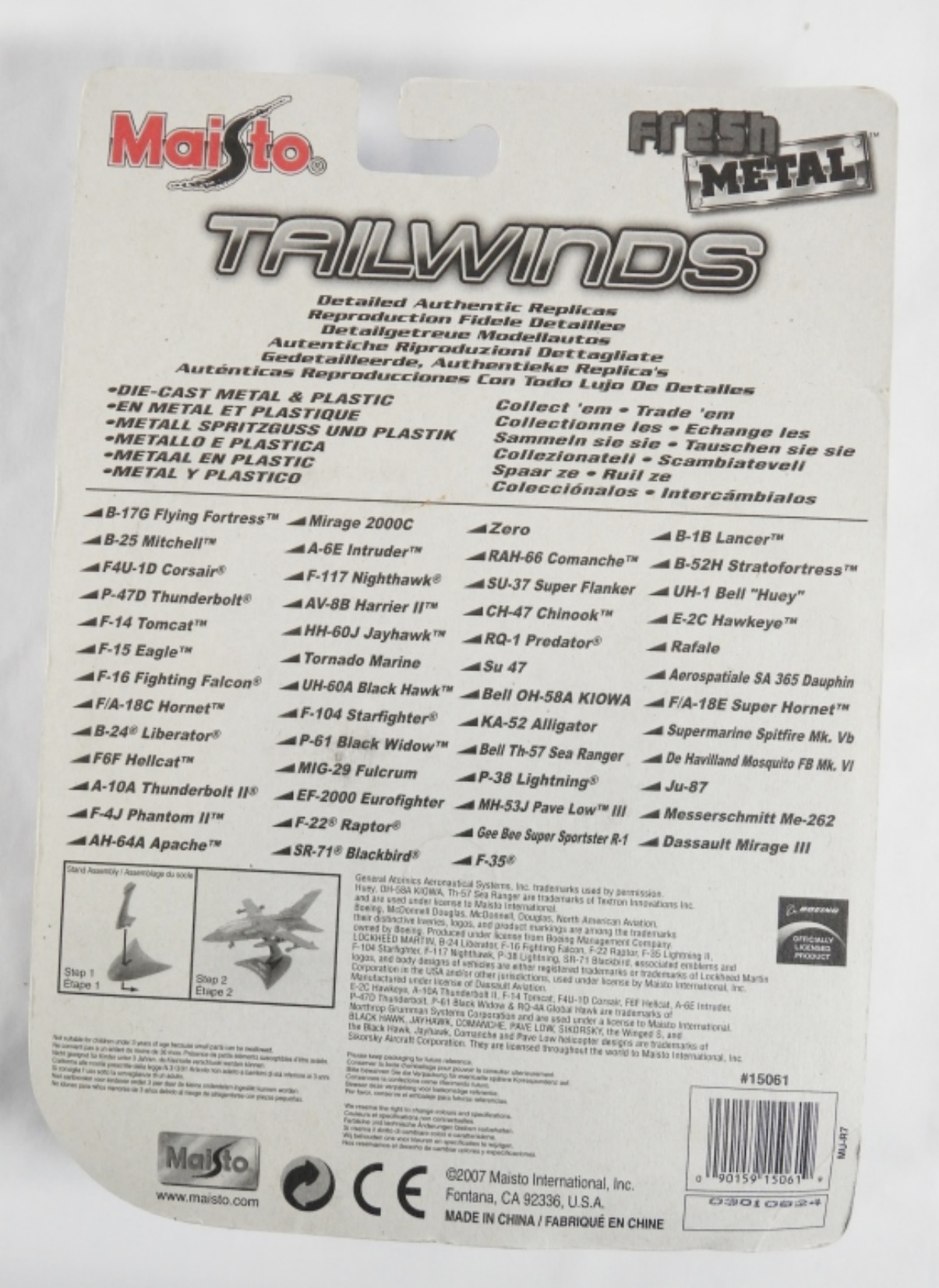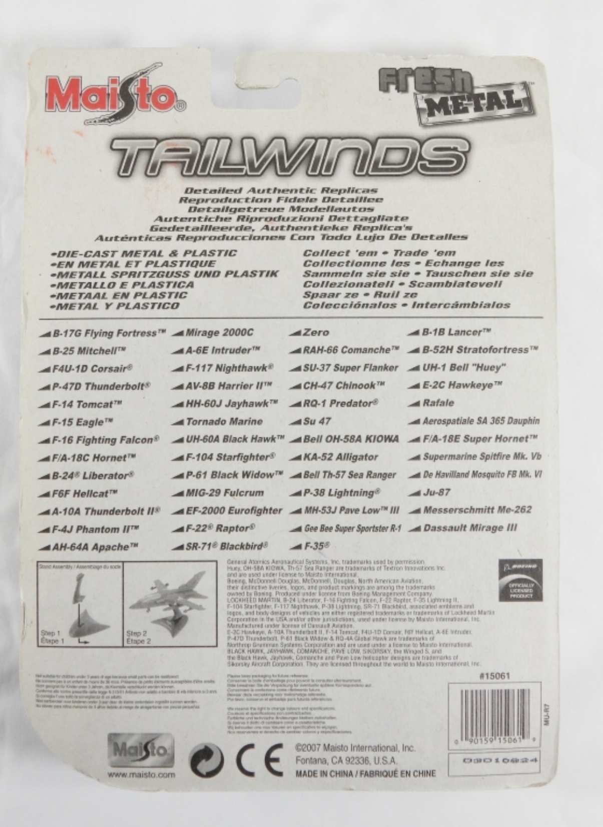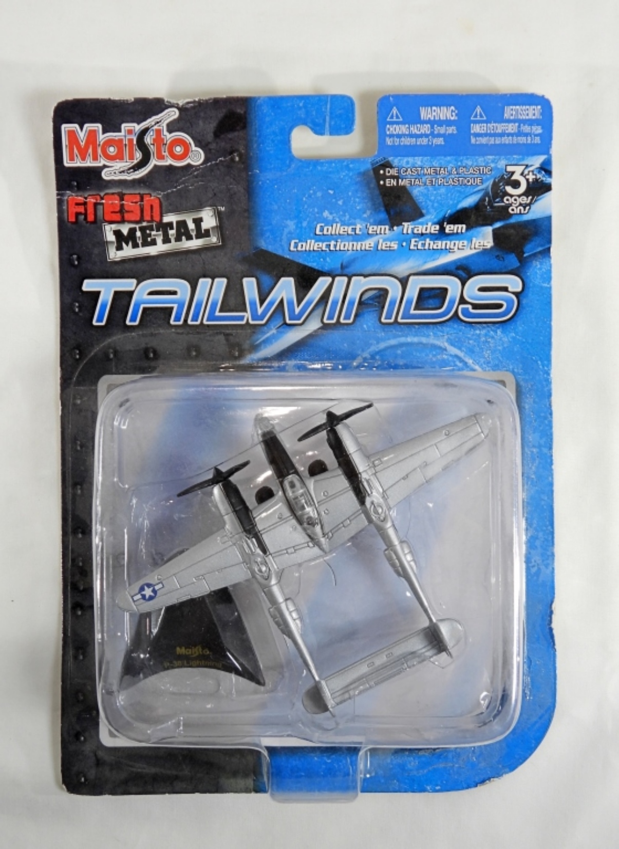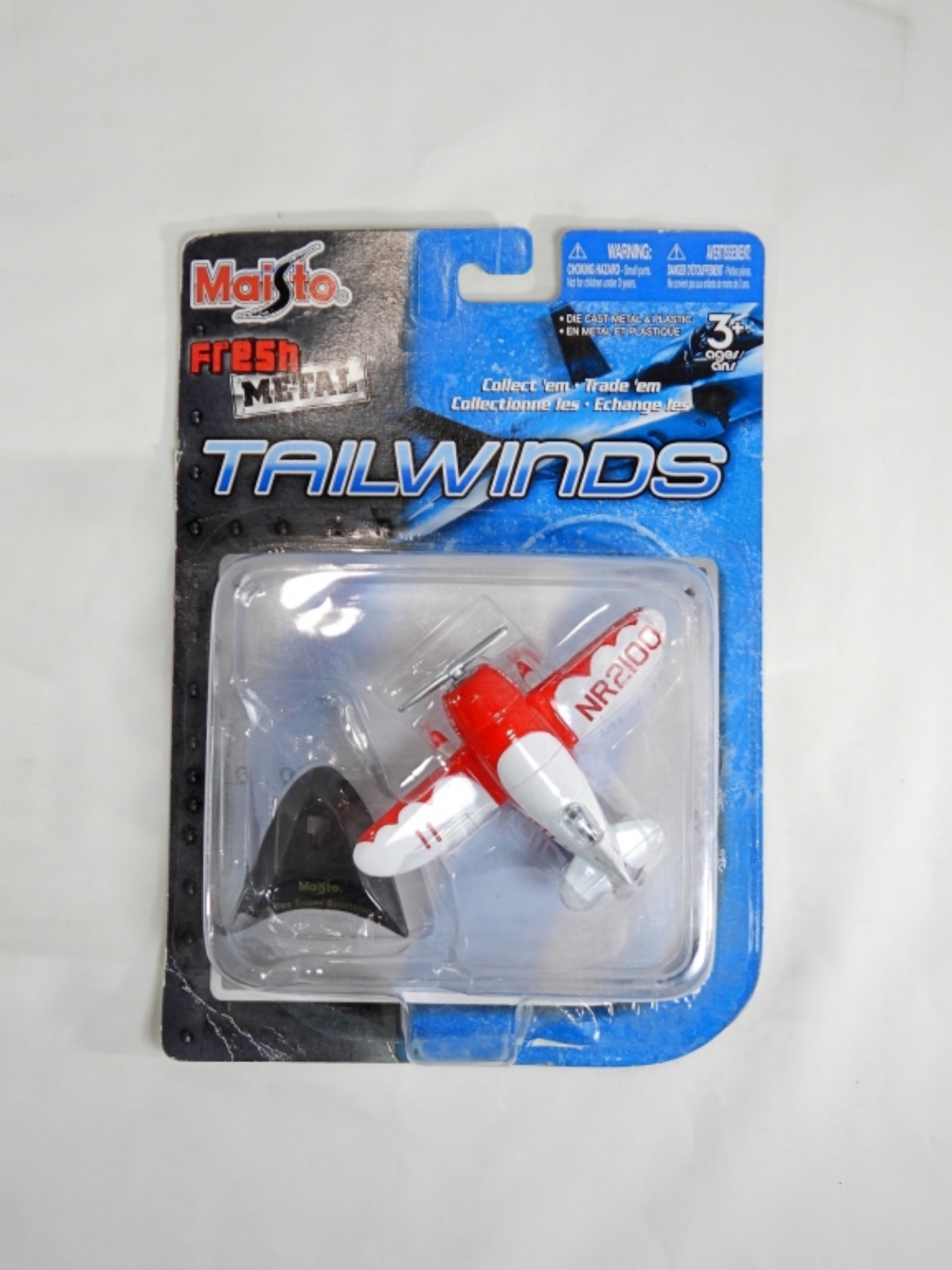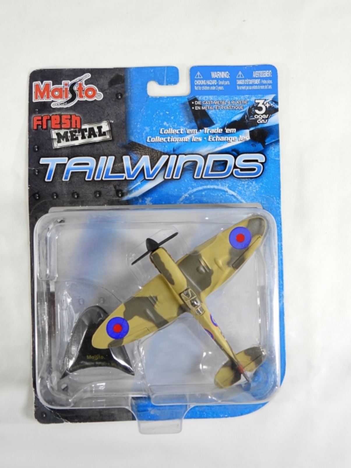 3 Tailwinds planes, The 1st plane is a Gee Bee Super Sportster R-1 (red and white). The box is in fair condition, and the plastic seal on the bottom is starting to come up. The 2nd plane is a P-38 Lightning (black and silver). The box is in fair condition, and the plastic seal on the bottom is starting to come up. The 3rd plane is a Supermarine Spitfire Mk. Vb (brown and green). The box is in fair condition.