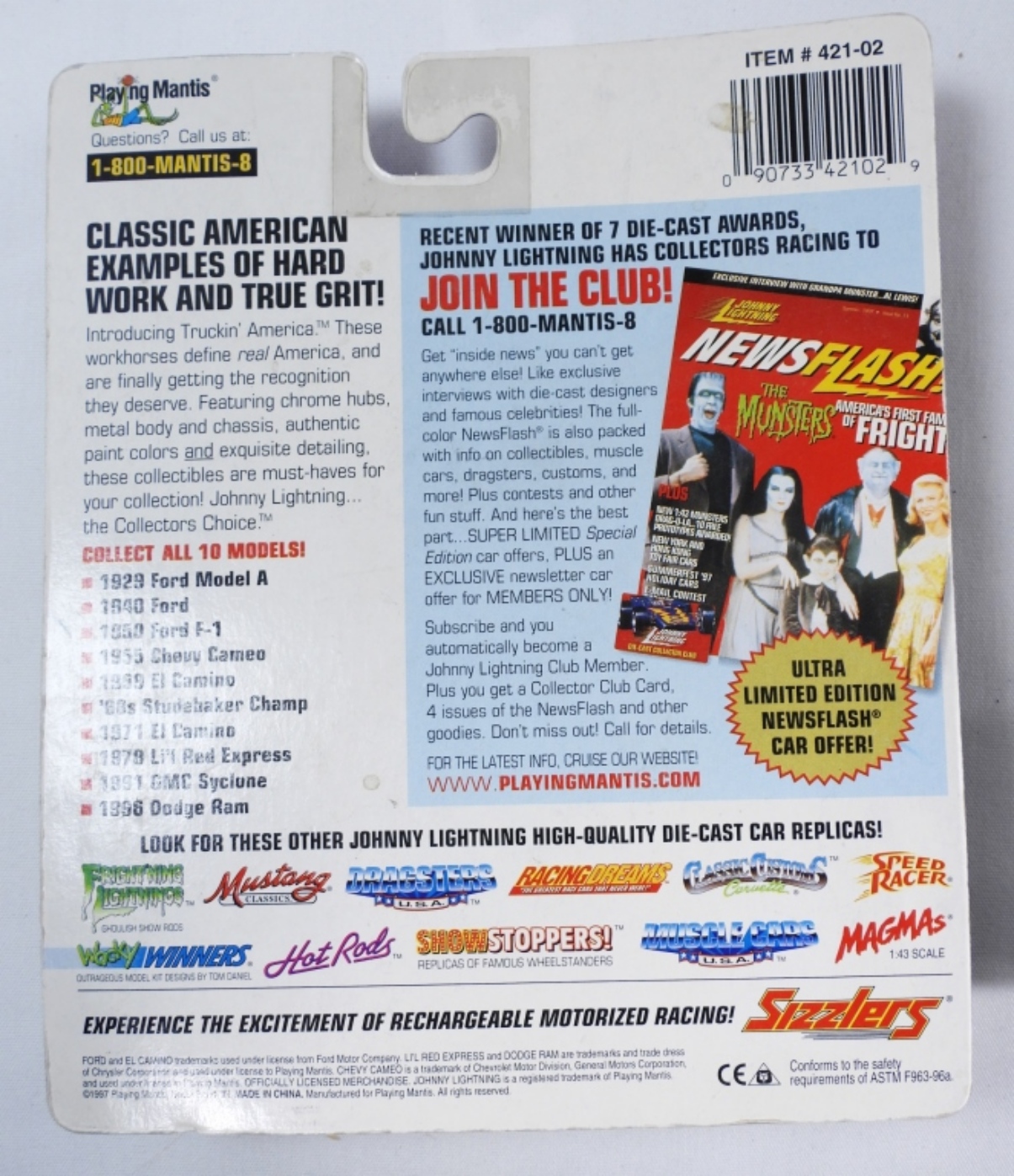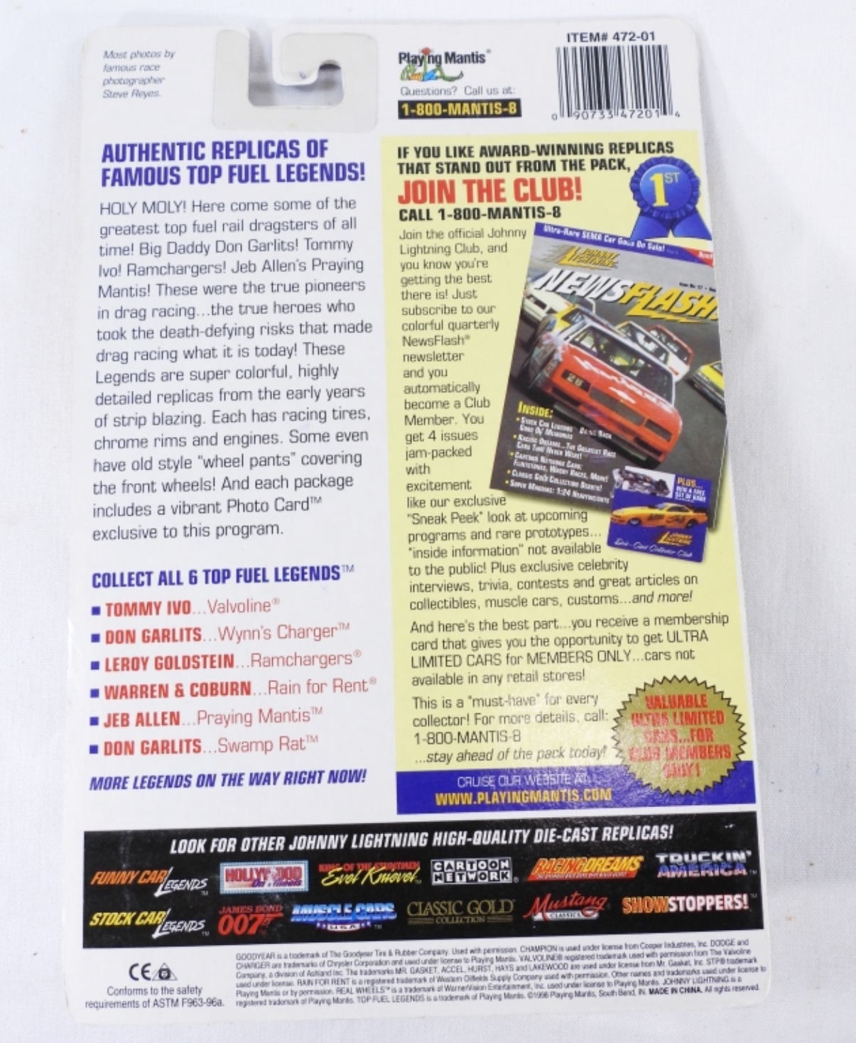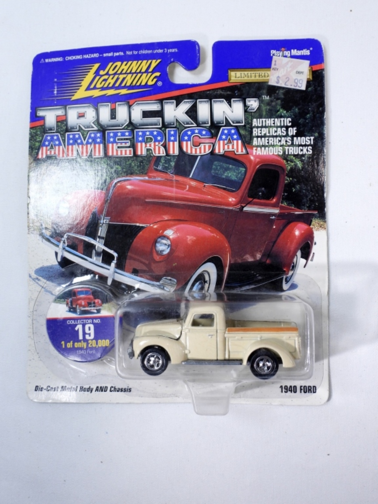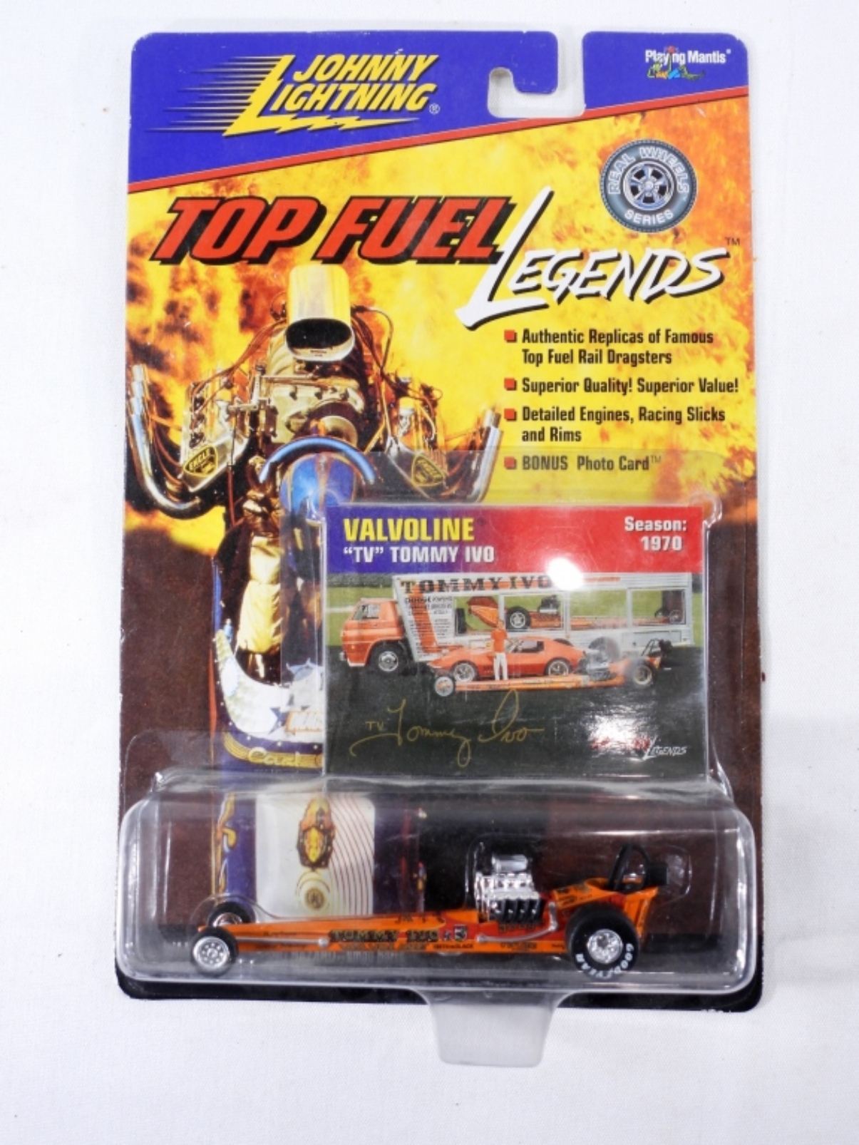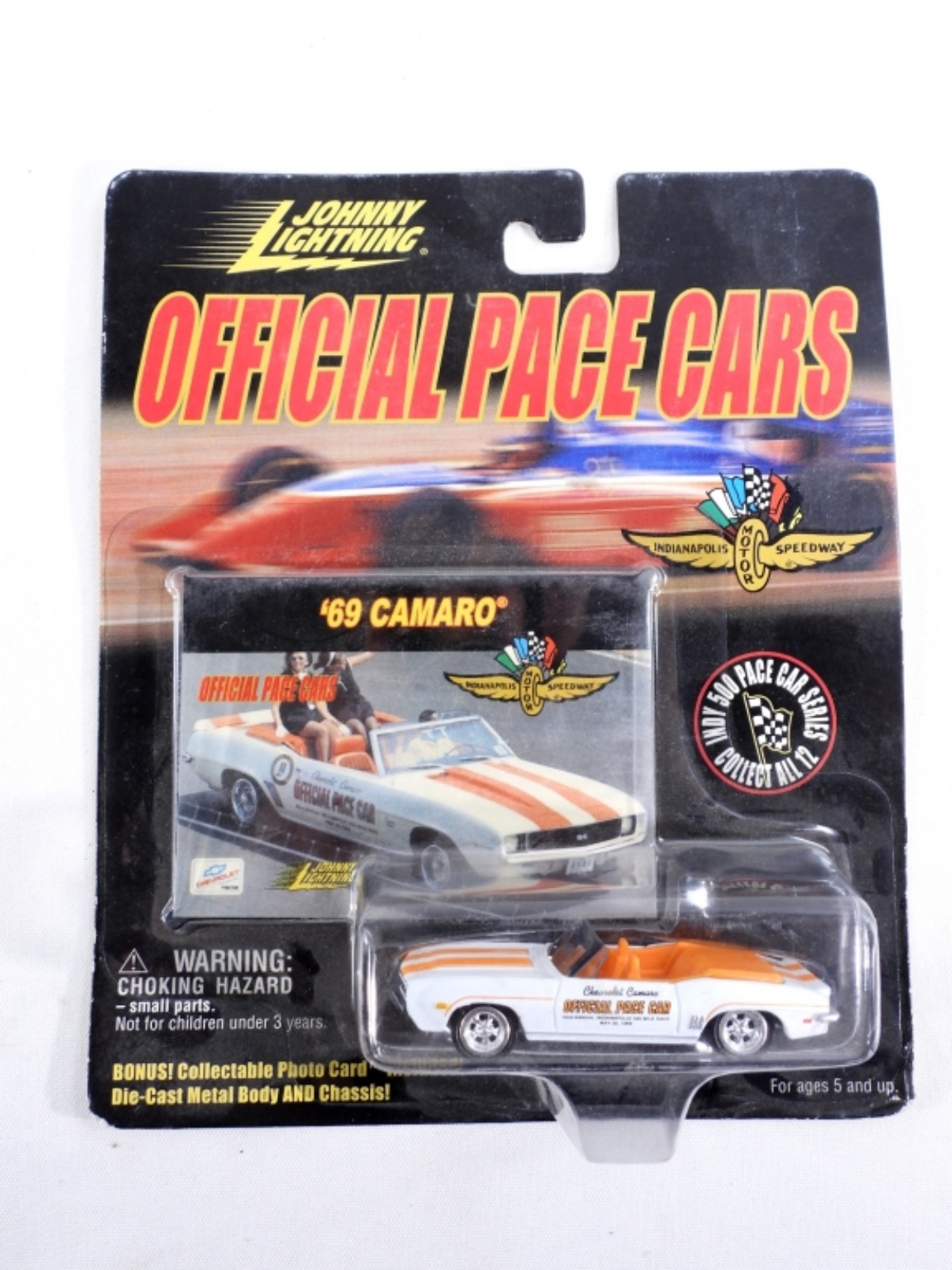3 Johnny Lightning Collectors Cars. First car is a ’69 Camaro Official Pace Cars made in 1999 (box is in good condition). Second car is A Trucking’ America 1940 Ford made In 1997 (the box is in good condition). Third car is a Top Fuel Legends Valvoline “TV’. Pre Owned.