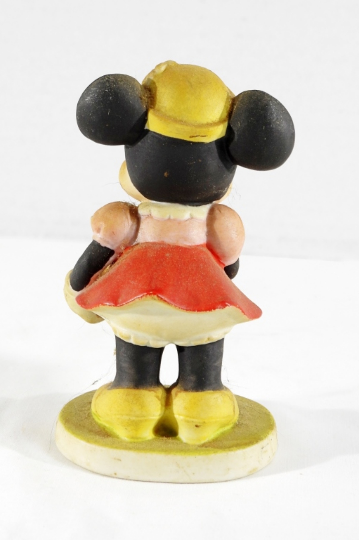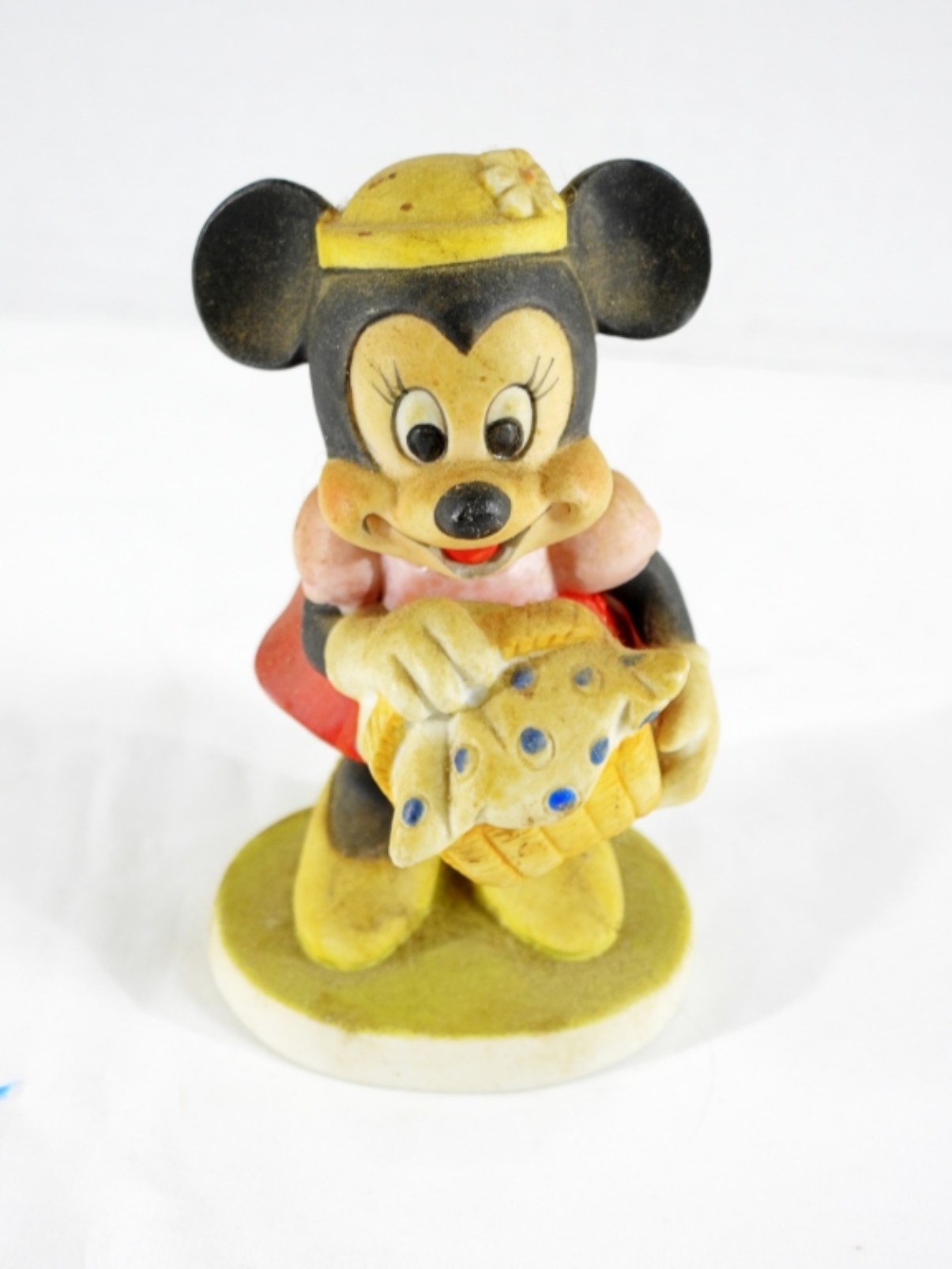 A Vintage Minnie Mouse porcelain figurine, Minnie is carrying a picnic basket. It’s in good condition, just dusty; it can be cleaned up.