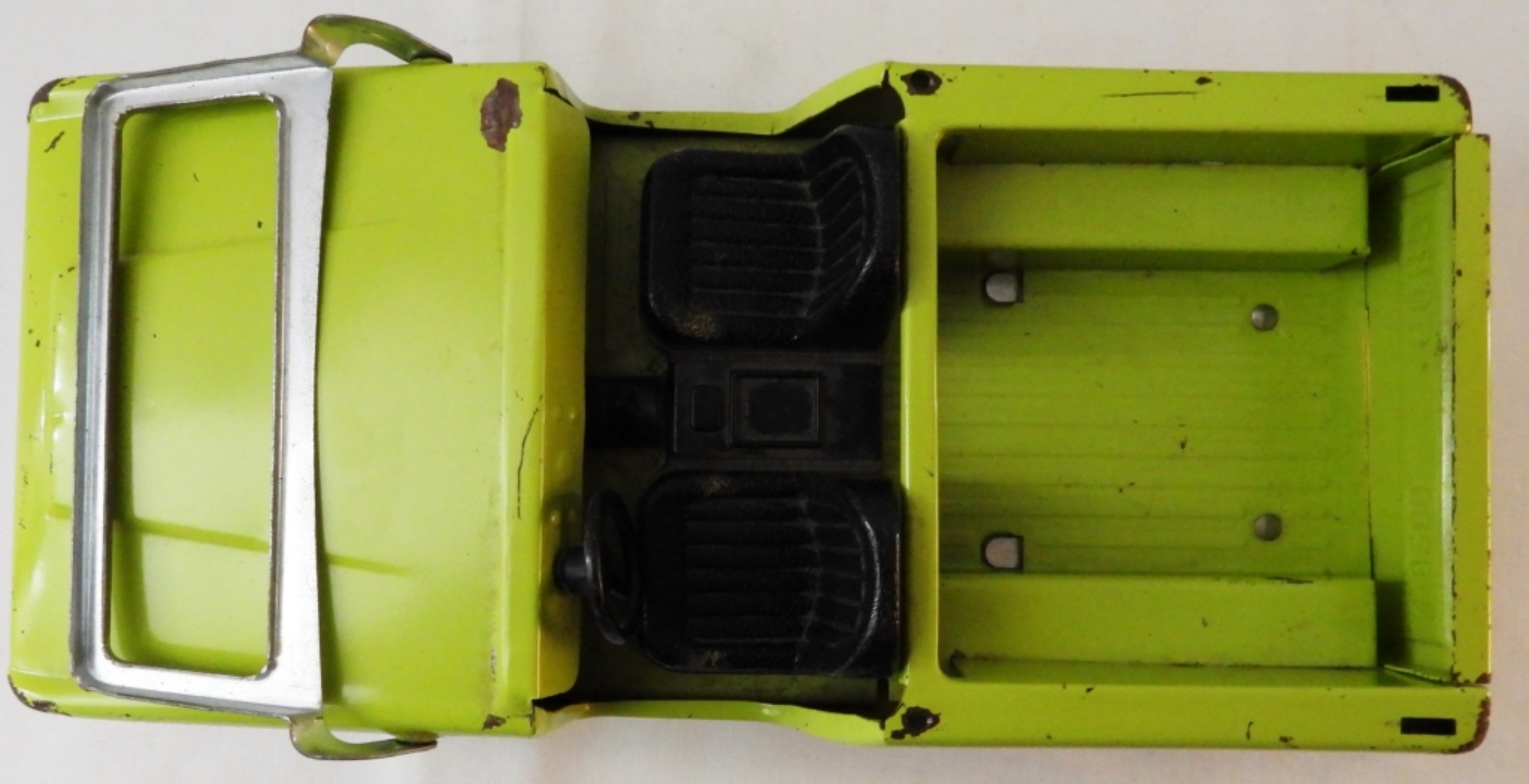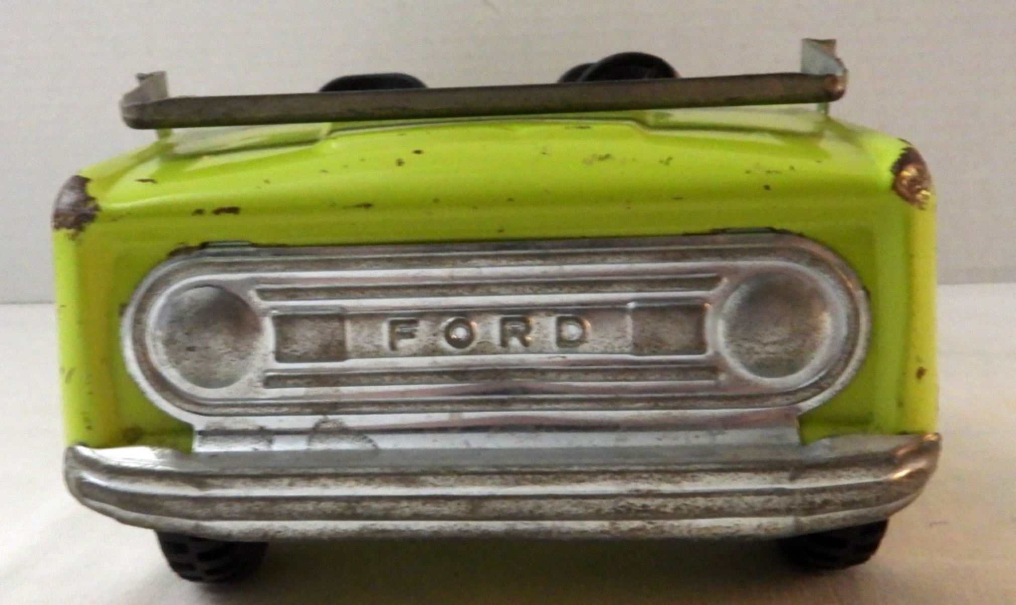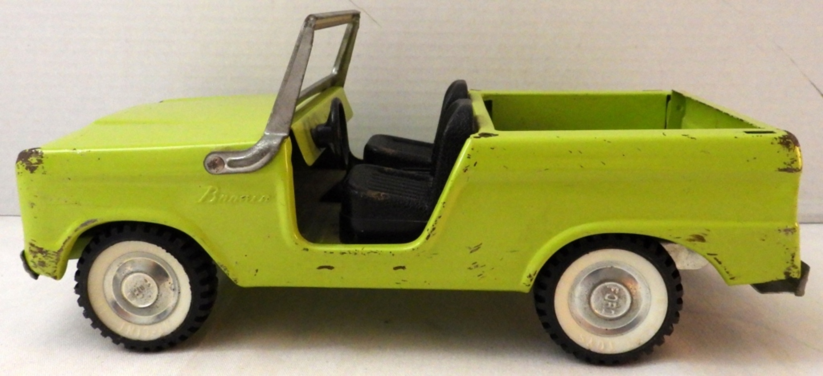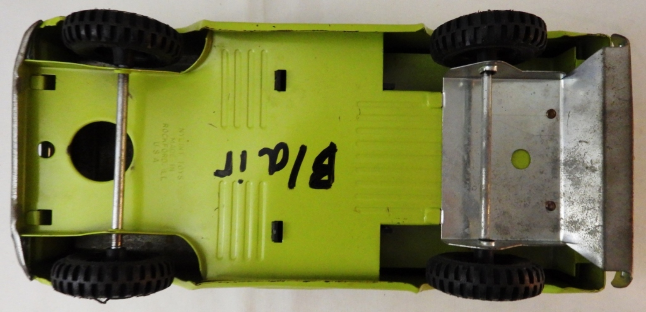 Good condition, movable wheels, name in black on the underside, missing paint and minor rust, 11″ x 5″ x 3.5″