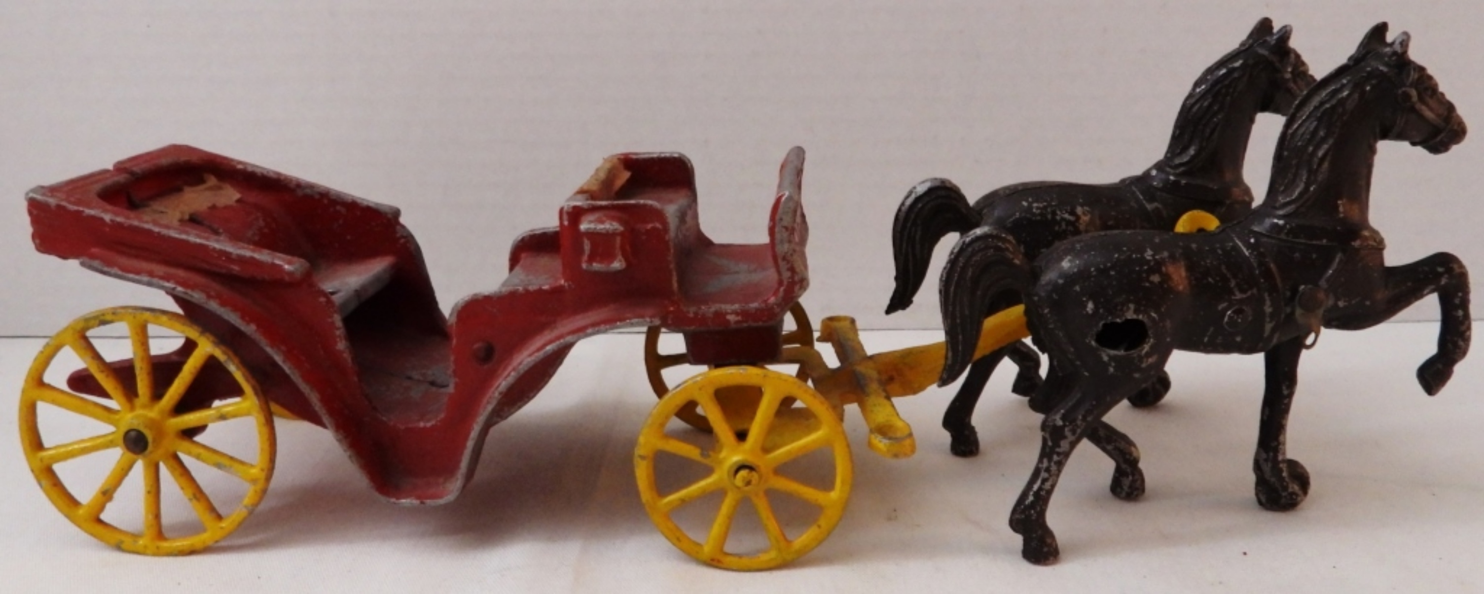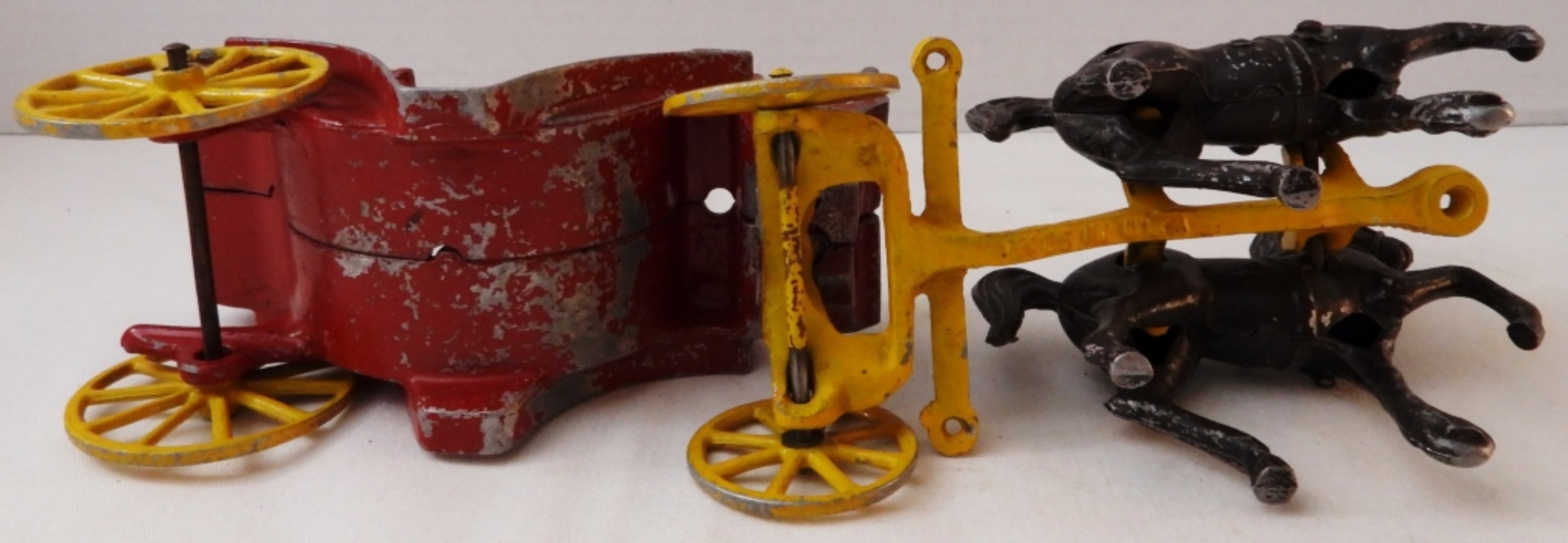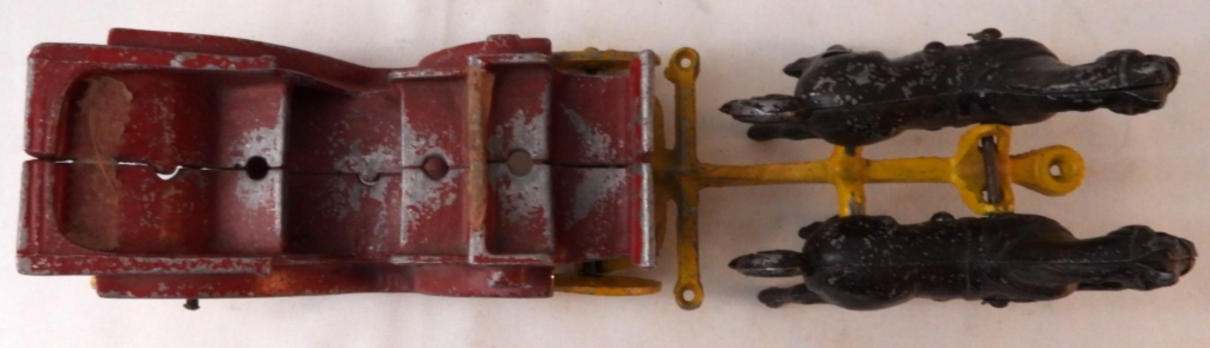 Vintage 1930s-40s, red carriage and yellow with 2 dark brown horses, 11.5″ from horse to end of carriage