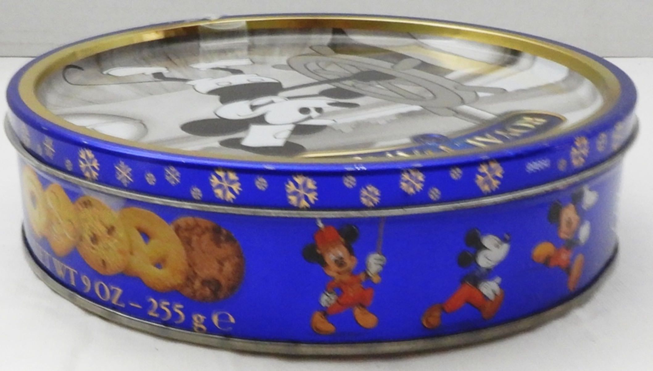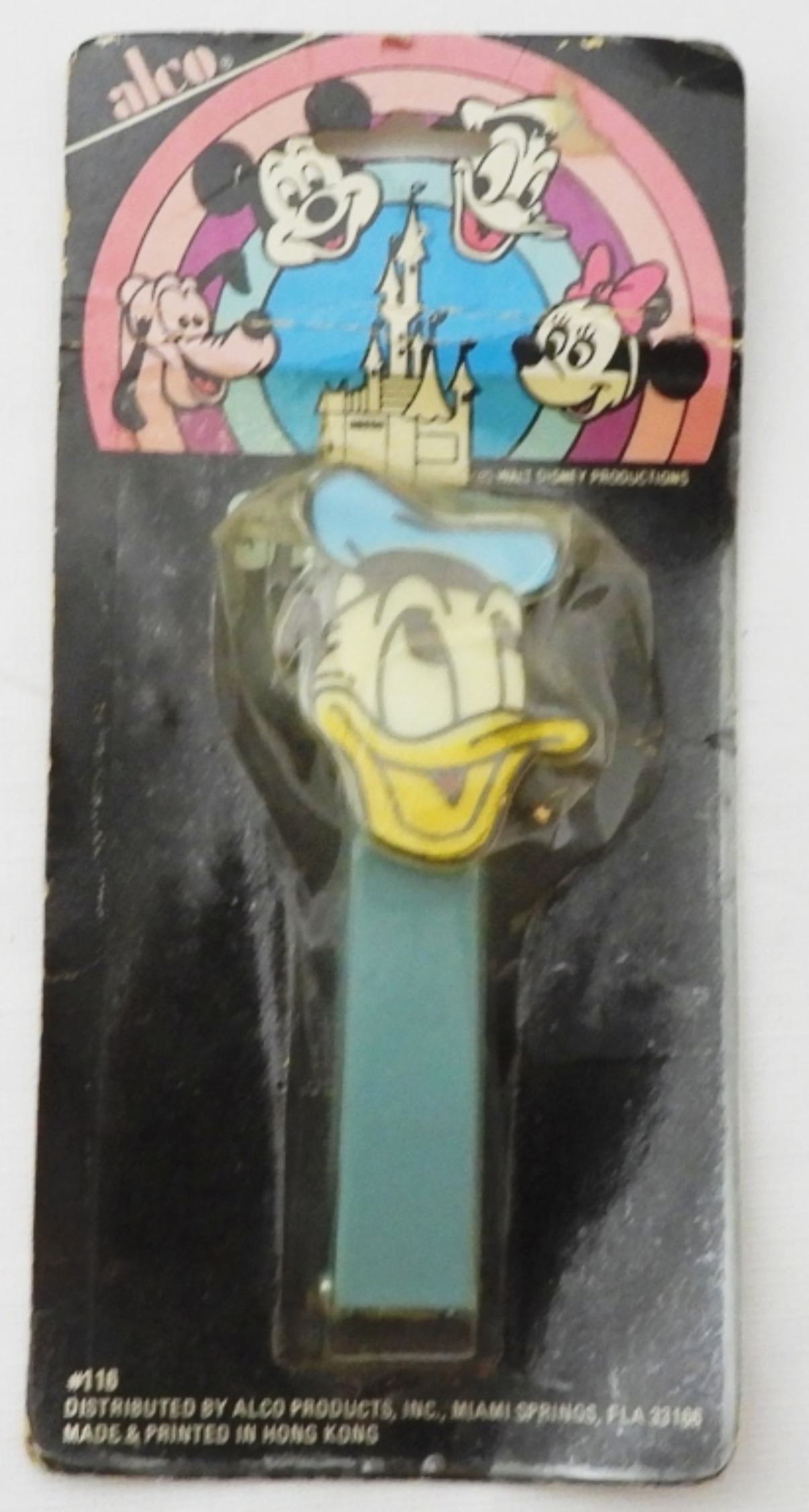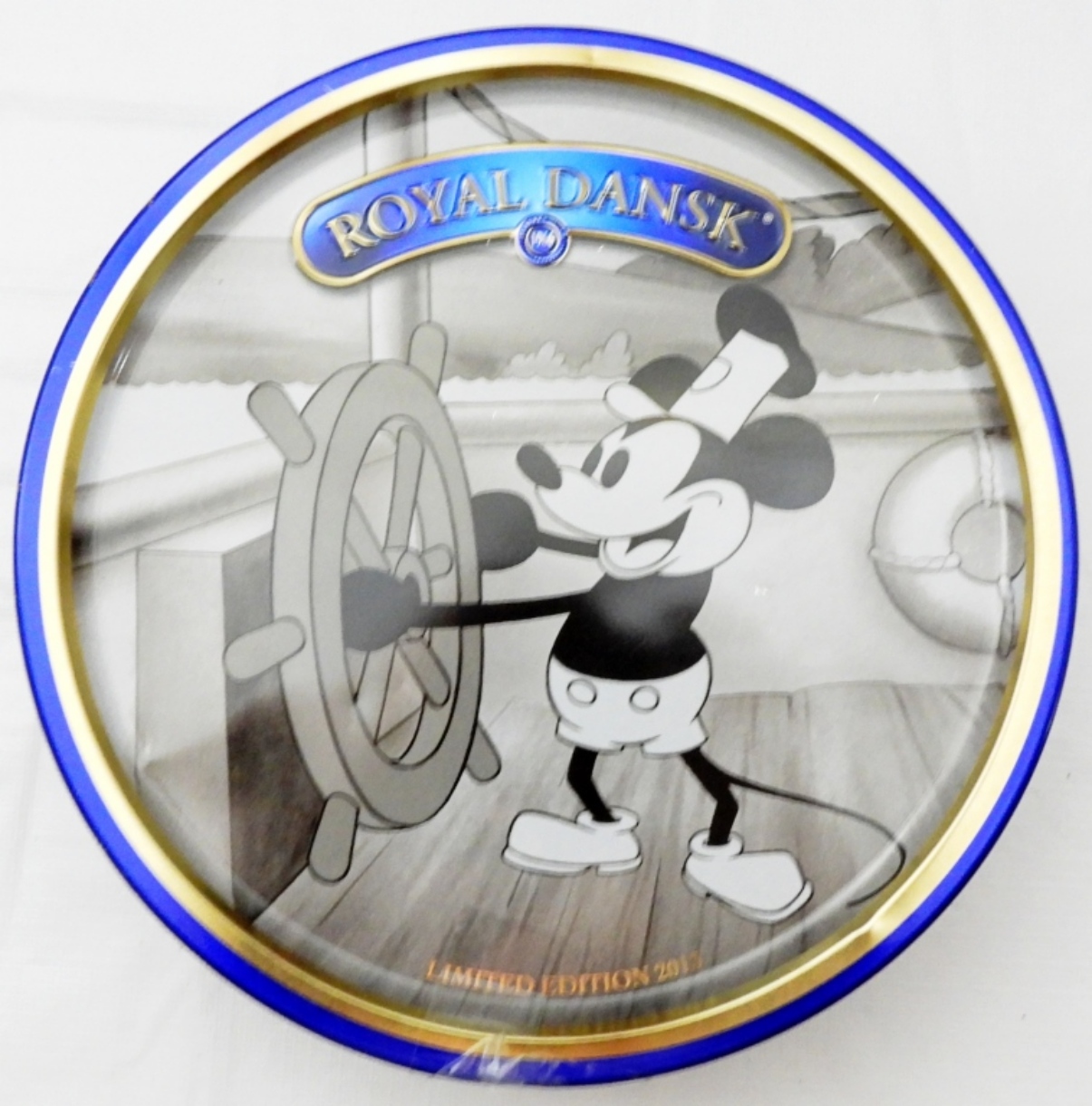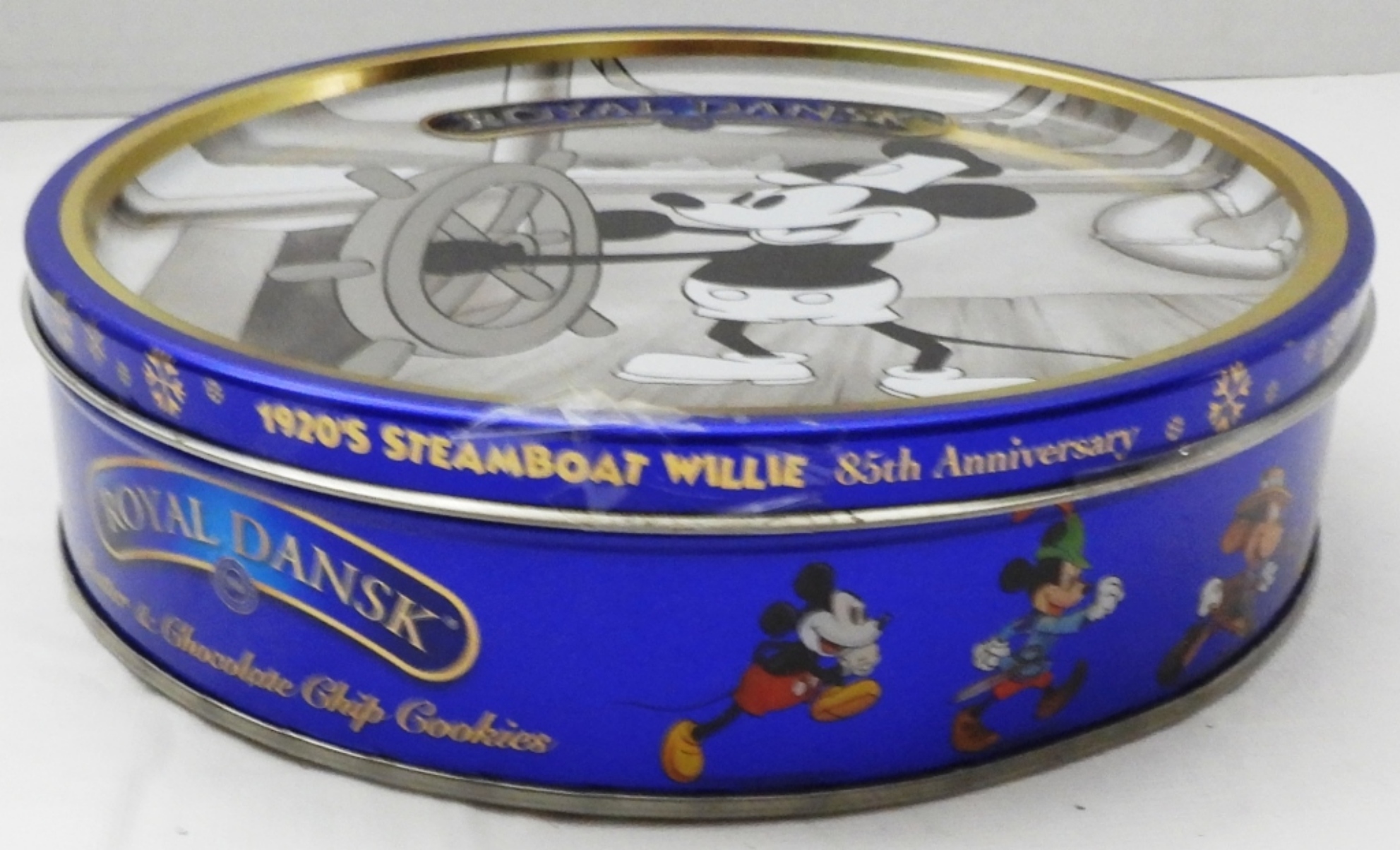 Vintage 1930s Whiting & Davis Co., Donald Duck Stapler sealed in packaging, and Royal Dansk Mickey Mouse cookie tin